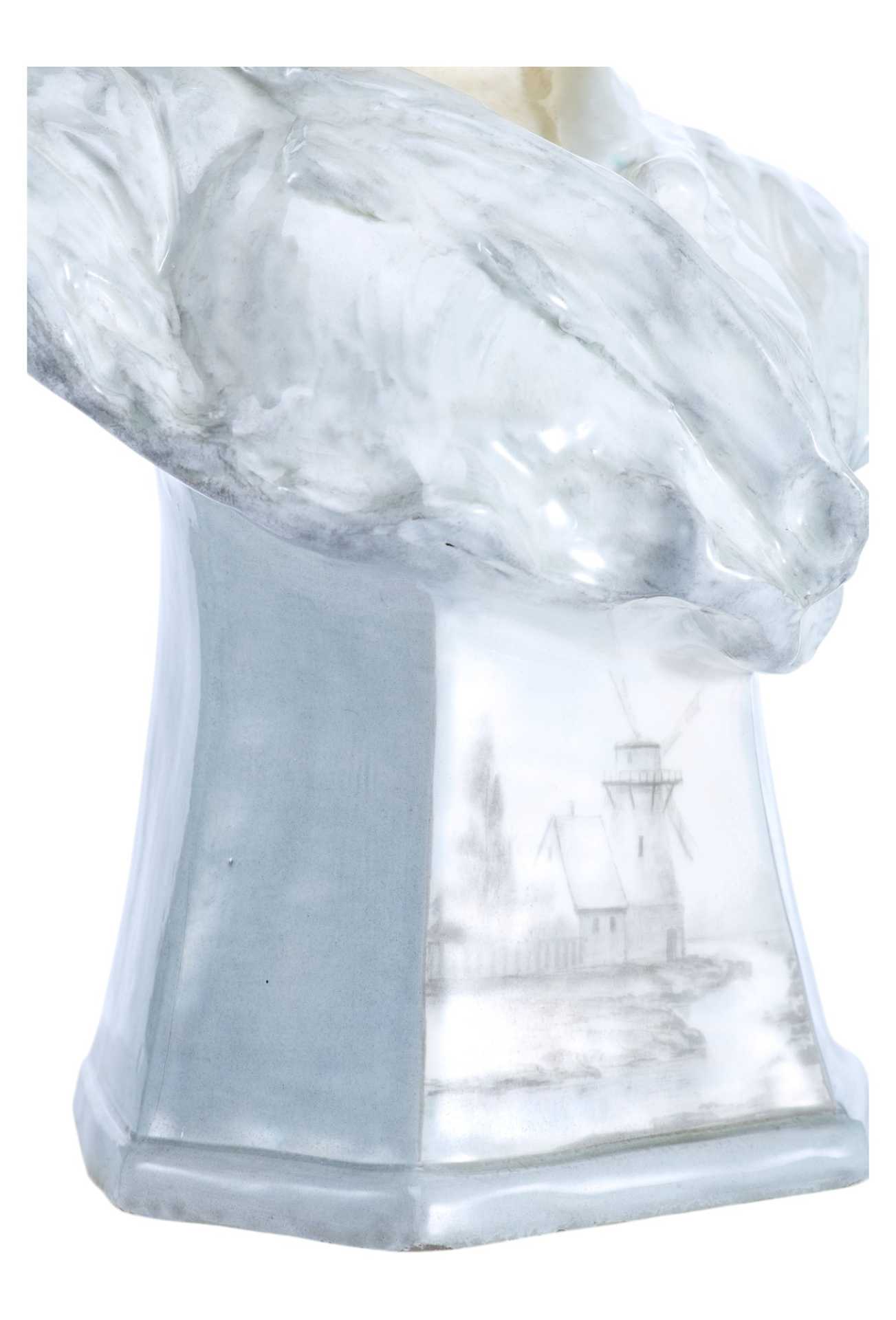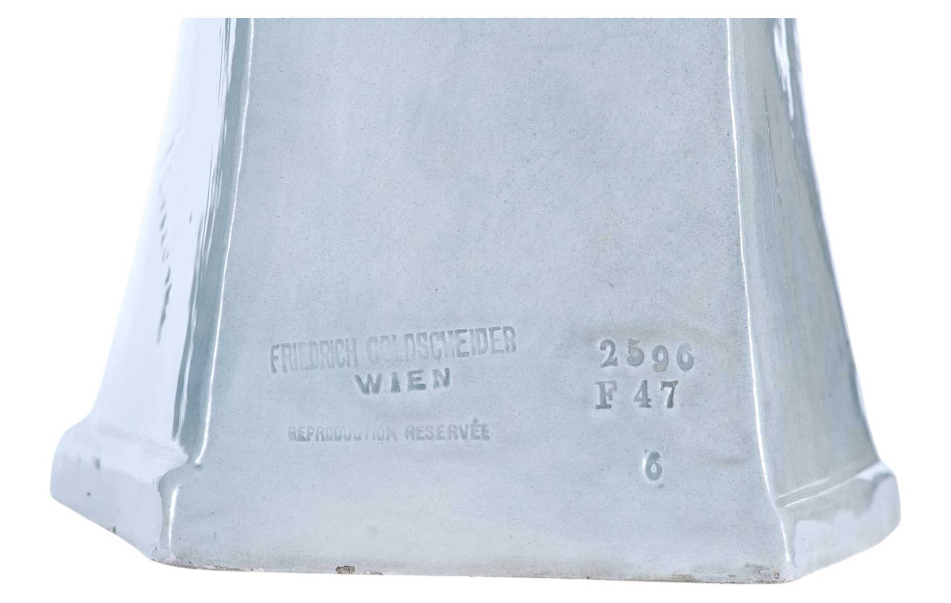 Представлена ваза, чаша которой лежит на головах трех полусидящих кариатид. Художественное оформление предмета
