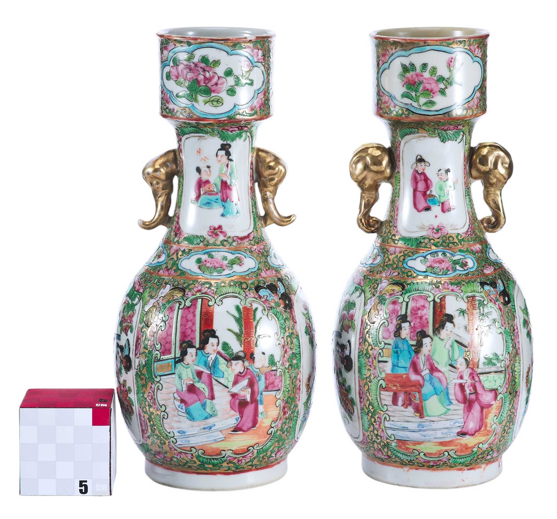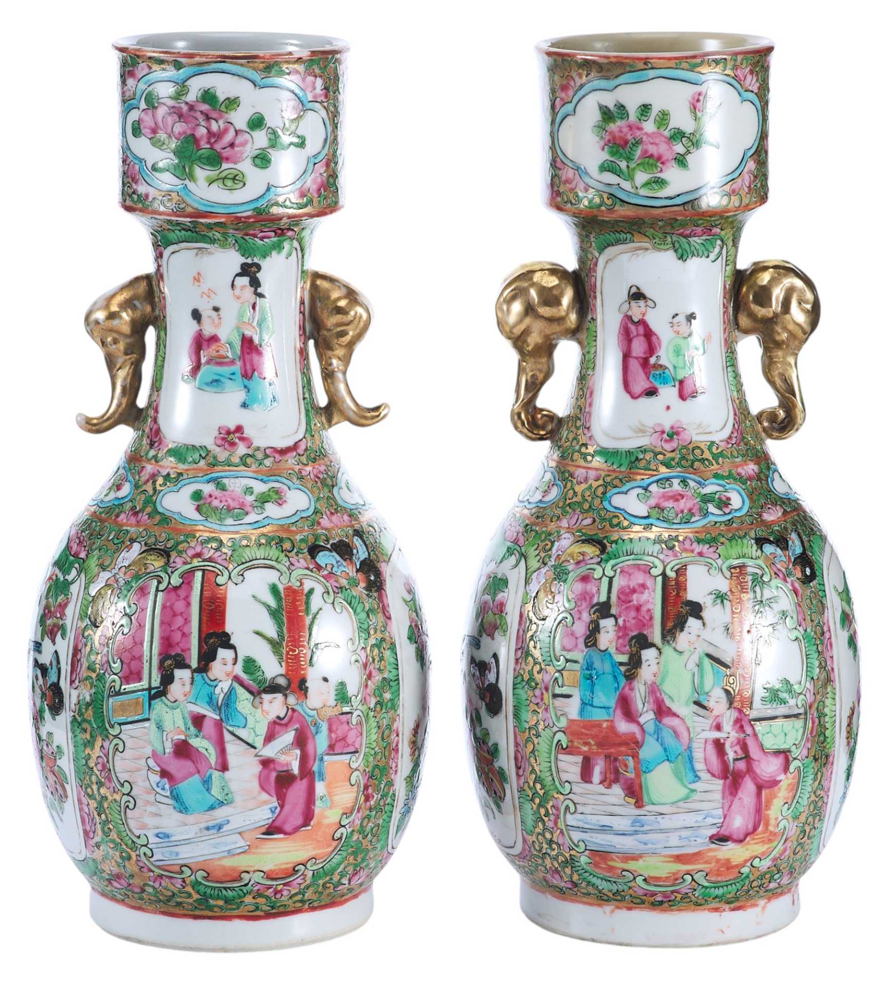 Две парные вазы, украшенные росписью, повествующей о жизни знатных дворцовых дам. По художественным особенностям предметов (уровень качества литья, росписи фарфора) и их функциональному назначению, ориентированному на