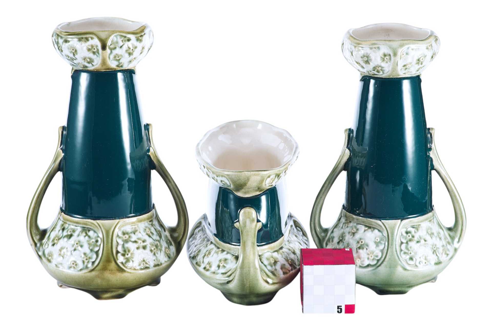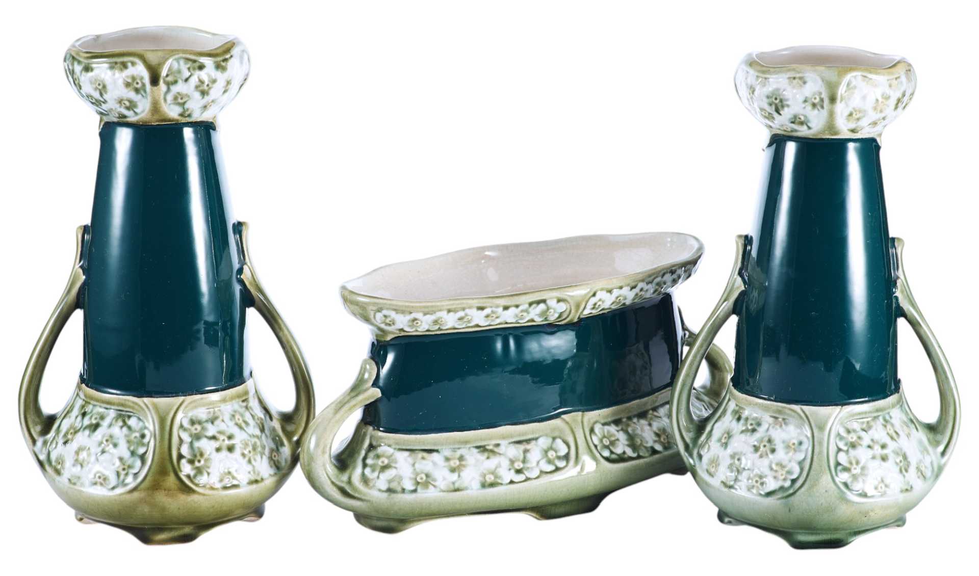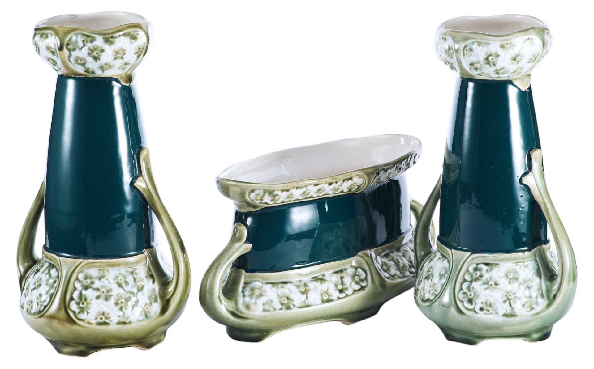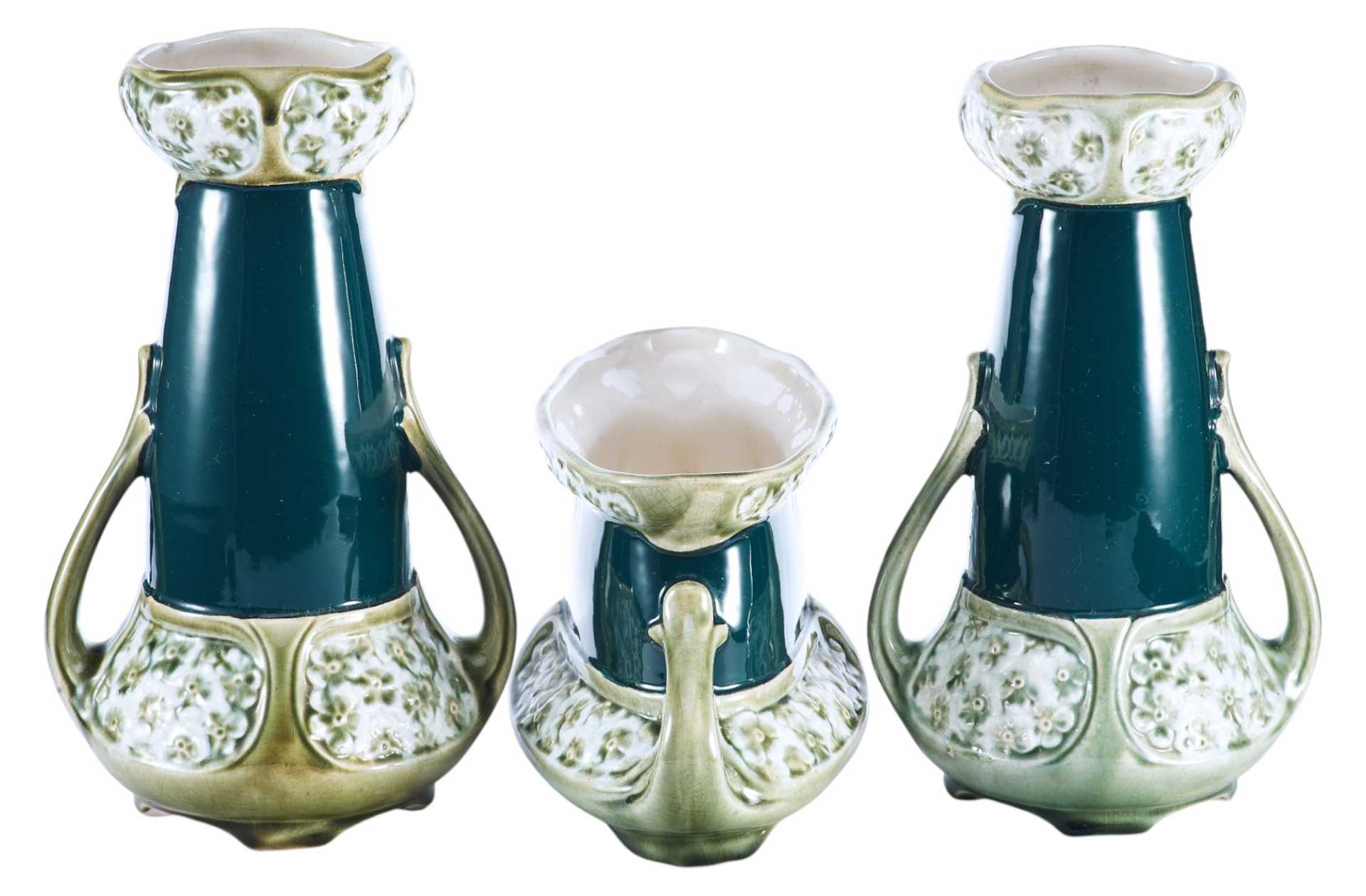Стандартный набор из трех ваз, украшенных единым декоративным оформлением в стиле ар-нуво.