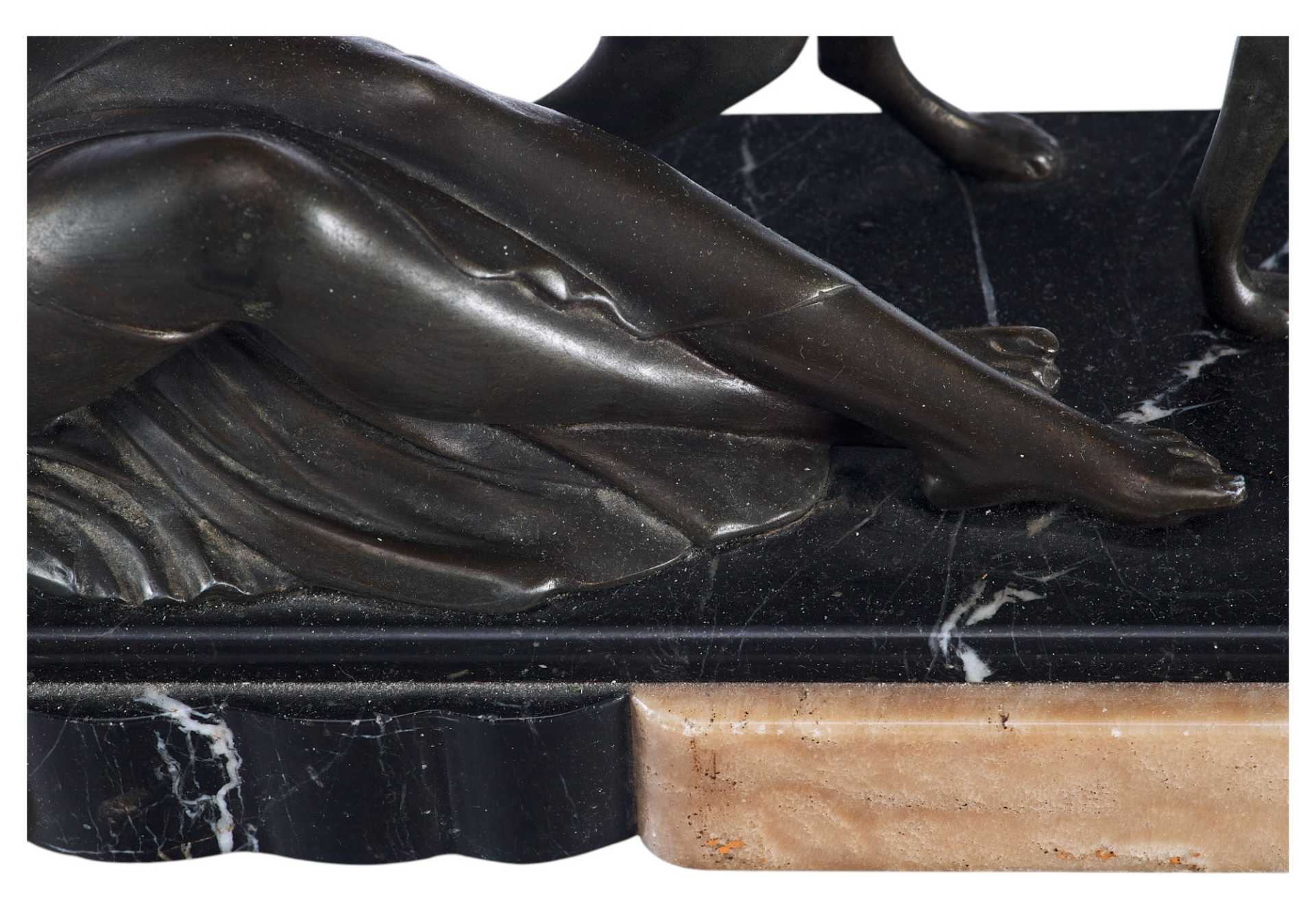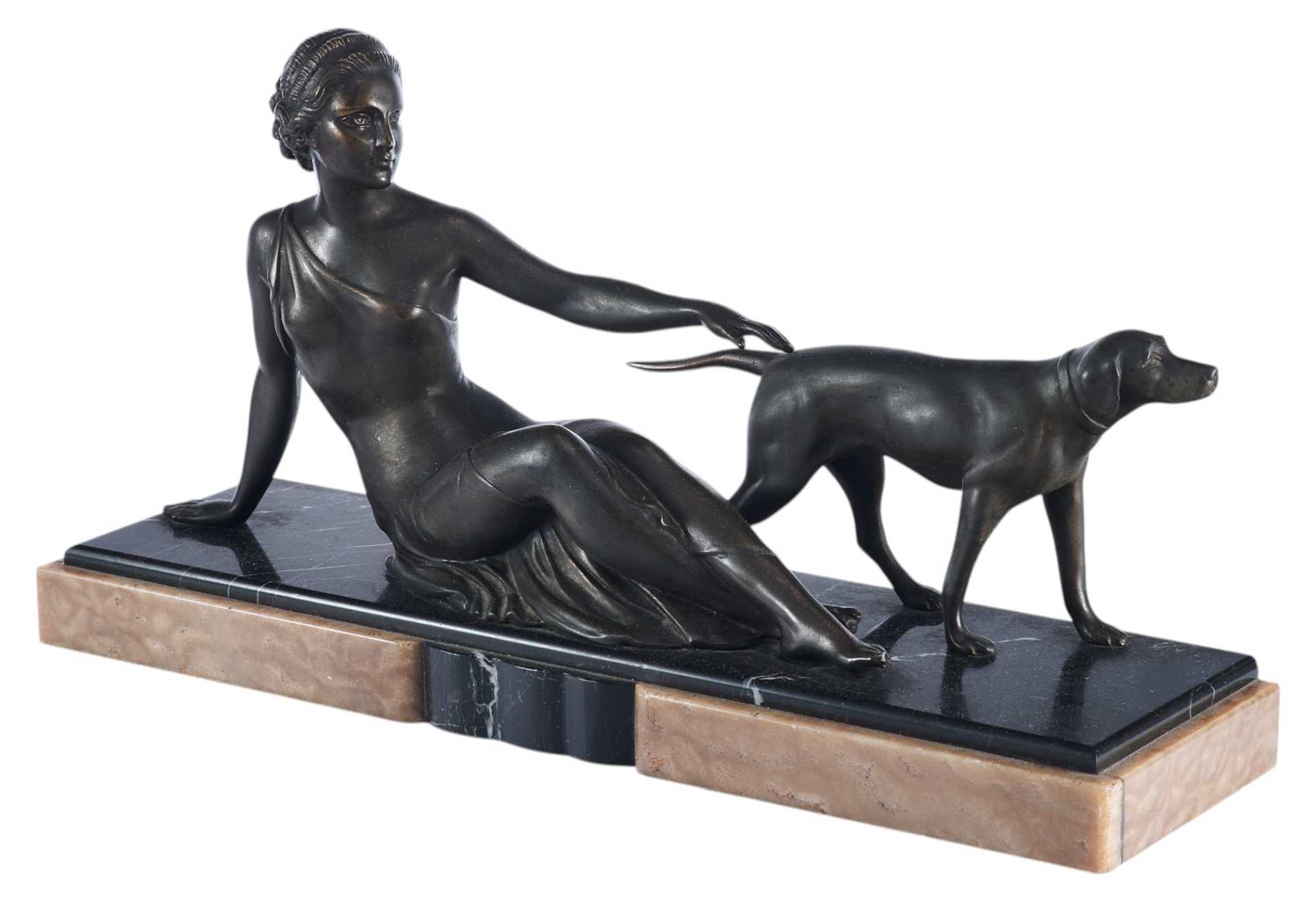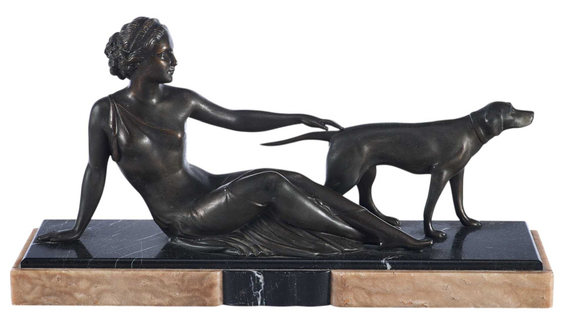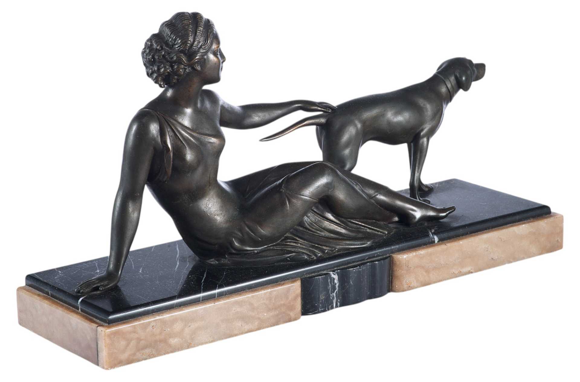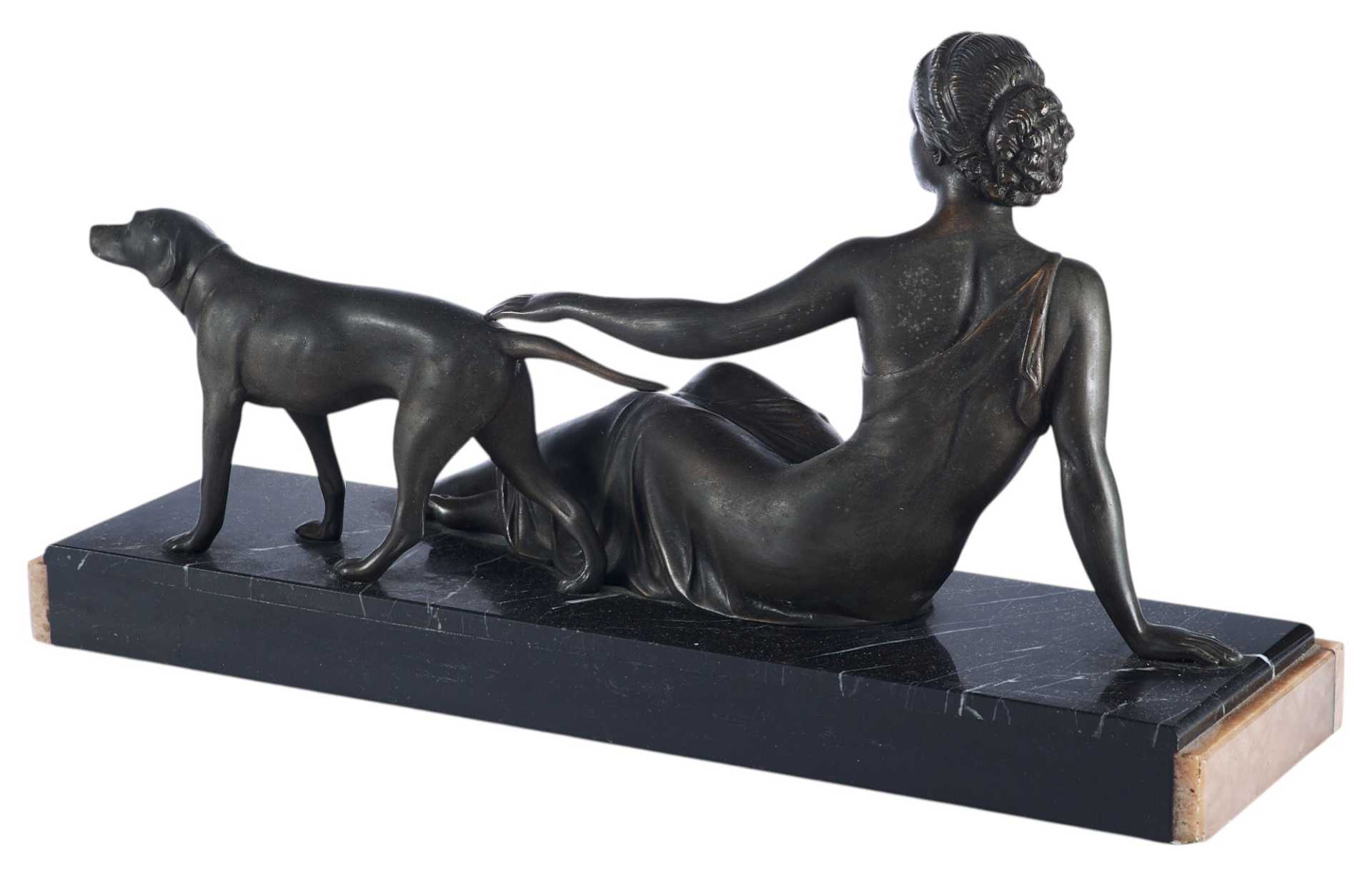 Реалистичная трактовка фигур девушки и собаки, детализация, говорят о том, что автор превосходно владеет материалом и является профессиональным скульптором. Композиции, построенные на игре с пластичностью и гибкостью женского тела, были одним из самыхпопулярных мотивов стиля ар-деко, тогда как сочетание современных эпохе материалов (в данном случае — мрамора и шпиатра) является одним из самых ярких признаков принадлежности произведения к этому стилю.