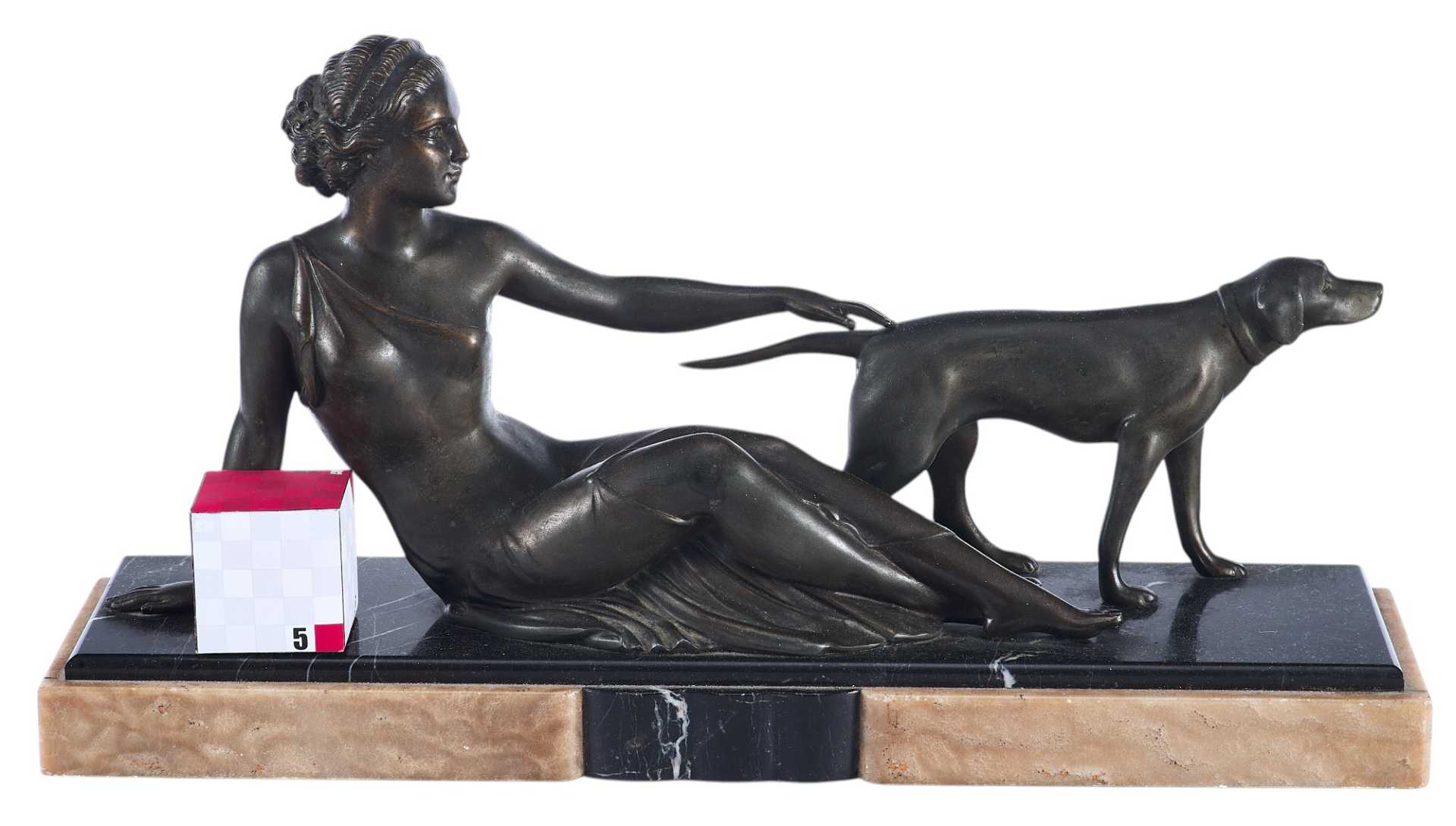 Скульптурная композиция в духе ар-деко представляет собой полулежащую женщину в легкой тунике, протягивающую руку,