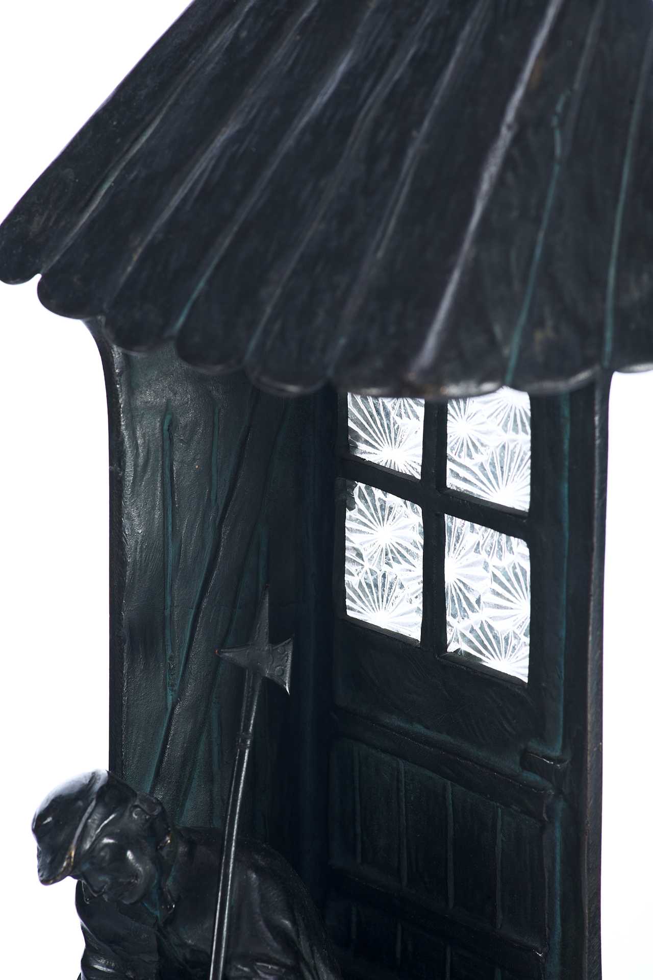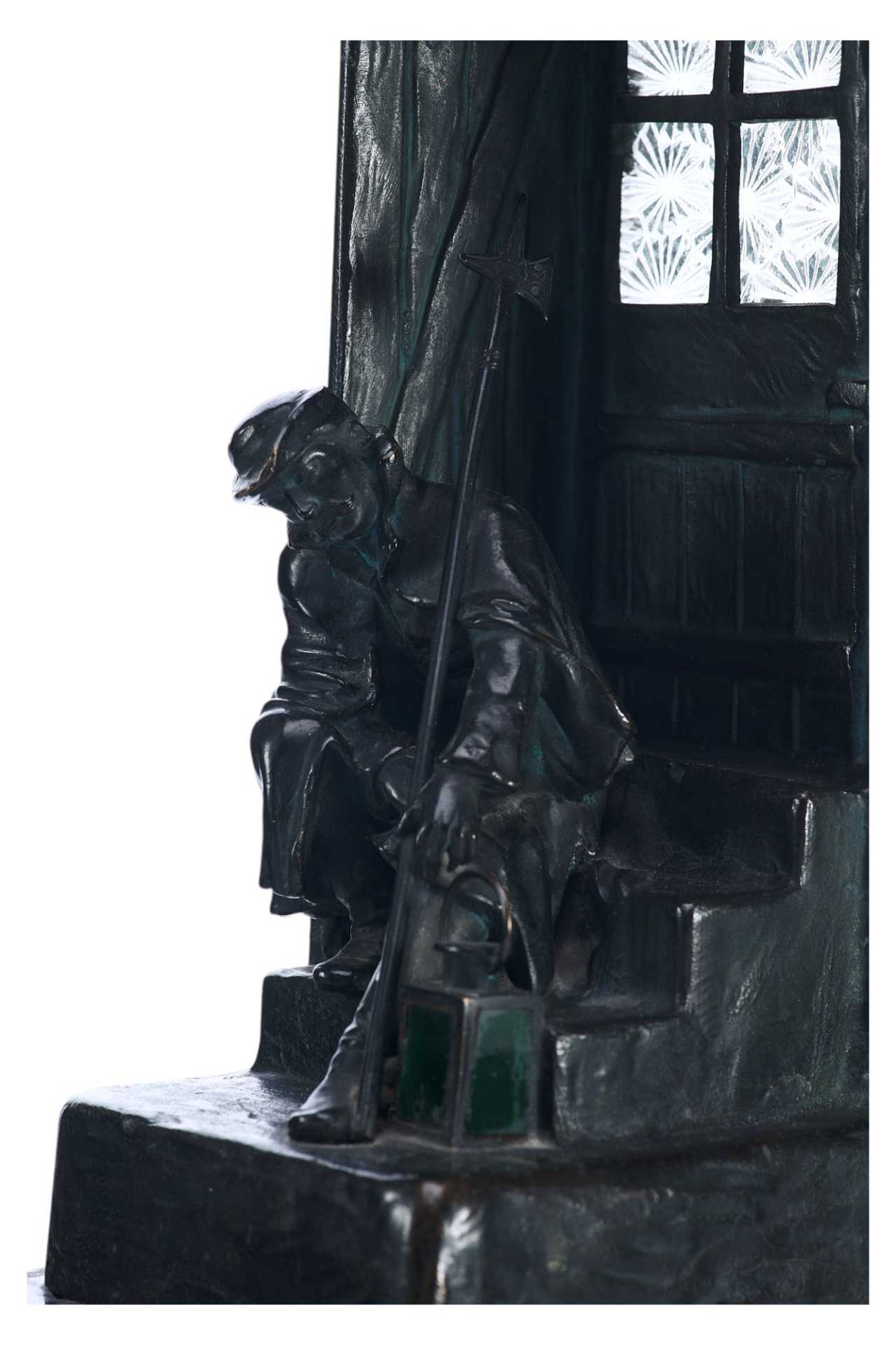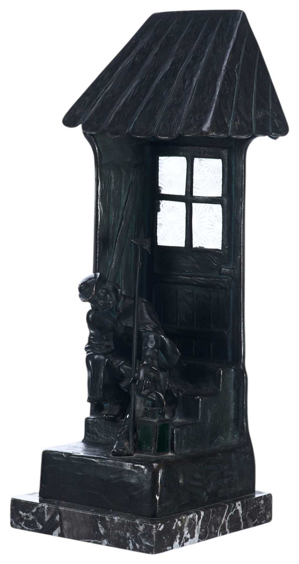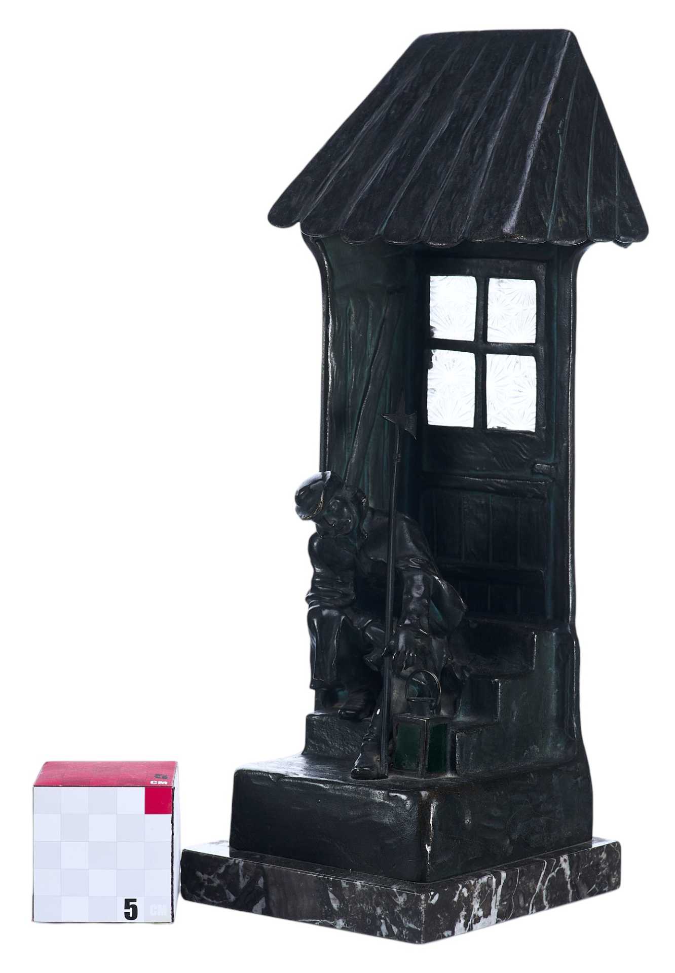 Бронзовая скульптура- ночник. На ступеньках спит сторож, навалившись на стенной косяк, в его руках пика, рядом фонарь. За дверью имеется электропатрон с лампочкой, светящей через застекленное окно.
