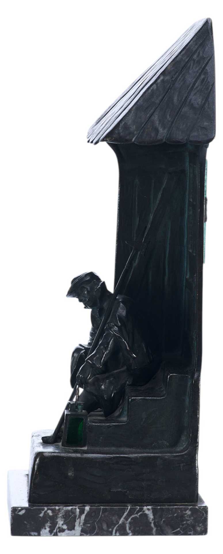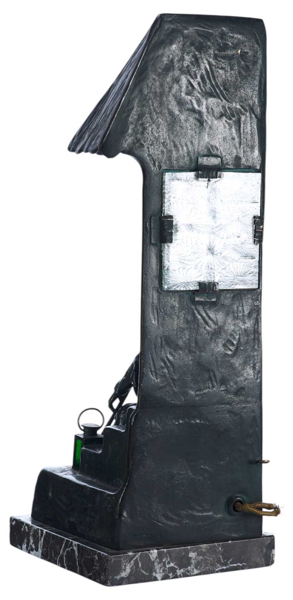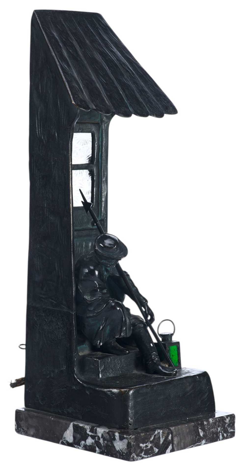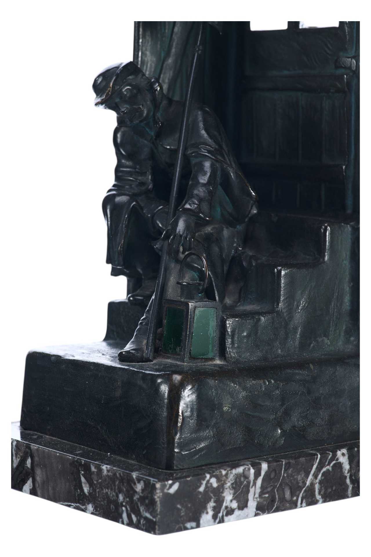 Бронзовая скульптура- ночник. На ступеньках спит сторож, навалившись на стенной косяк, в его руках пика, рядом фонарь. За дверью имеется электропатрон с лампочкой, светящей через застекленное окно.