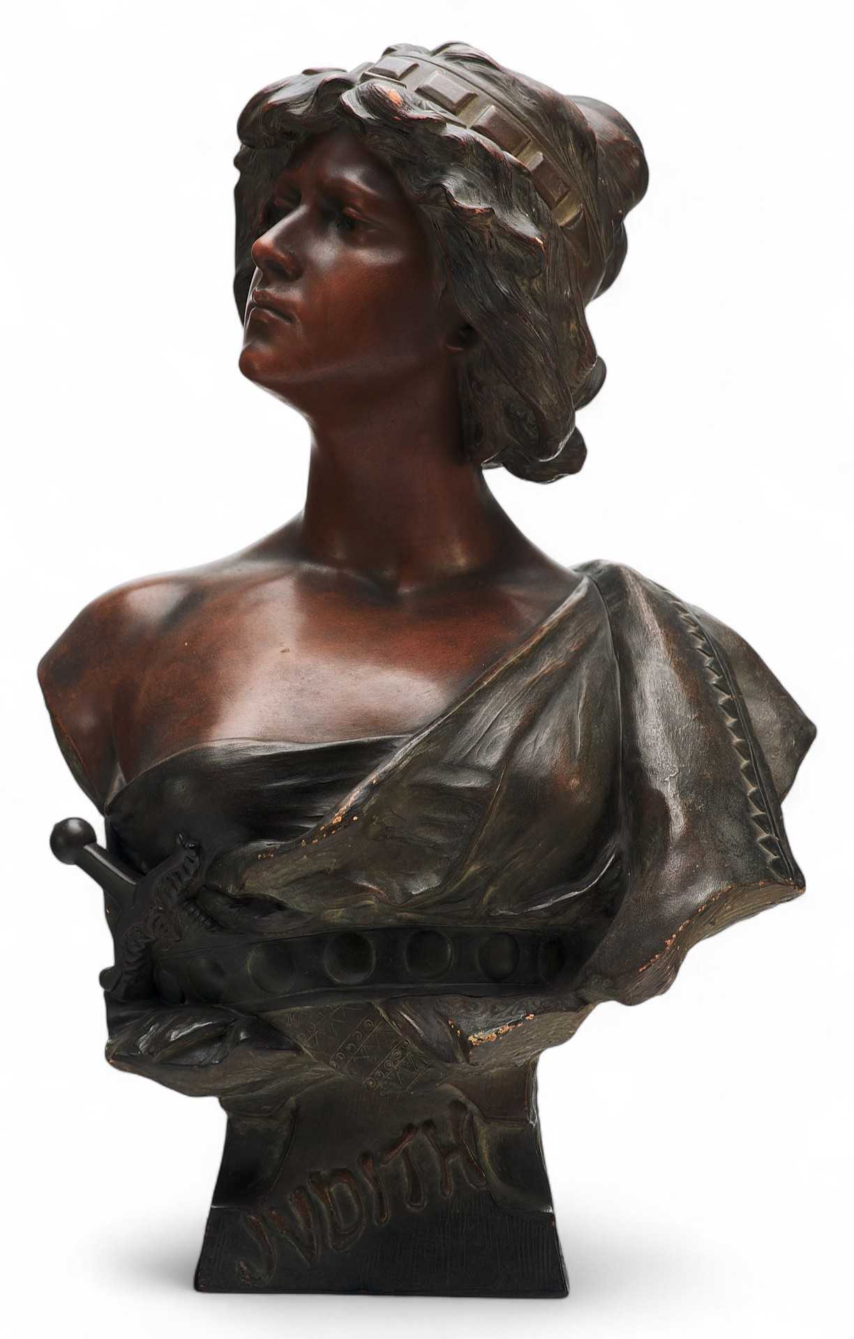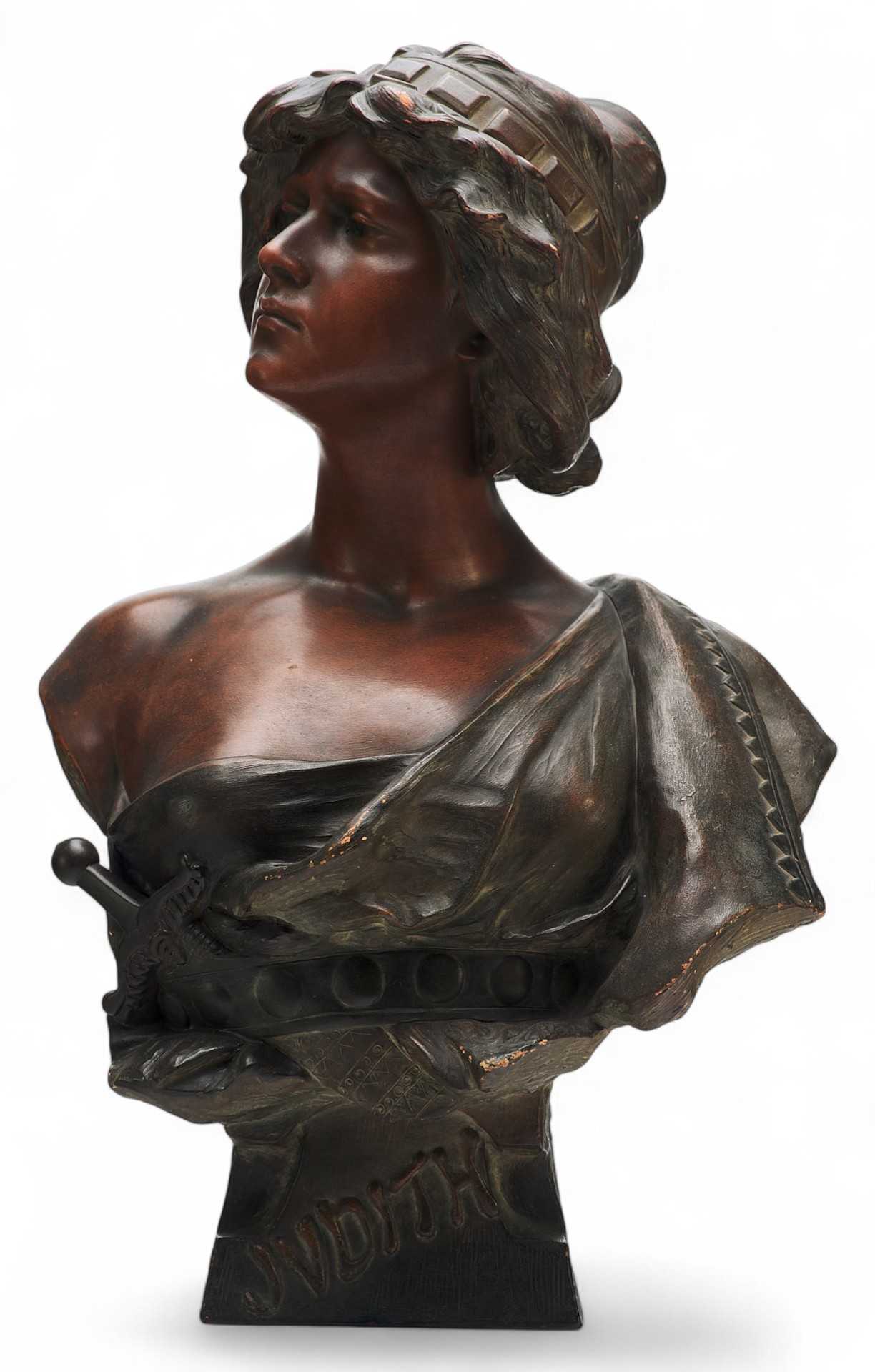 Скульптурный бюст девушки в накидке, напоминающей древнегреческую экзомиду (часто европейские авторы одевали героев Ветхого и Нового заветов в греческие или восточные костюмы), с мечом, заткнутым за пояс. На основании: «JUDITH».