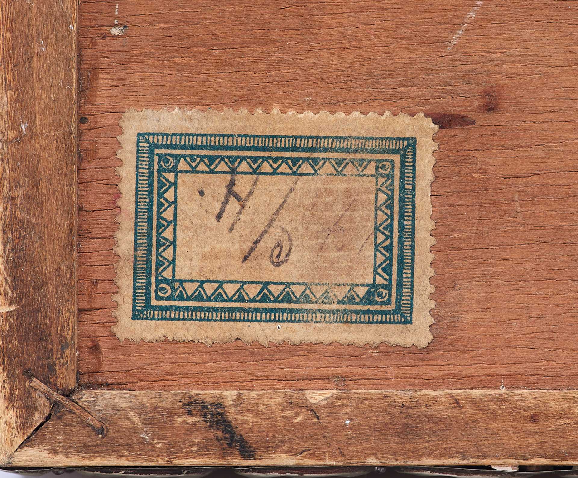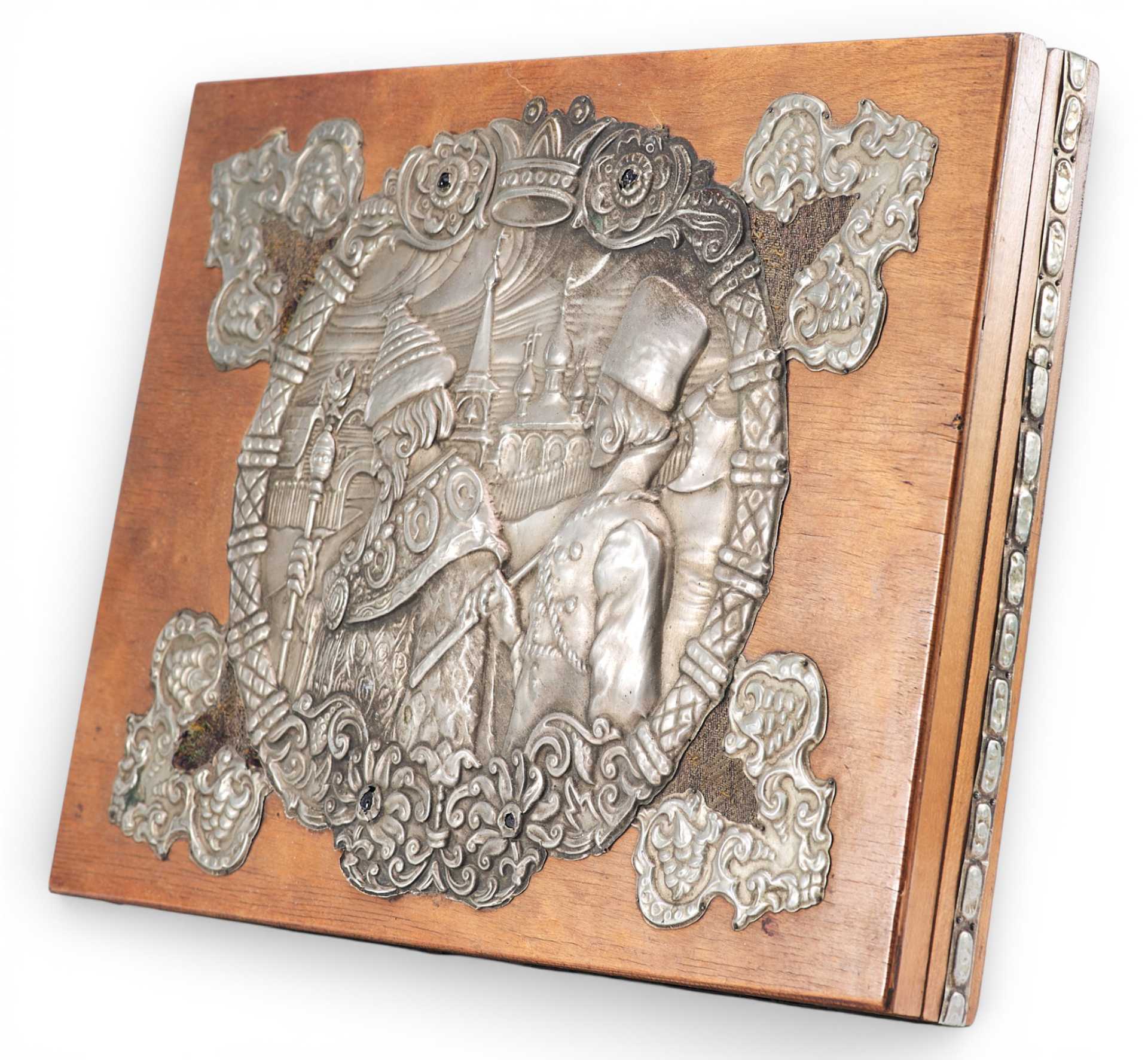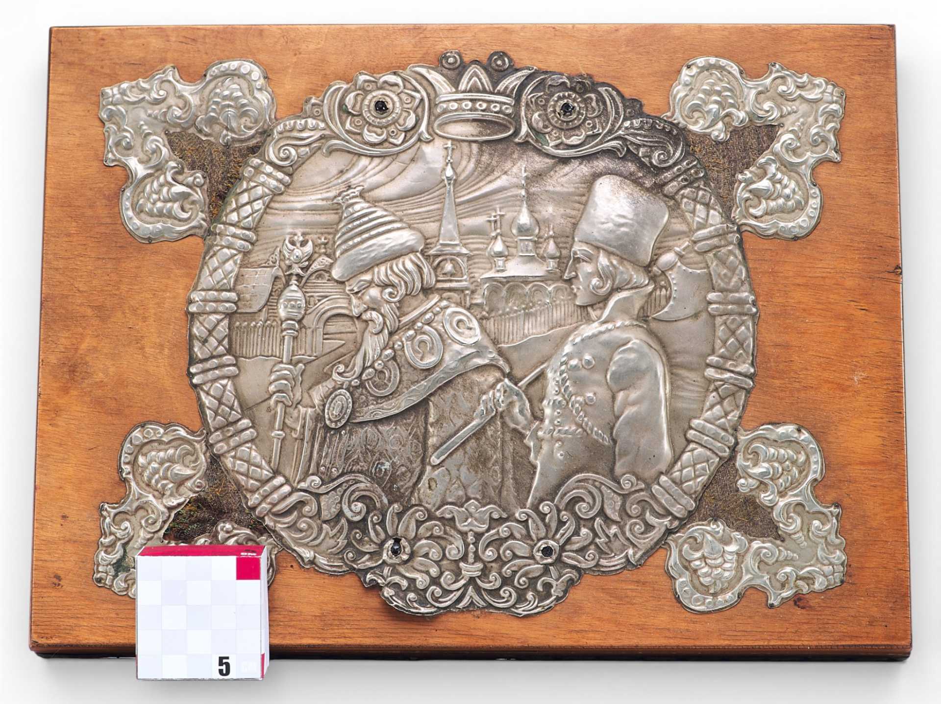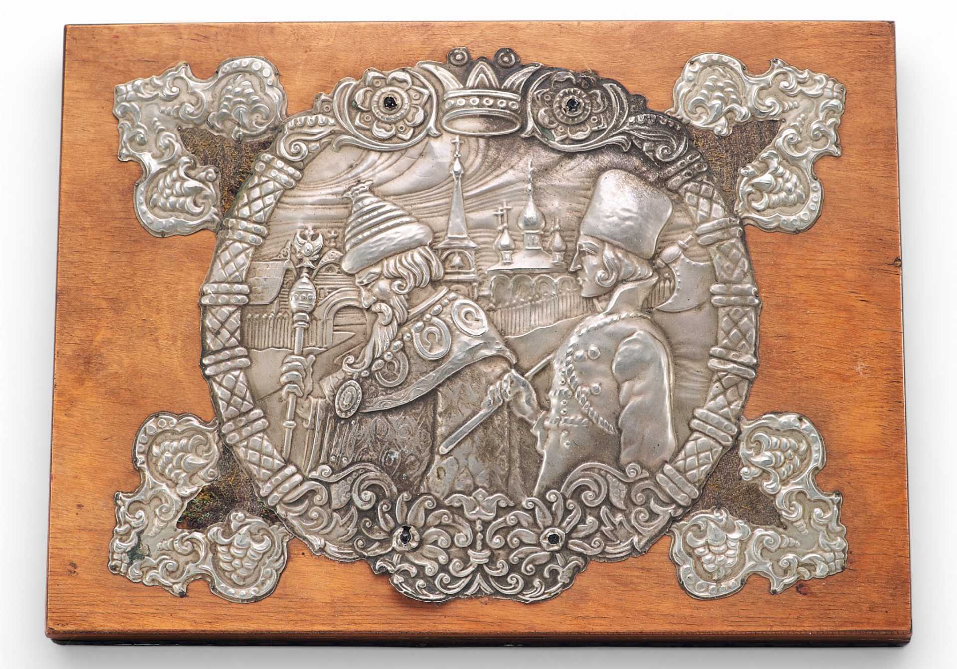 Представлена шкатулка, украшенная жестяной рельефной композицией «Царь и стрелец» в нео-русском стиле, популярном при оформлении изделий декоративно-прикладного искусства в конце XIX — начале XX вв.