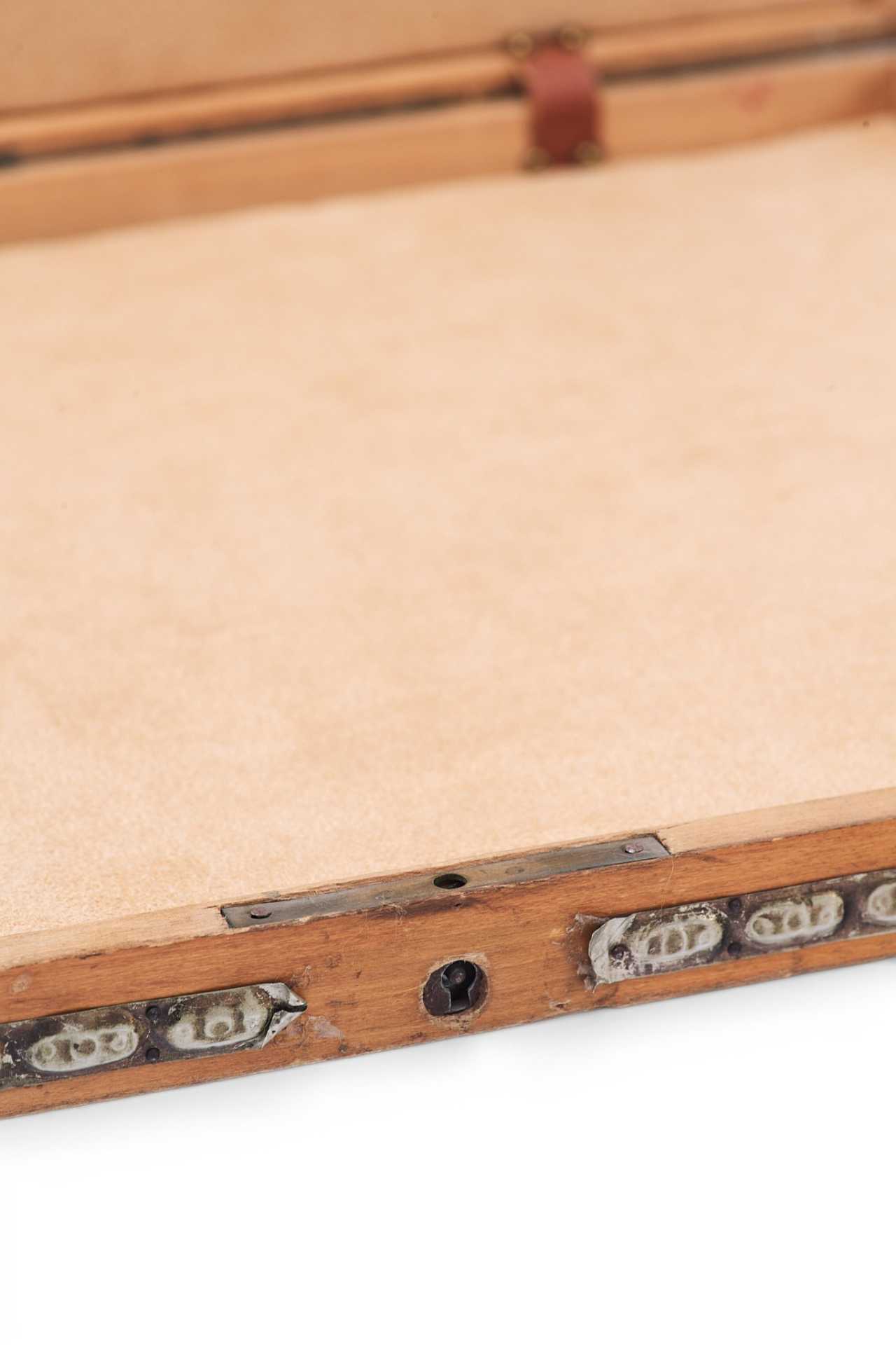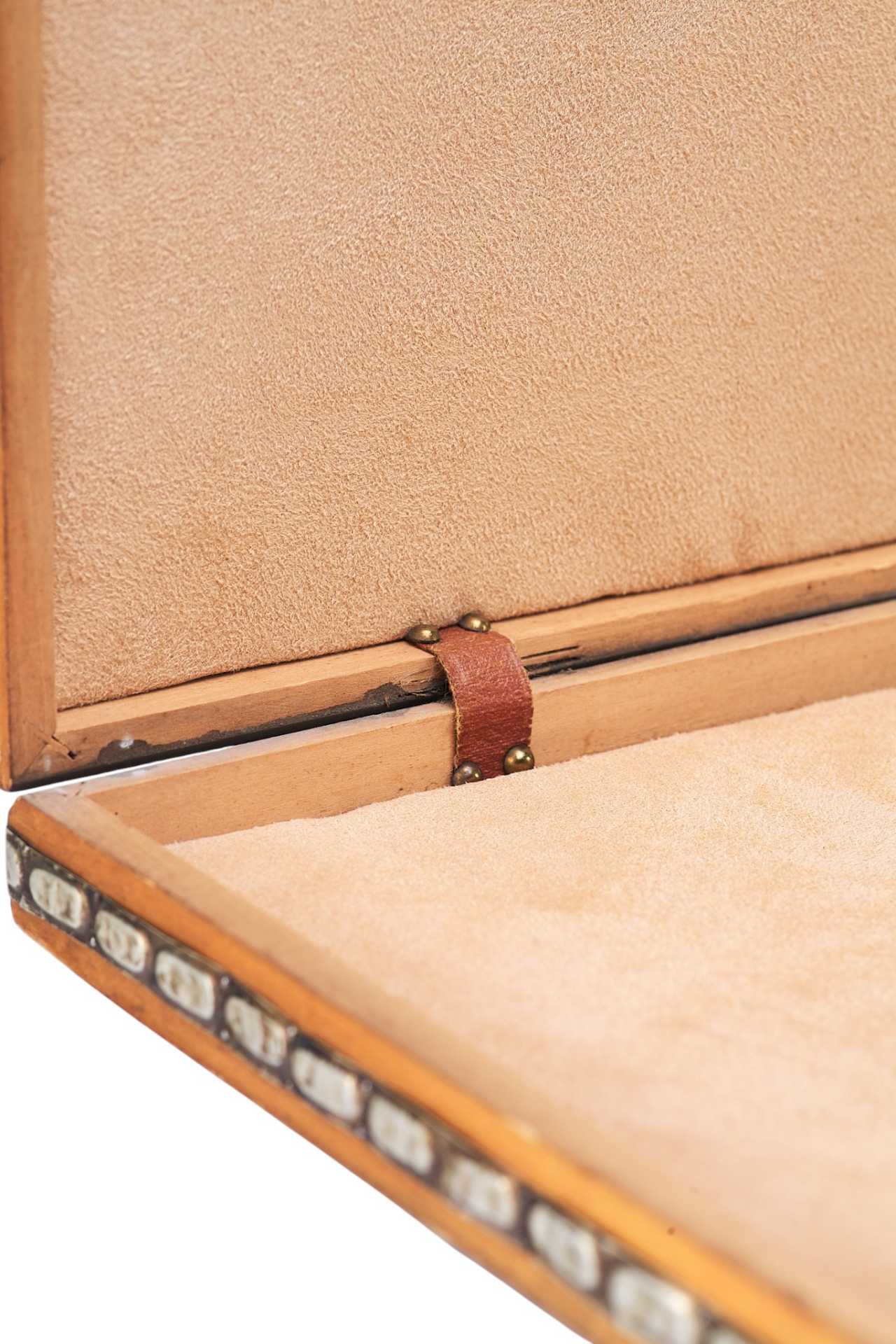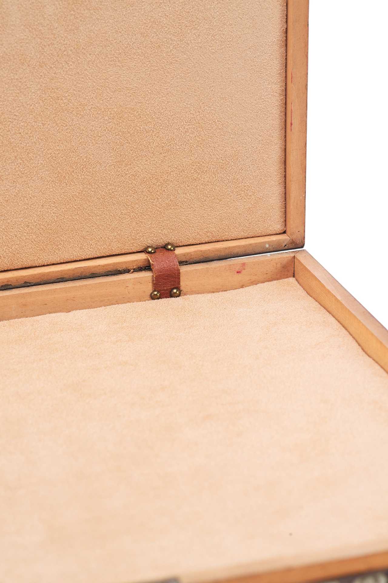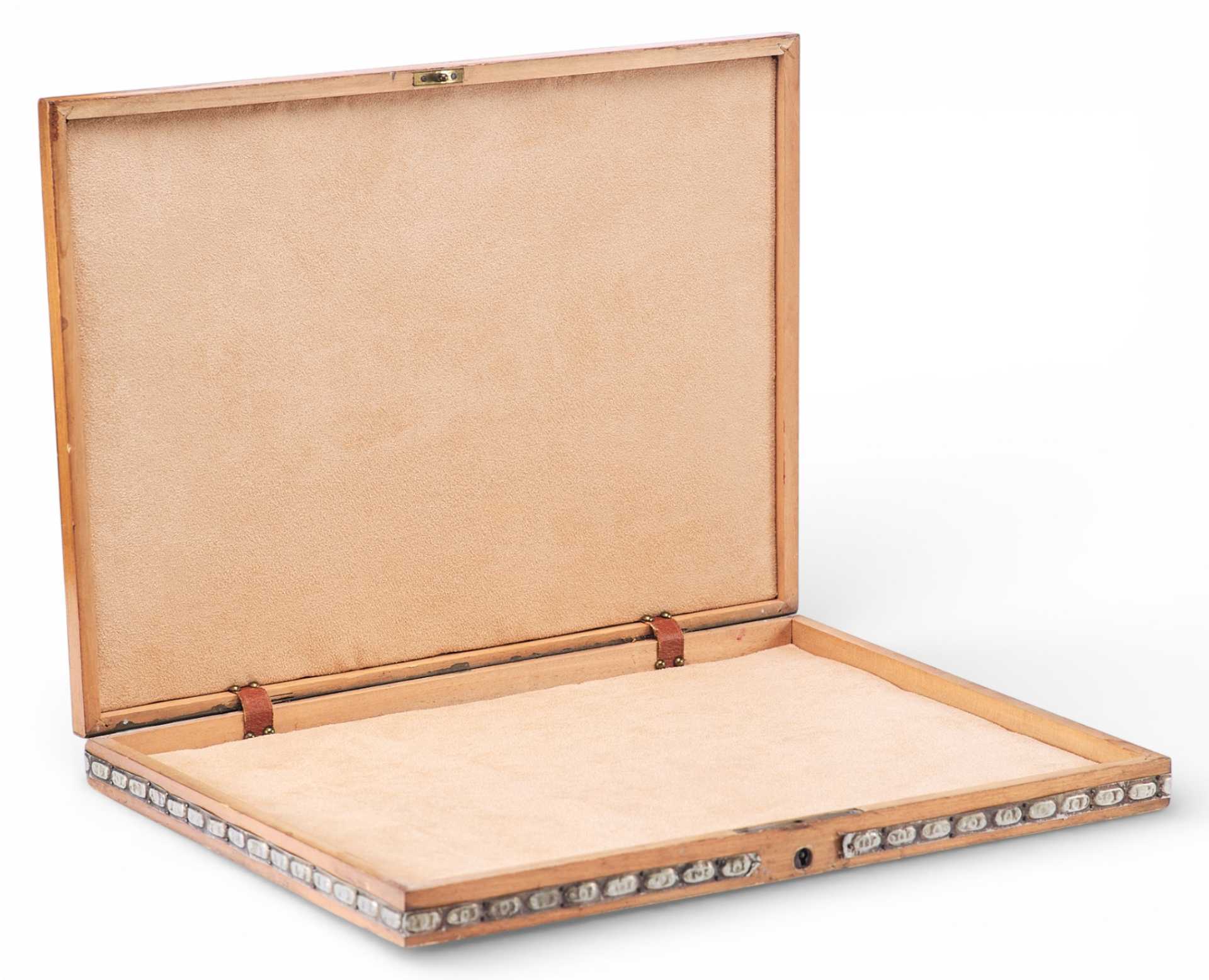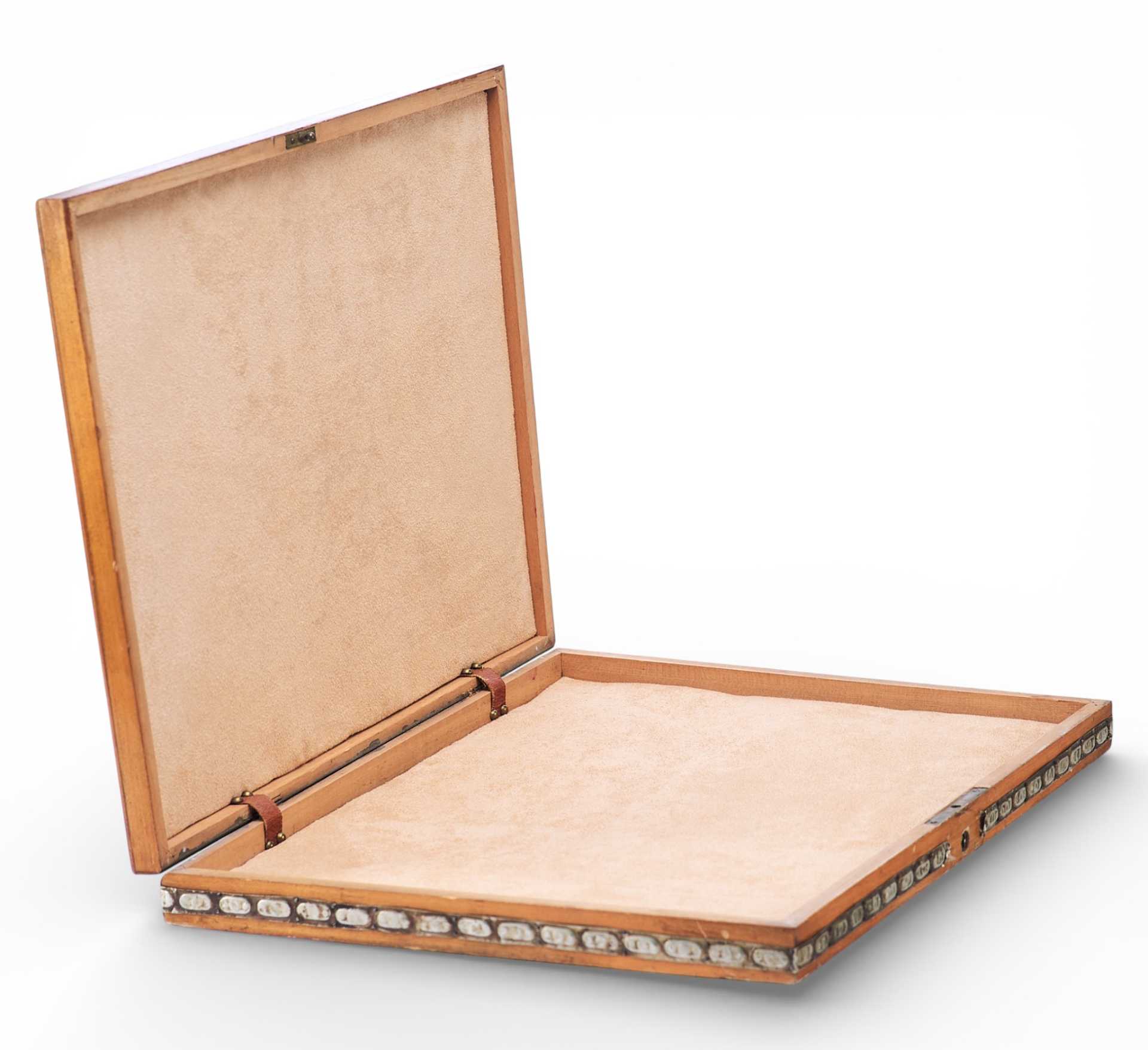 Представлена шкатулка, украшенная жестяной рельефной композицией «Царь и стрелец» в нео-русском стиле, популярном при оформлении изделий декоративно-прикладного искусства в конце XIX — начале XX вв.