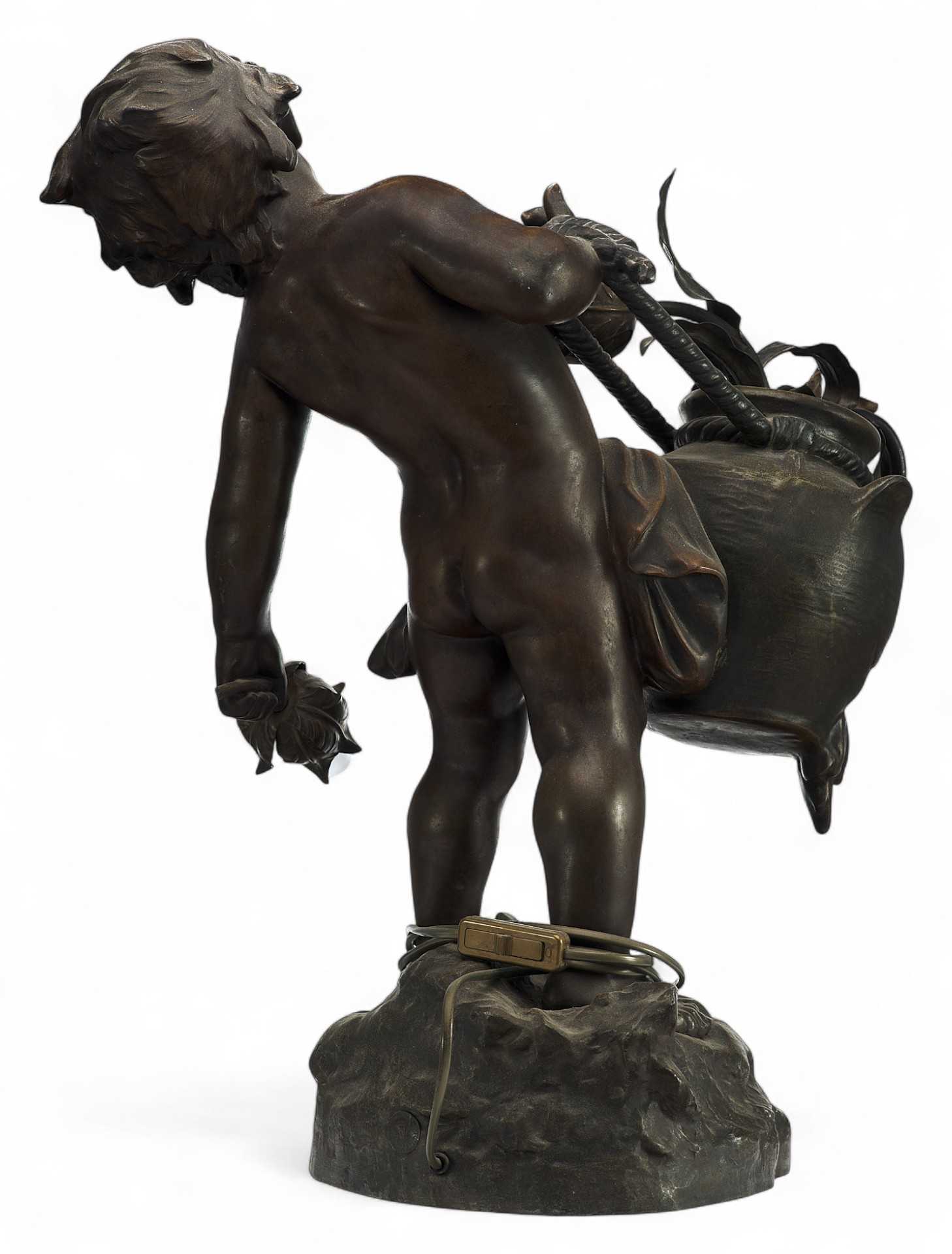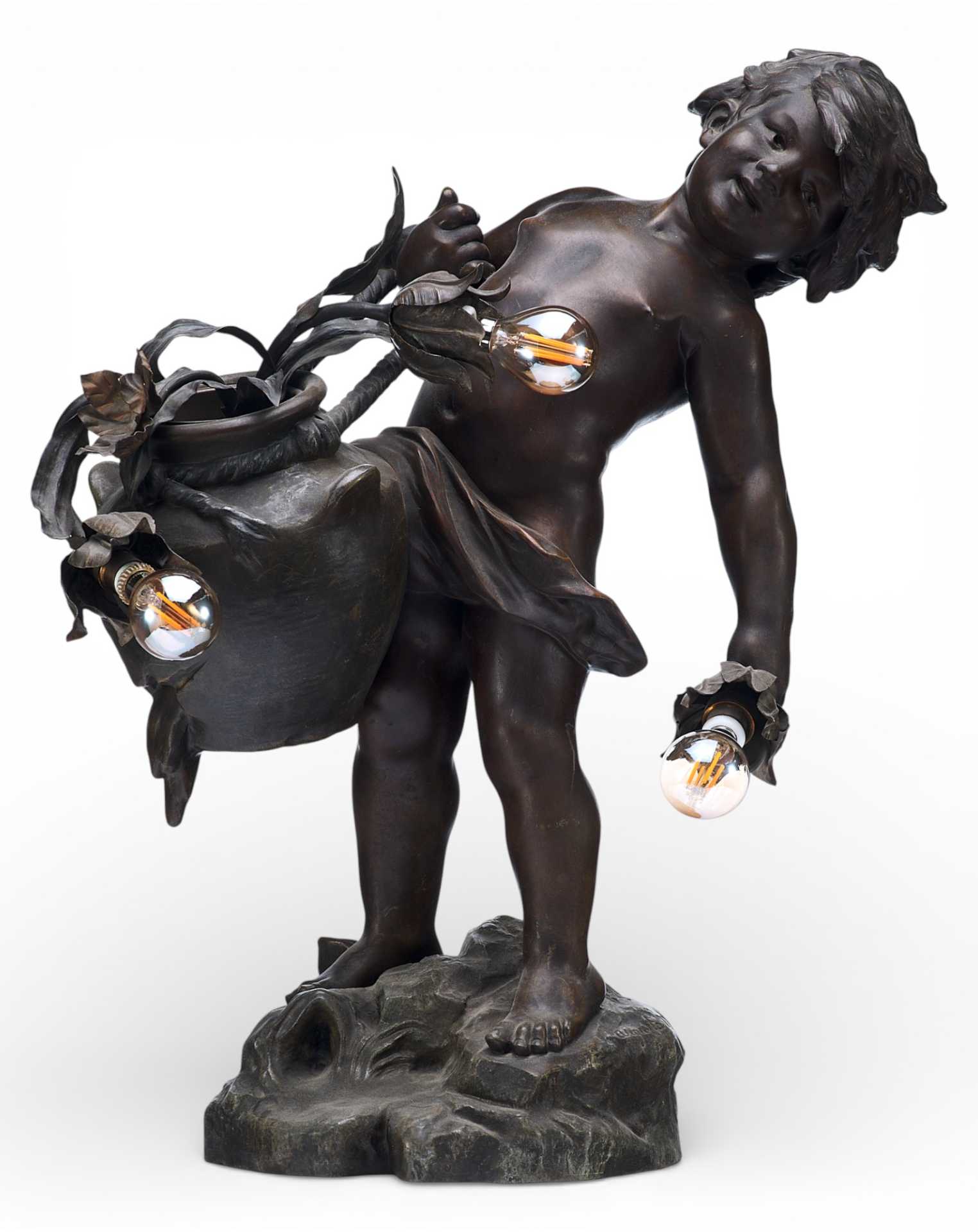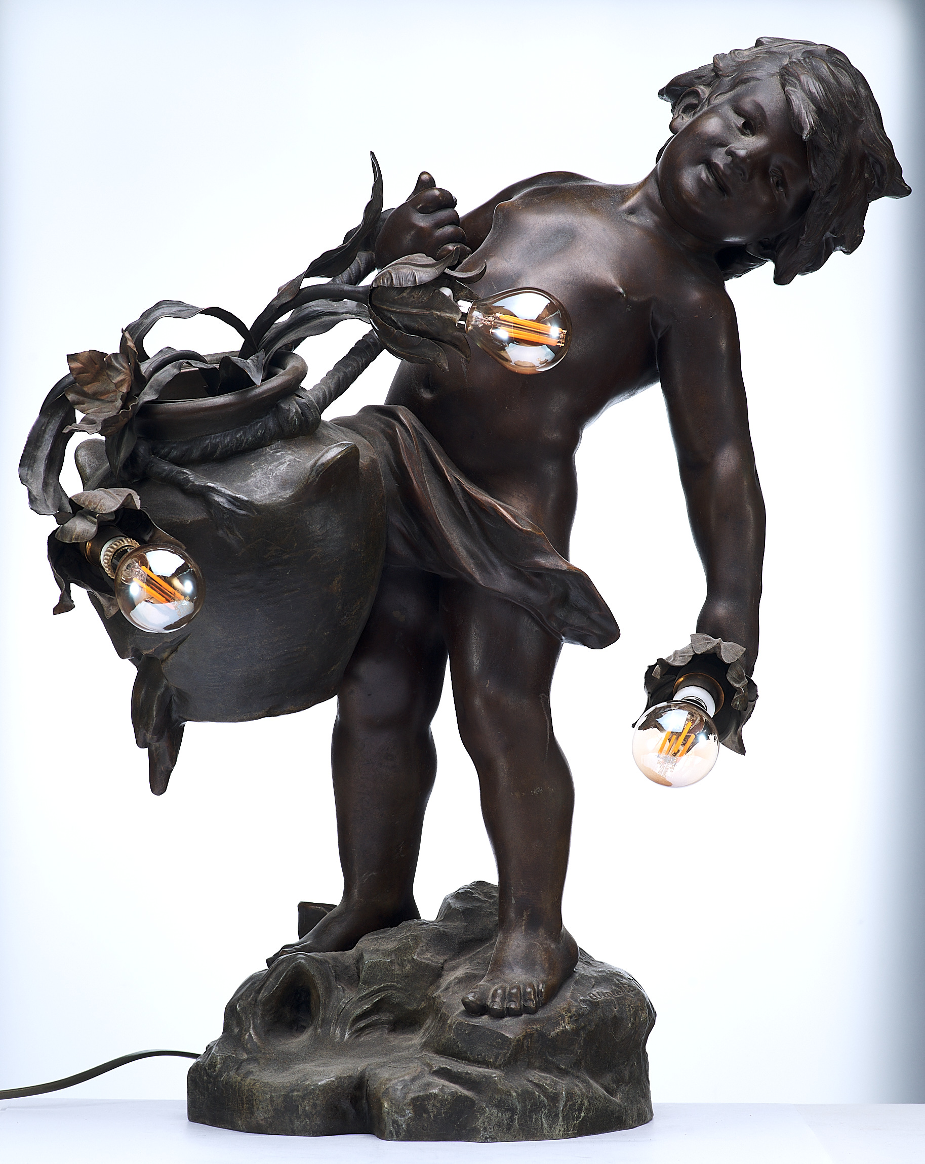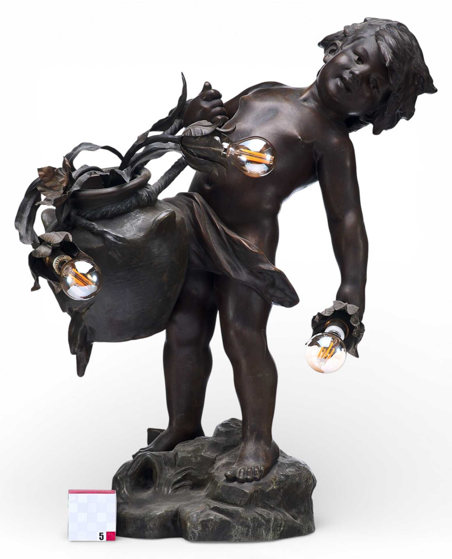 Светильник в виде скульптуры мальчика несущего корзину цветов. На основании светильника авторская подпись: «Auguste Moreau». Подпись по манере начертания совпадает с подписью французского скульптора Августа Моро (1834-1917), специализировавшегося на фигурах юных чувственных девушек и юношей. Auguste Moreau (1834-1917) - родился в Париже в семье скульптора ЖанаБатиста Моро. Первоначальное художественное образование получил у своего отца, который учился у Aimé Millet, Augustin-a Drumont-a and Jean-a Thomas.