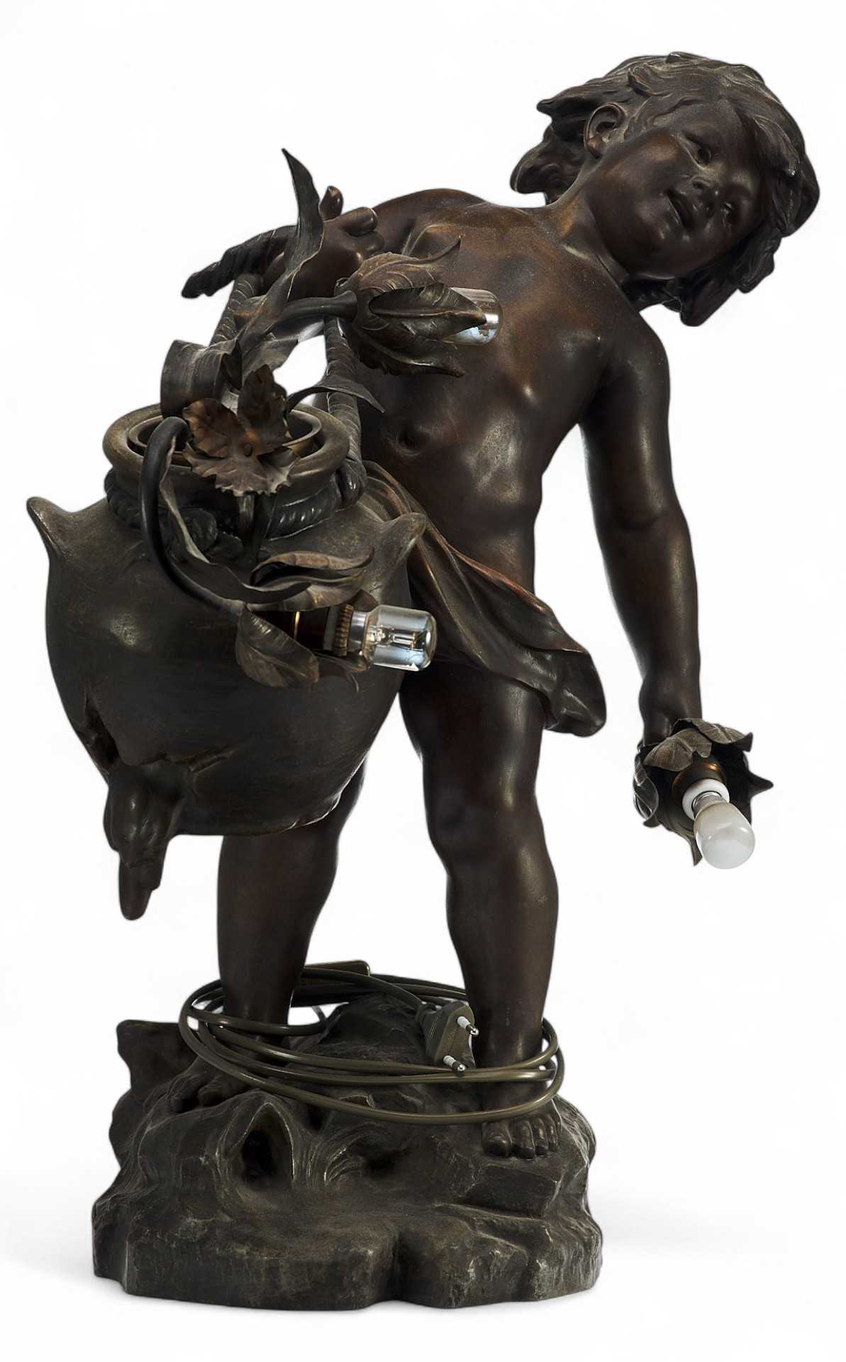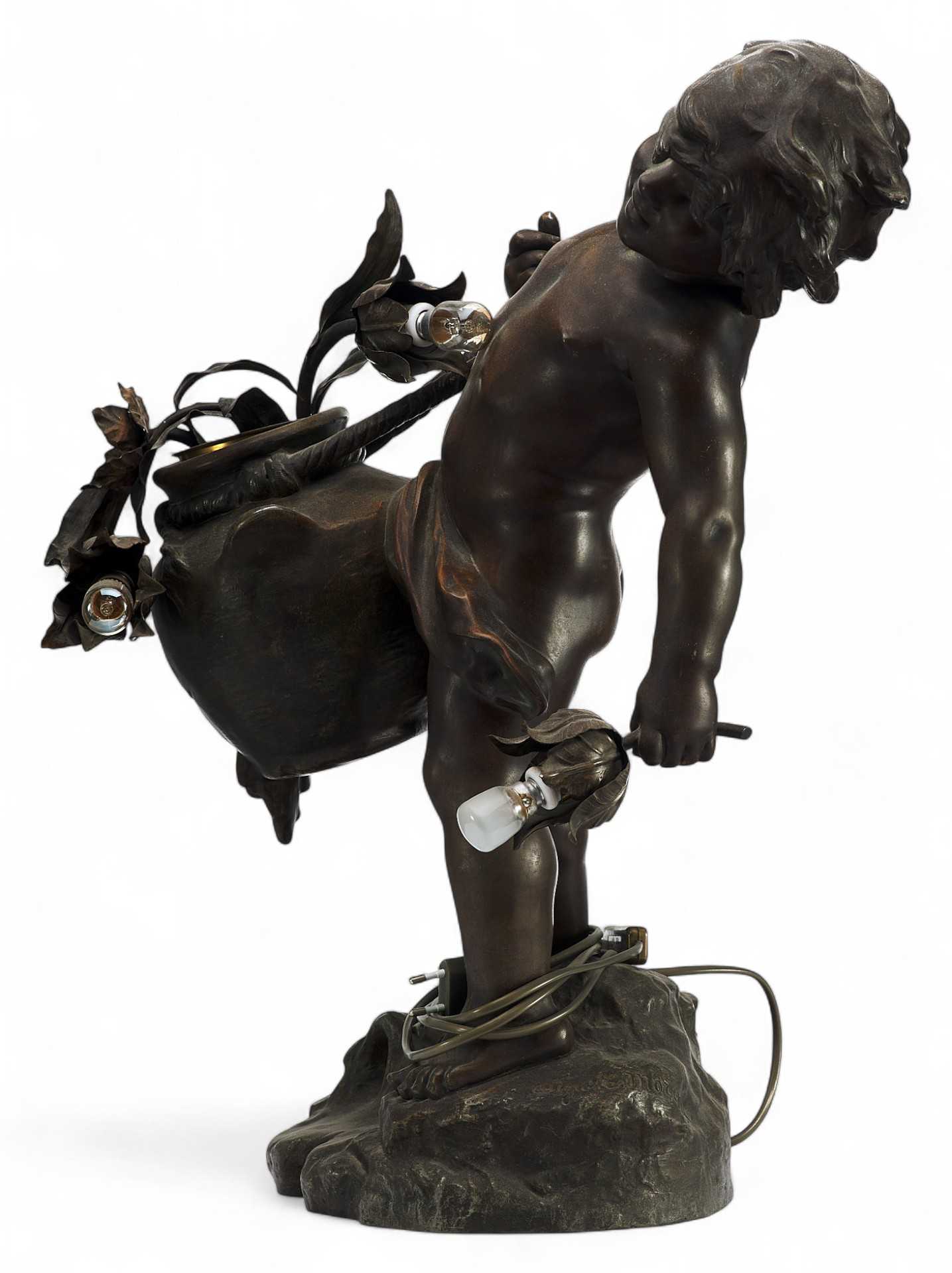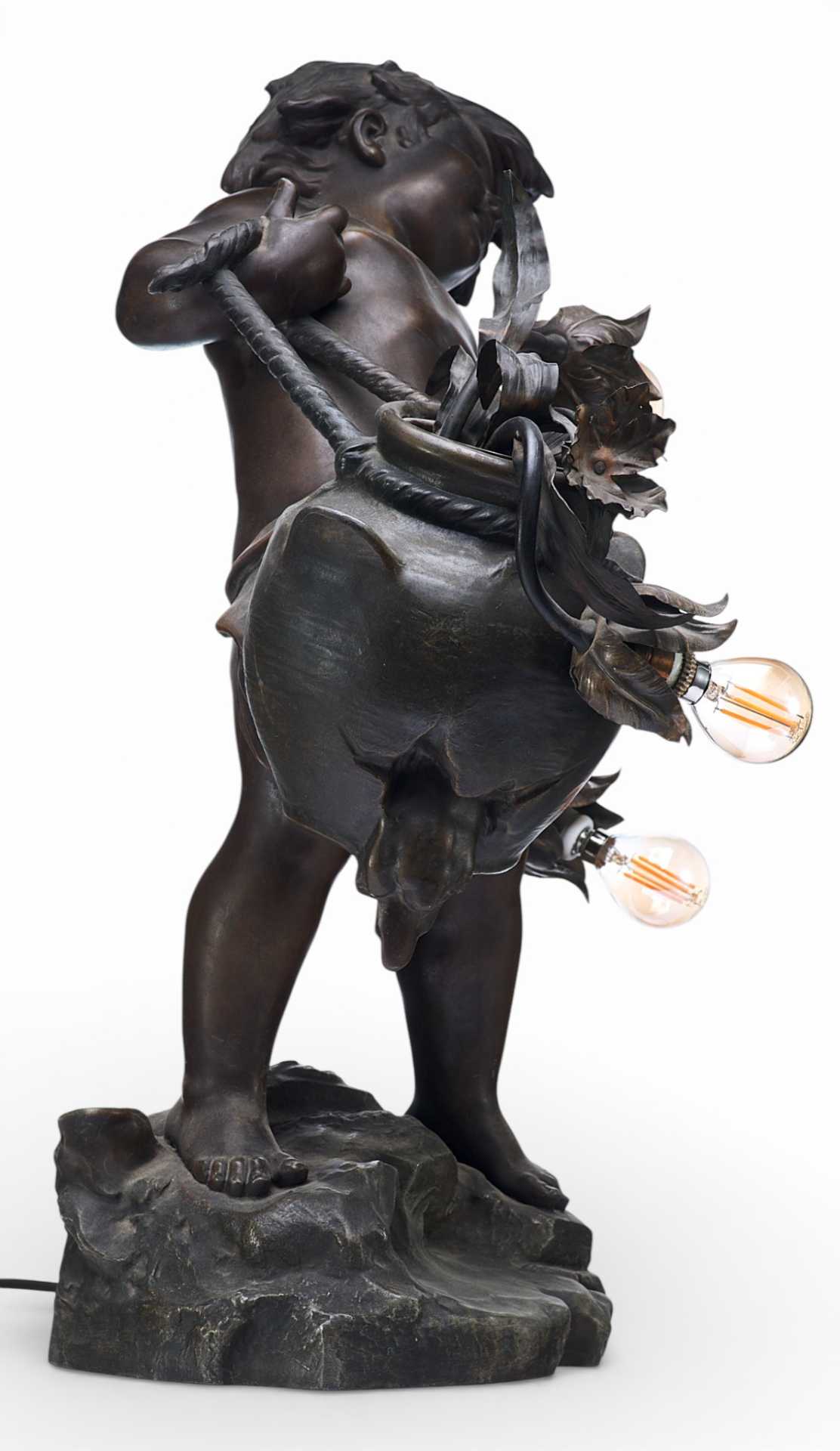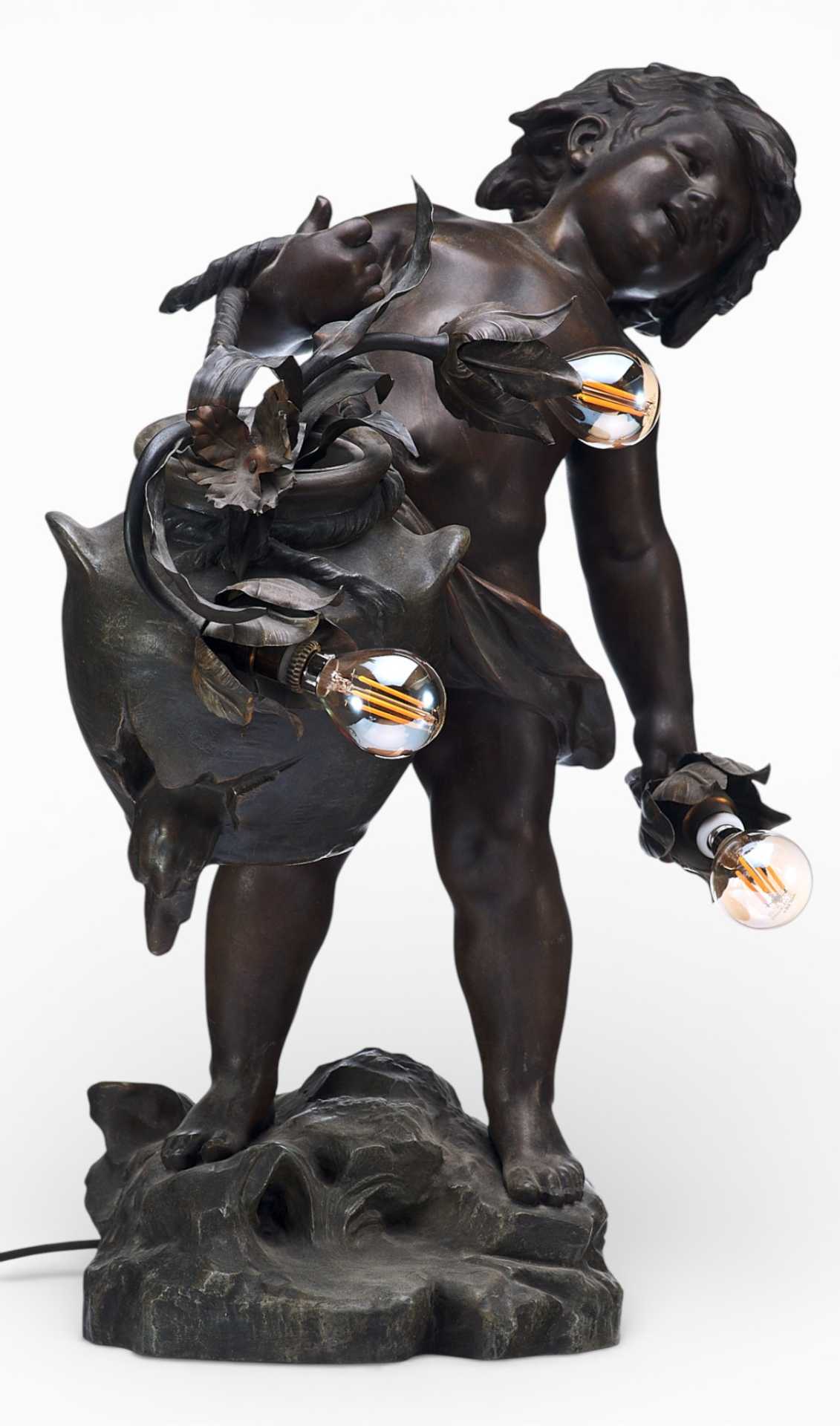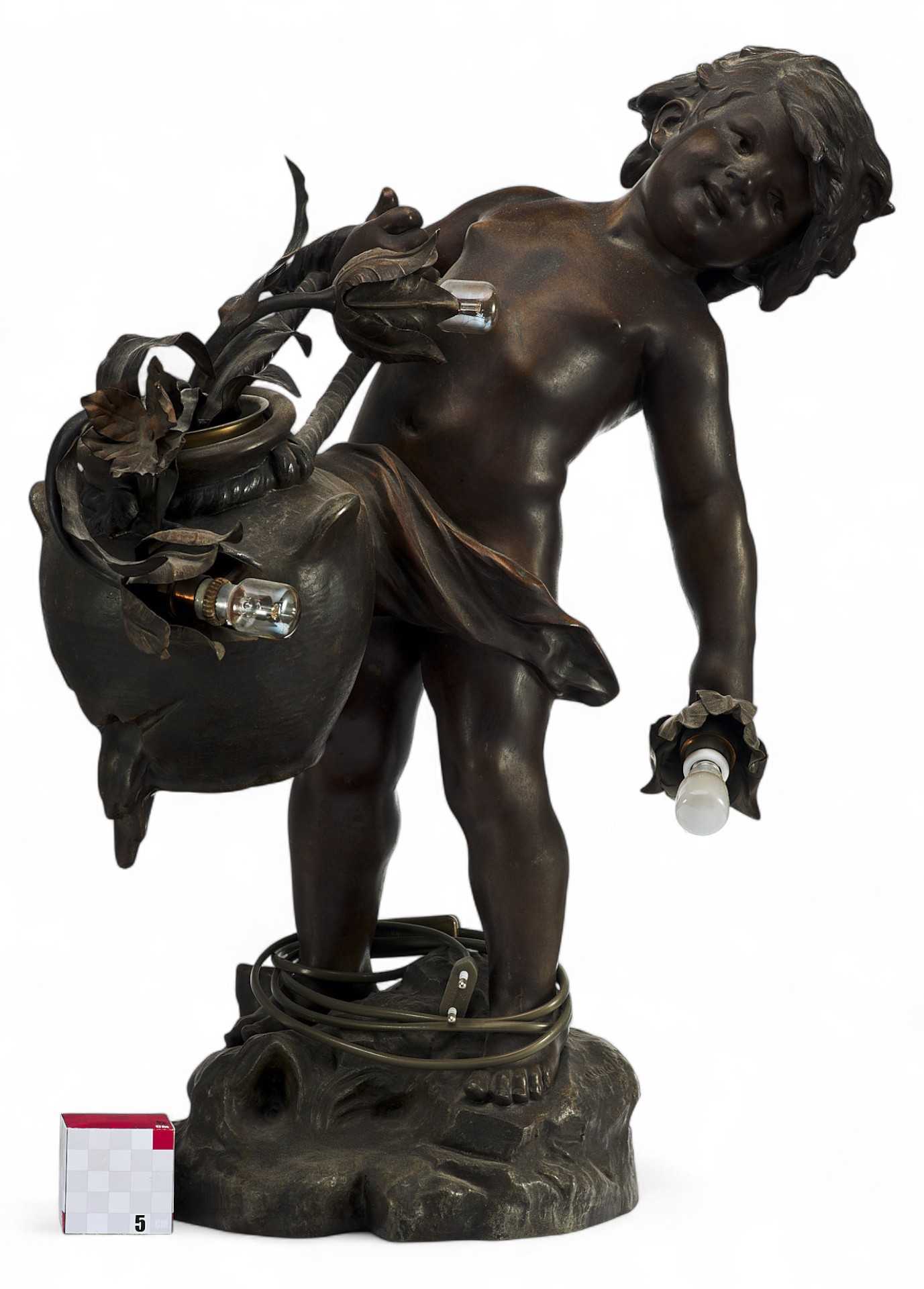 Светильник в виде скульптуры мальчика несущего корзину цветов. На основании светильника авторская подпись: «Auguste Moreau». Подпись по манере начертания совпадает с подписью французского скульптора Августа Моро (1834-1917), специализировавшегося на фигурах юных чувственных девушек и юношей. Auguste Moreau (1834-1917) - родился в Париже в семье скульптора ЖанаБатиста Моро. Первоначальное художественное образование получил у своего отца, который учился у Aimé Millet, Augustin-a Drumont-a and Jean-a Thomas.