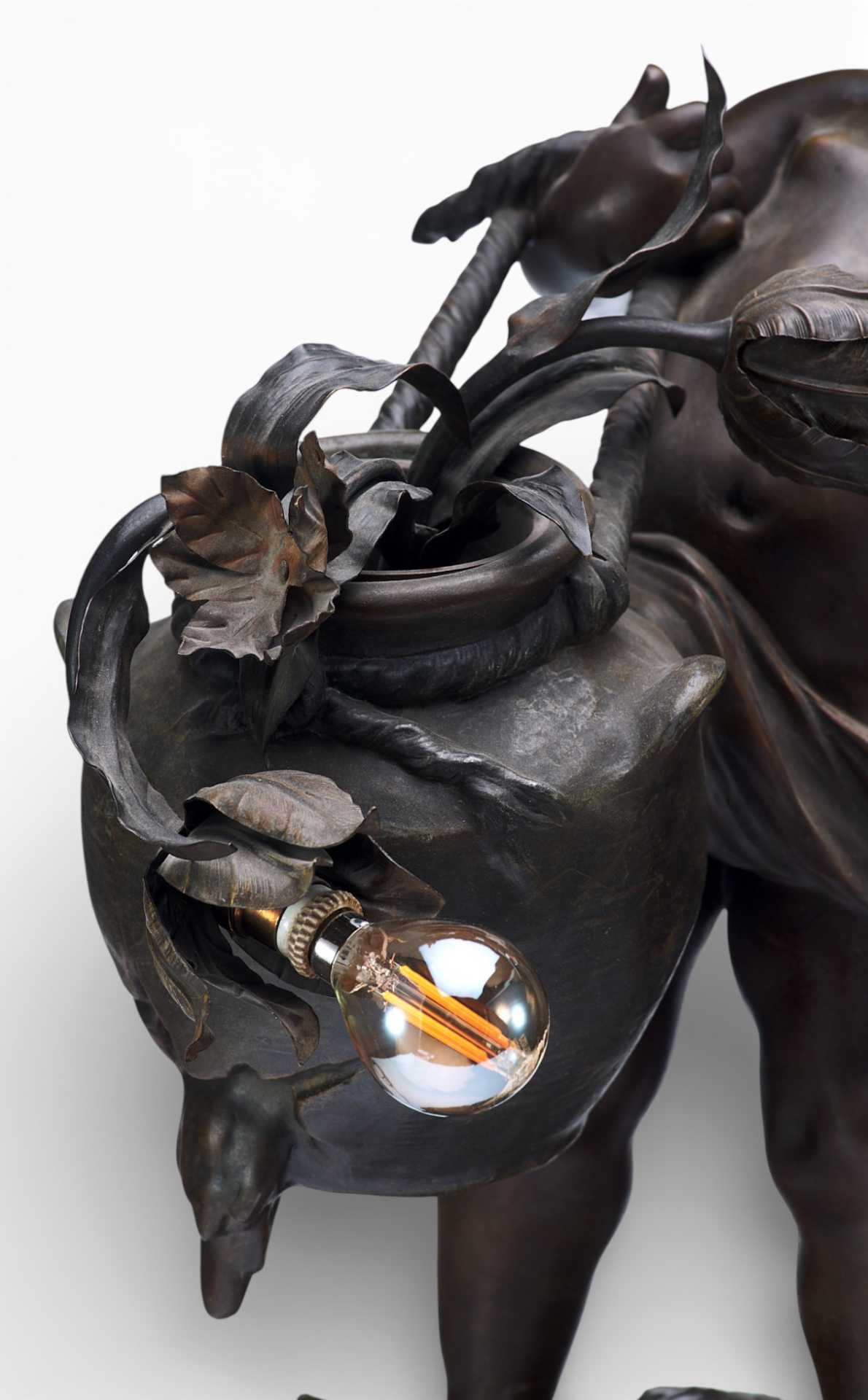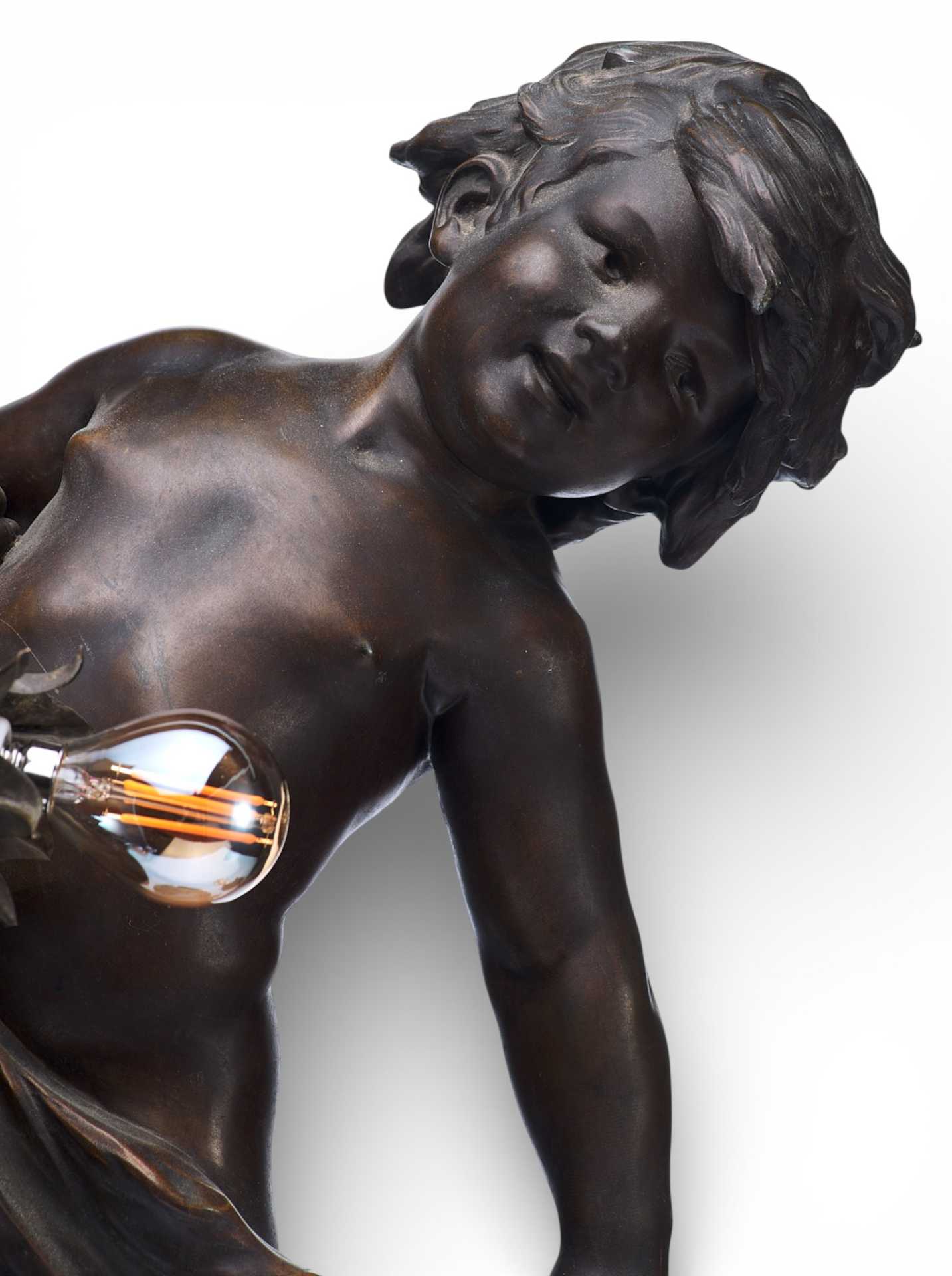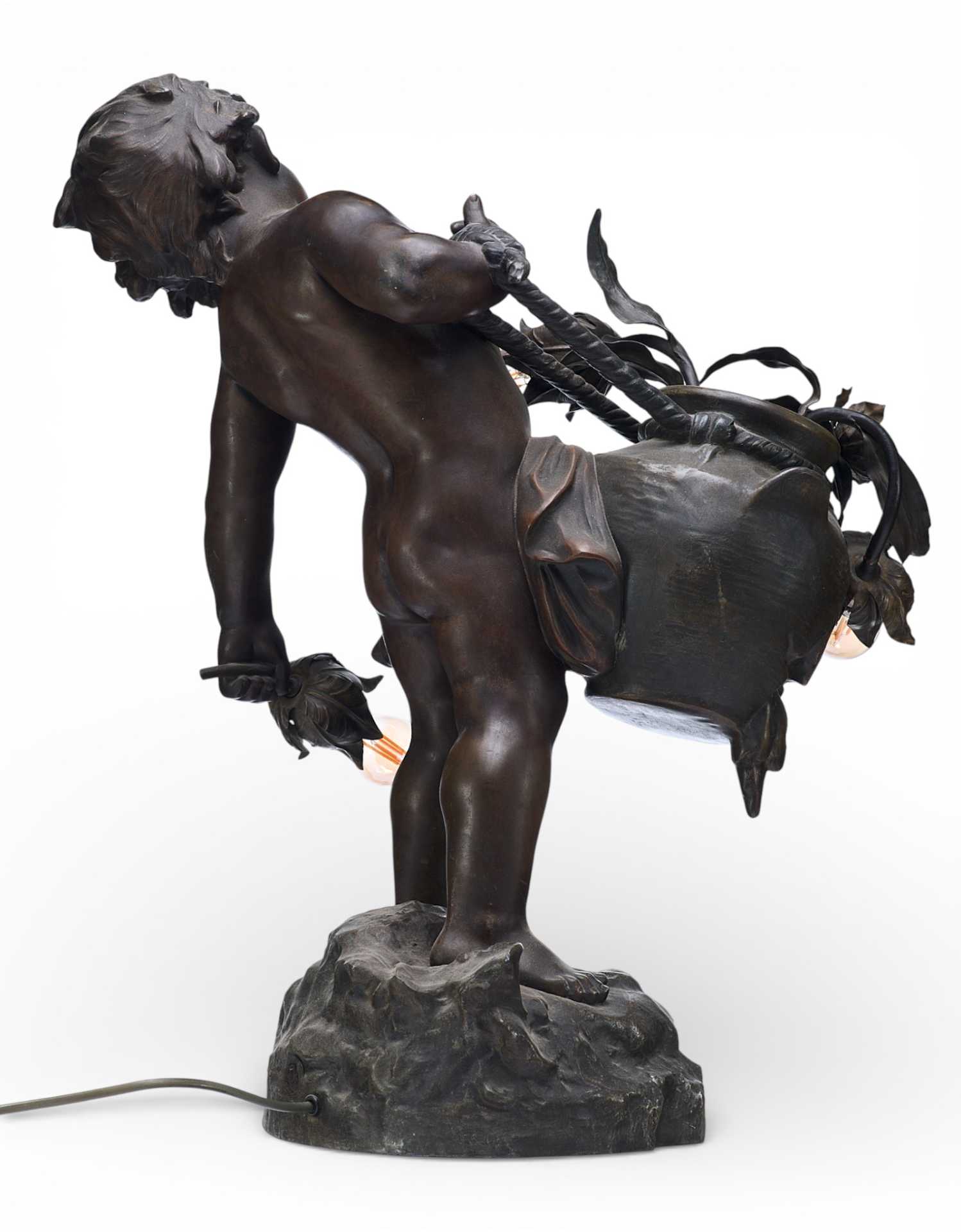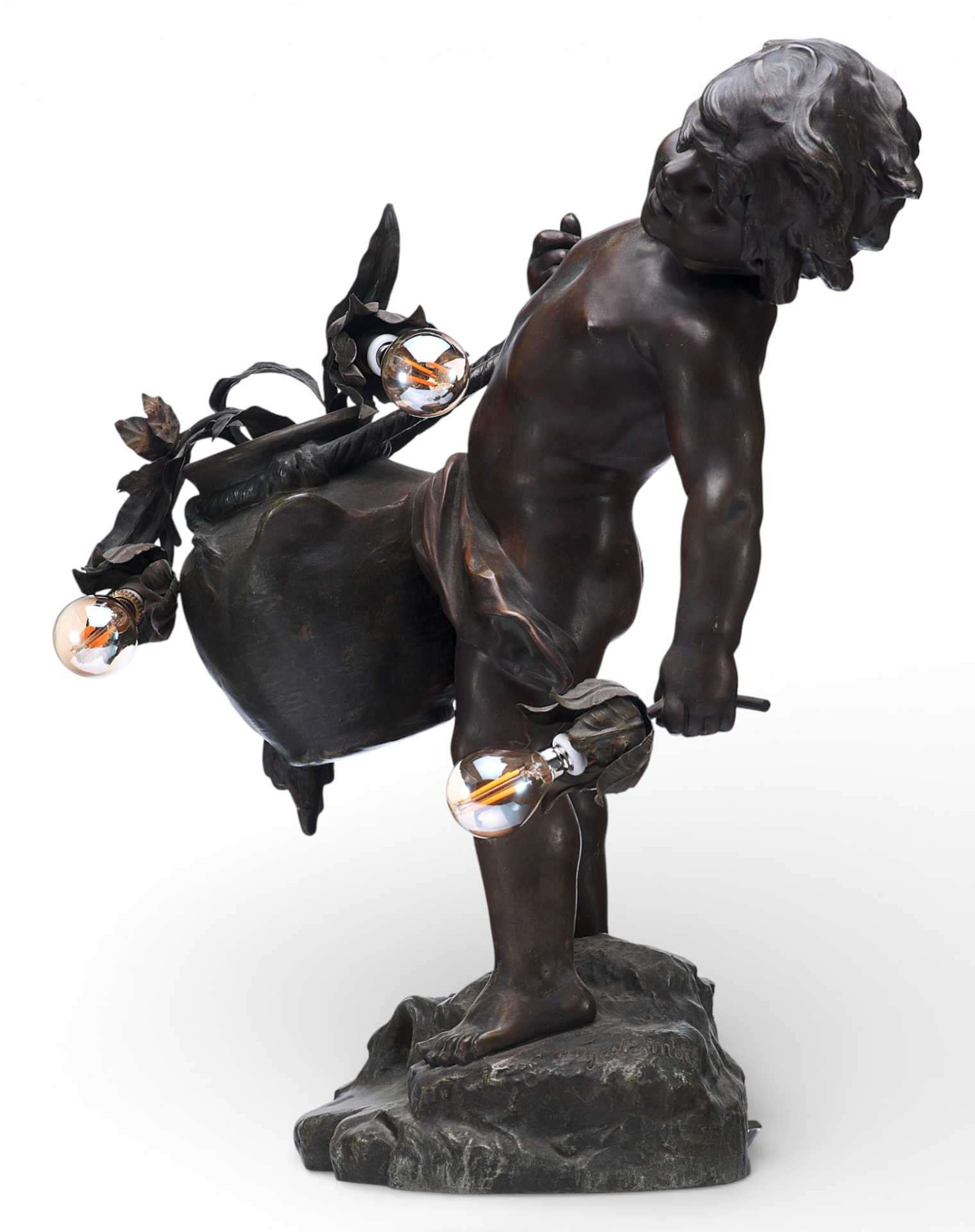 Светильник в виде скульптуры мальчика несущего корзину цветов. На основании светильника авторская подпись: «Auguste Moreau». Подпись по манере начертания совпадает с подписью французского скульптора Августа Моро (1834-1917), специализировавшегося на фигурах юных чувственных девушек и юношей. Auguste Moreau (1834-1917) - родился в Париже в семье скульптора ЖанаБатиста Моро. Первоначальное художественное образование получил у своего отца, который учился у Aimé Millet, Augustin-a Drumont-a and Jean-a Thomas.