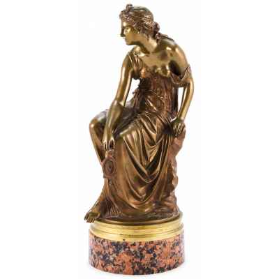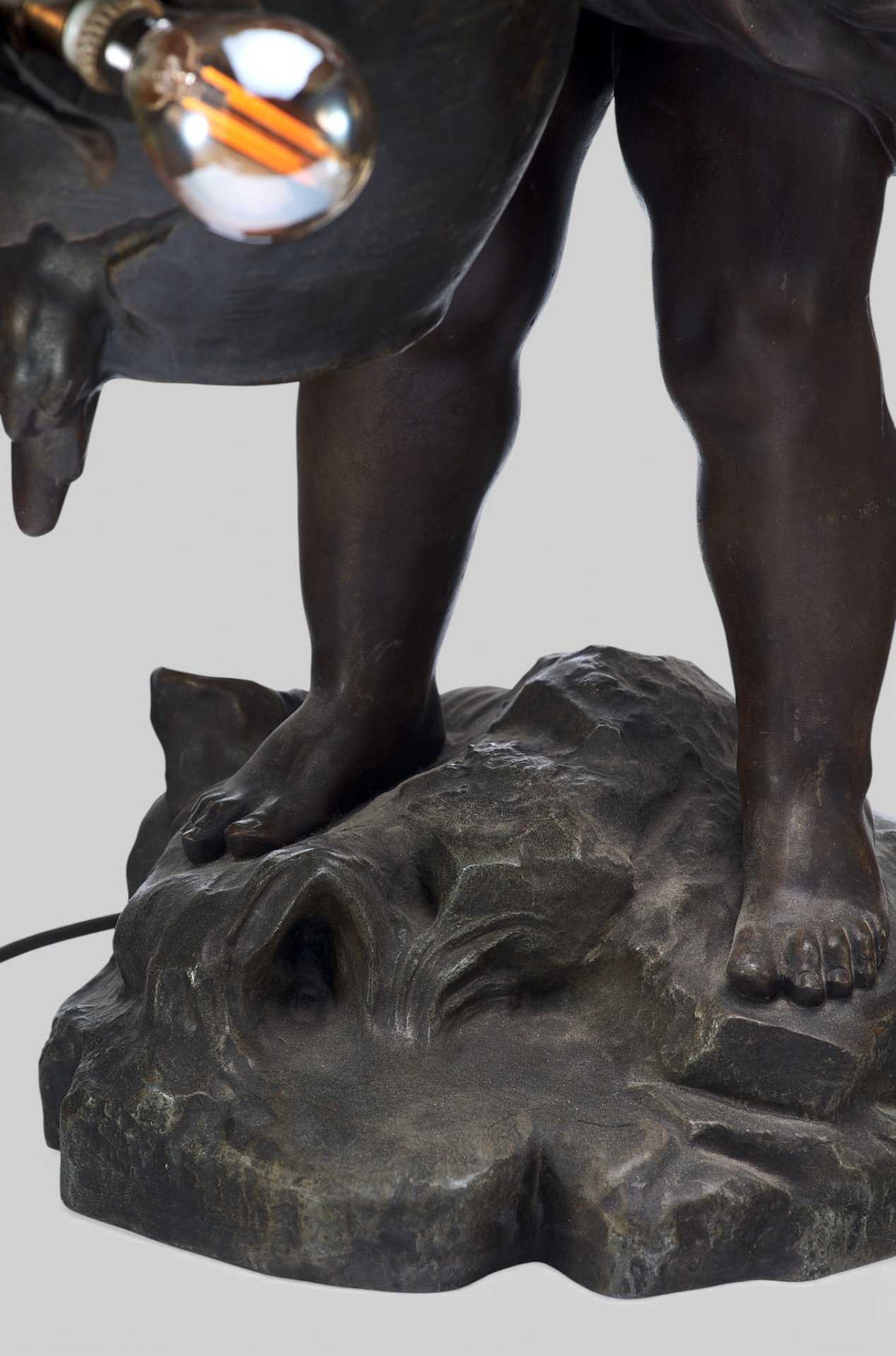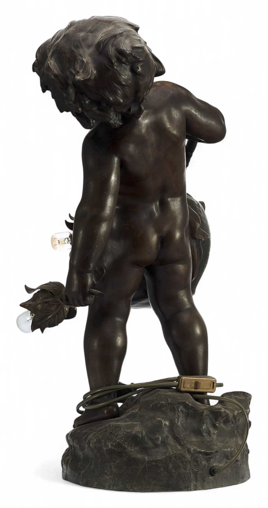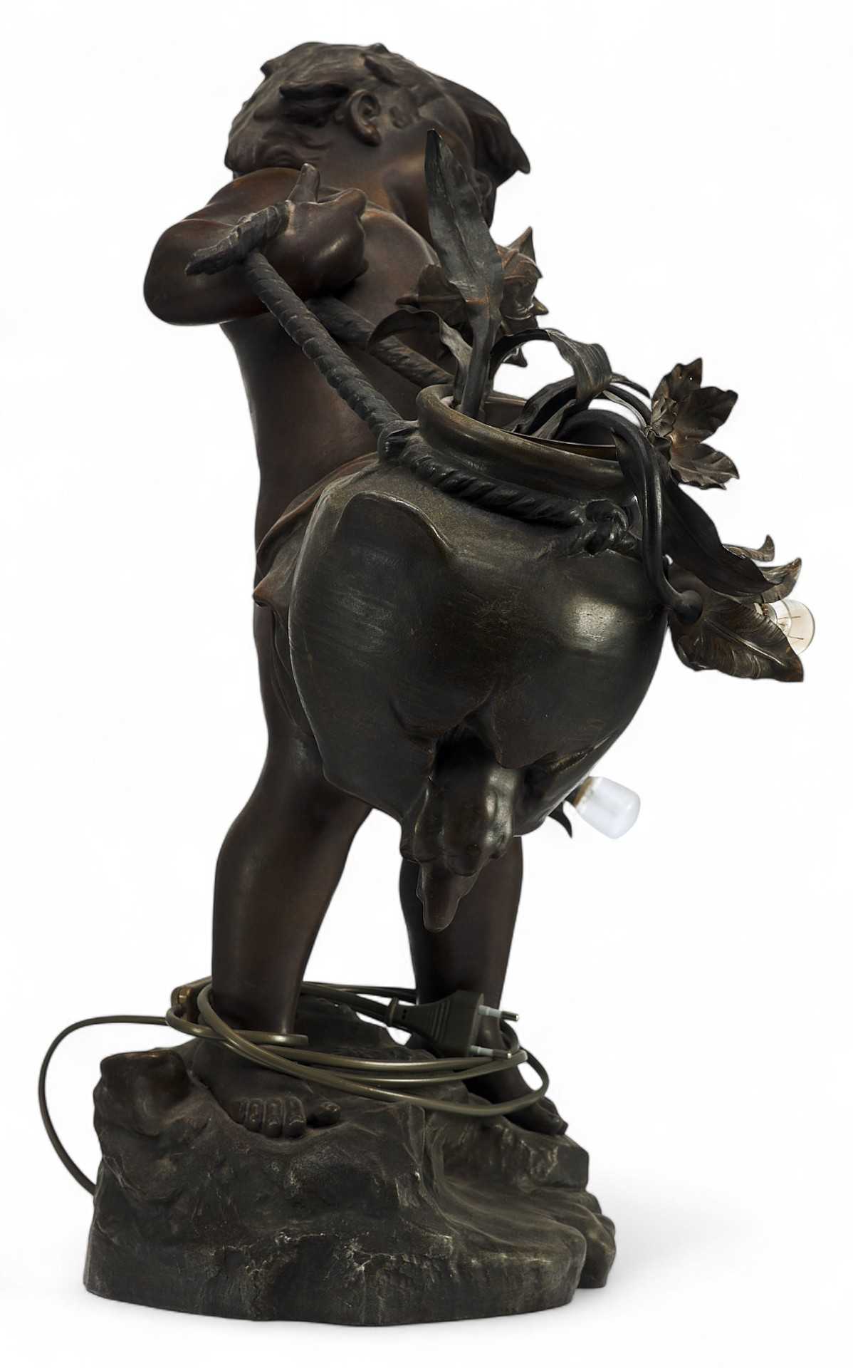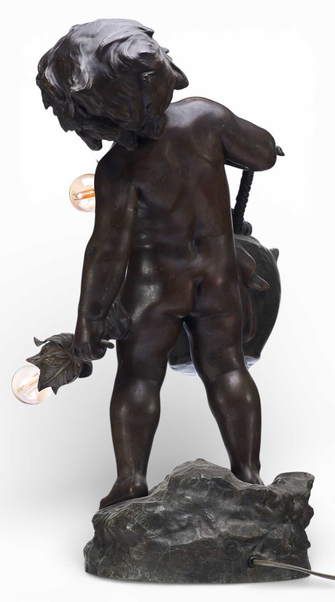 Светильник в виде скульптуры мальчика несущего корзину цветов. На основании светильника авторская подпись: «Auguste Moreau». Подпись по манере начертания совпадает с подписью французского скульптора Августа Моро (1834-1917), специализировавшегося на фигурах юных чувственных девушек и юношей. Auguste Moreau (1834-1917) - родился в Париже в семье скульптора ЖанаБатиста Моро. Первоначальное художественное образование получил у своего отца, который учился у Aimé Millet, Augustin-a Drumont-a and Jean-a Thomas.