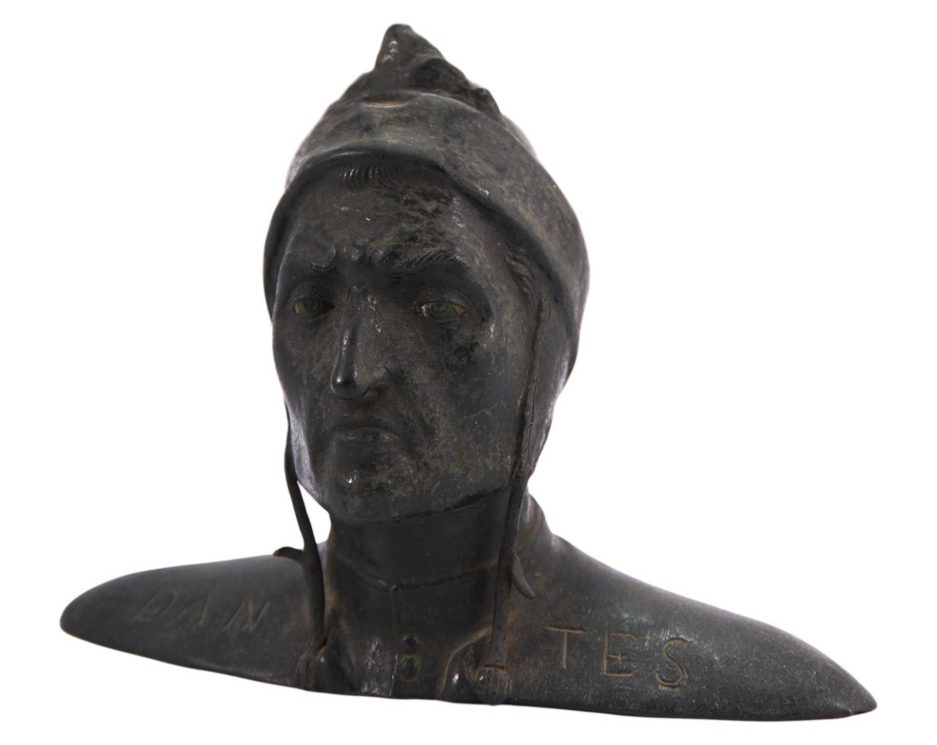 На плечах бюста раздельно написаны две половины его имени: «DAN» и «TES».Дйнте Алигьёри (итал. Dante Alighieri), полное имяДуранте делъи Алигьери (май/июнь 1265 — 13 или 14 сентября 1321) — итальянский поэт, один из основоположников