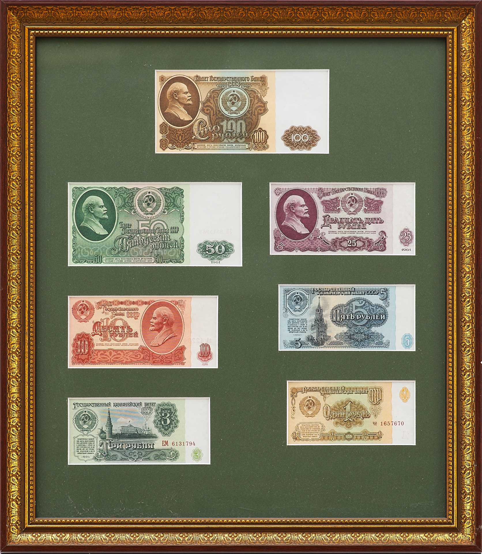 Перед нами коллекционная плакетка с набором советских банкнот образца 1961 года, выпущенных после проведения денежной реформы в СССР. Композиция включает семь купюр номиналом 1, 3, 5, 10, 25, 50 и 100 рублей, оформленных в паспарту и заключённых в деревянную раму.