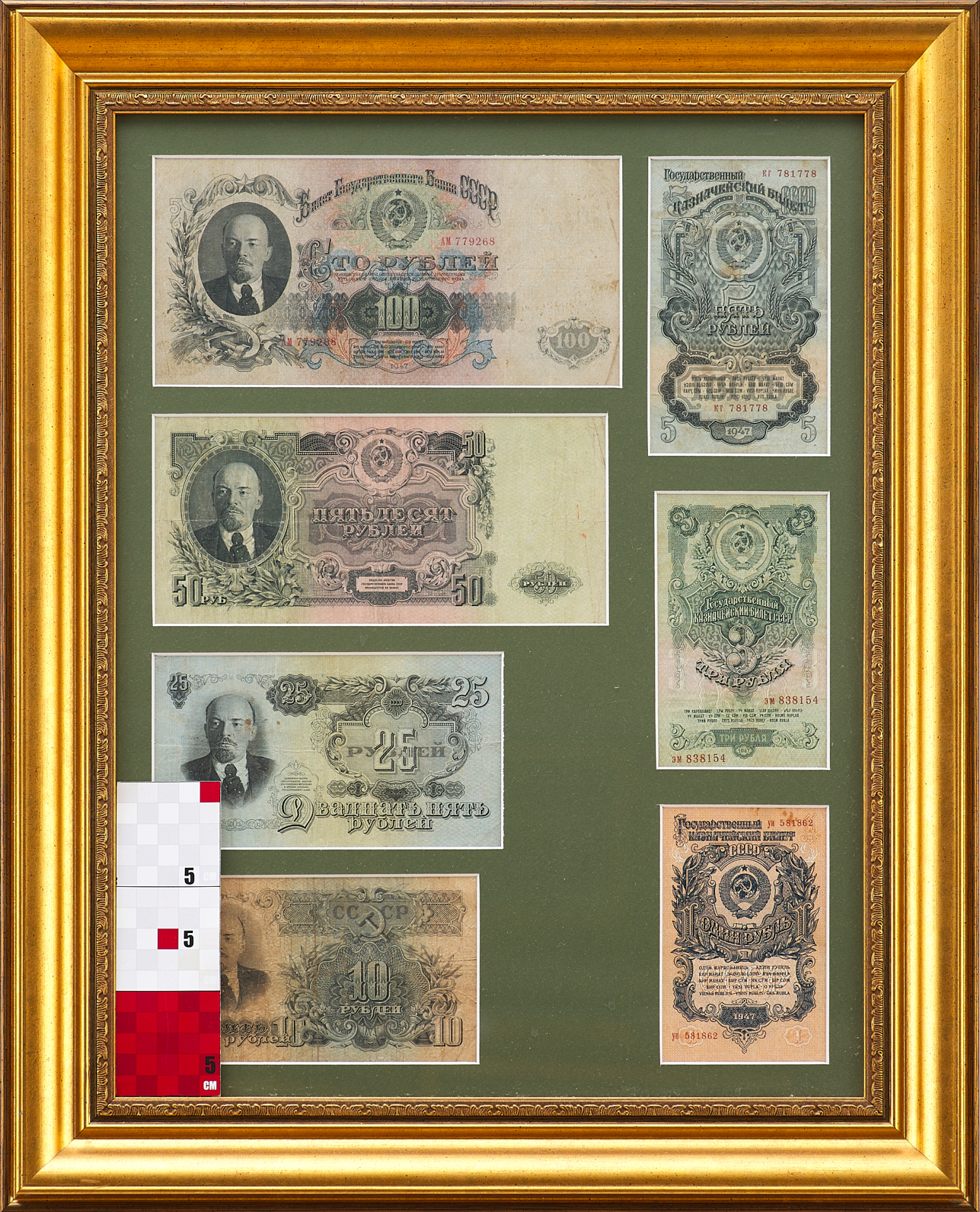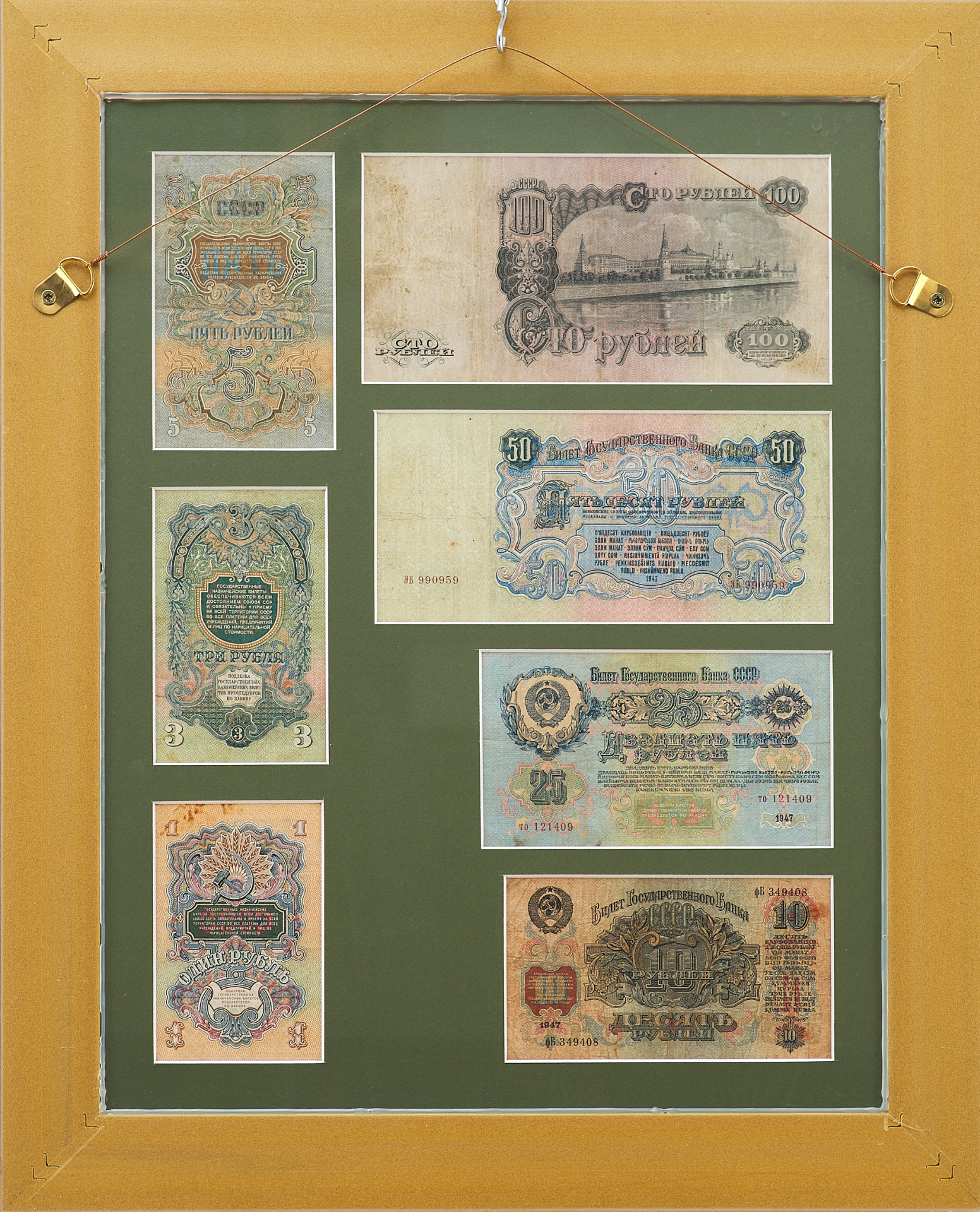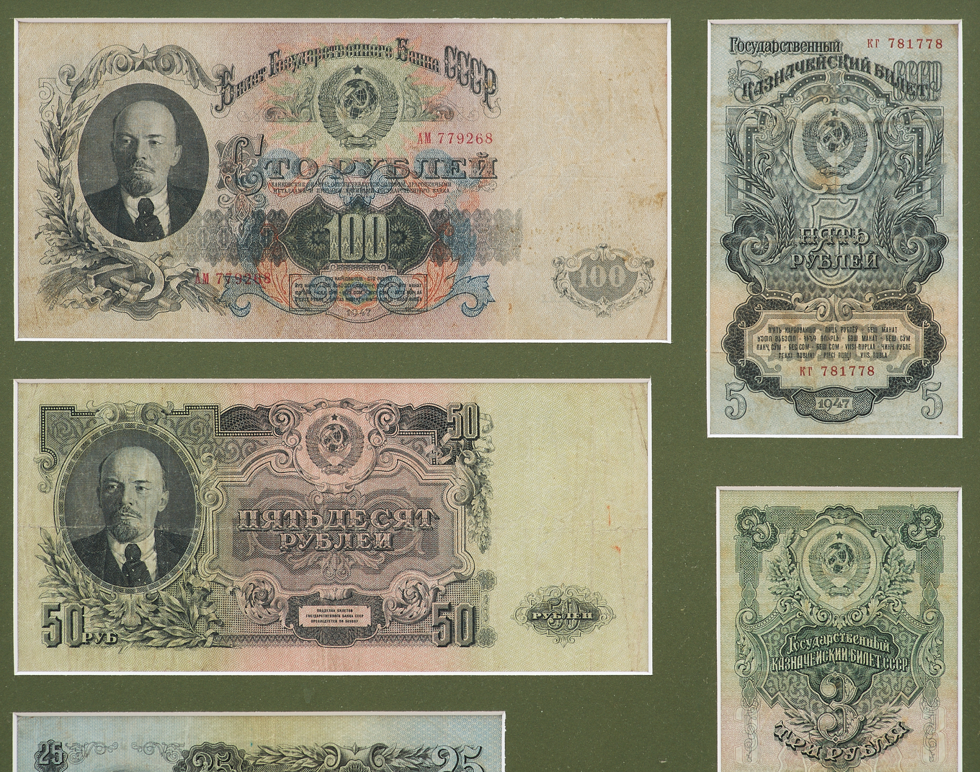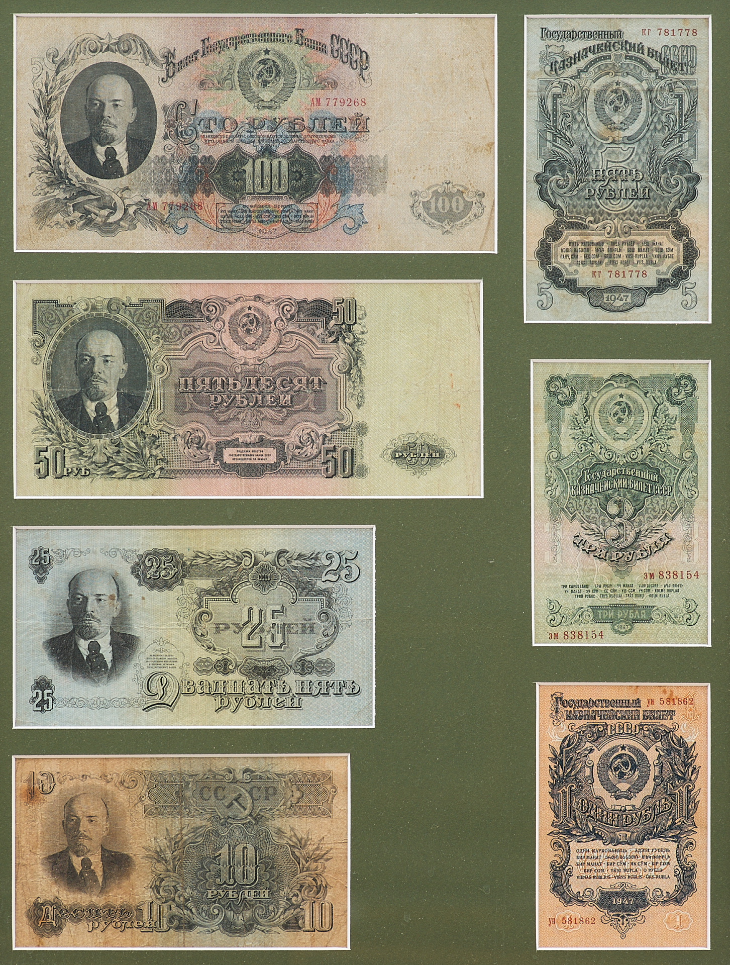 Планшет с набором купюр образца 1947г., номиналом 1,3,5,10,25,50,100 руб. СССР 1947-1961 гг