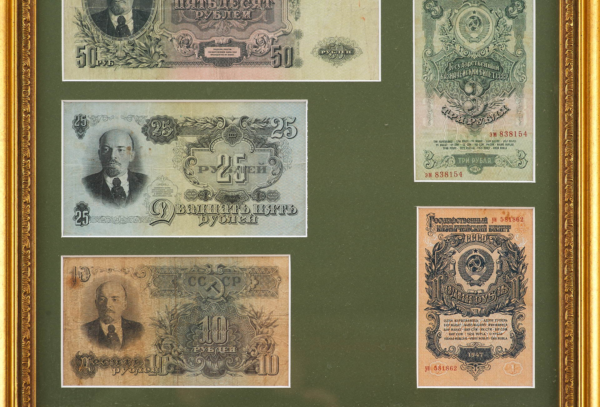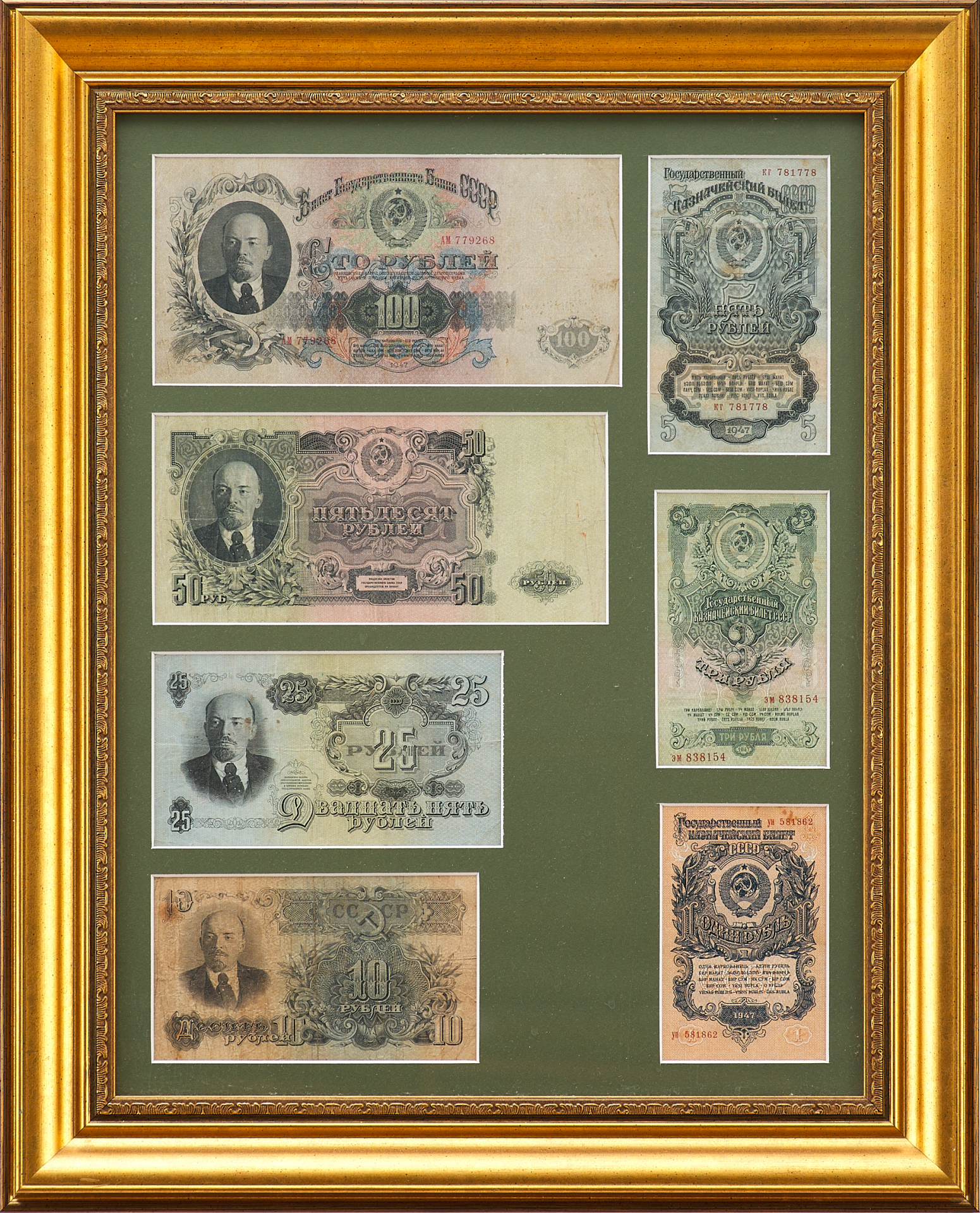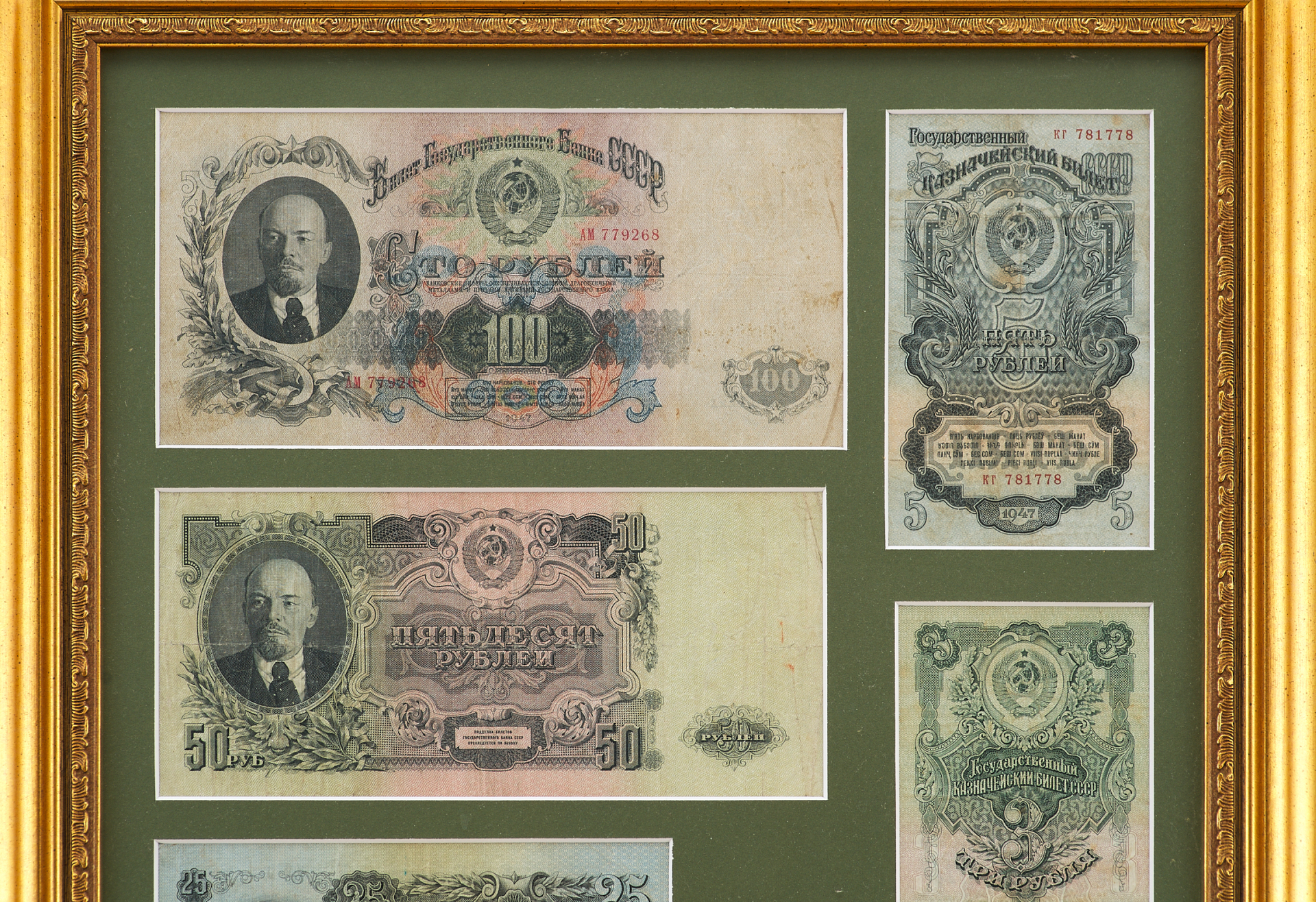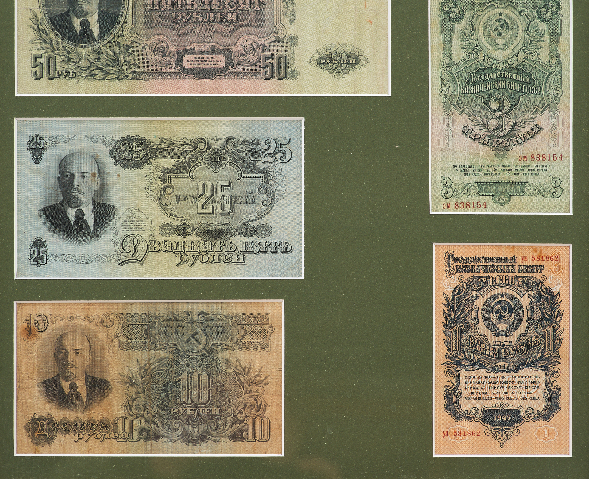Планшет с набором купюр образца 1947г., номиналом 1,3,5,10,25,50,100 руб. СССР 1947-1961 гг