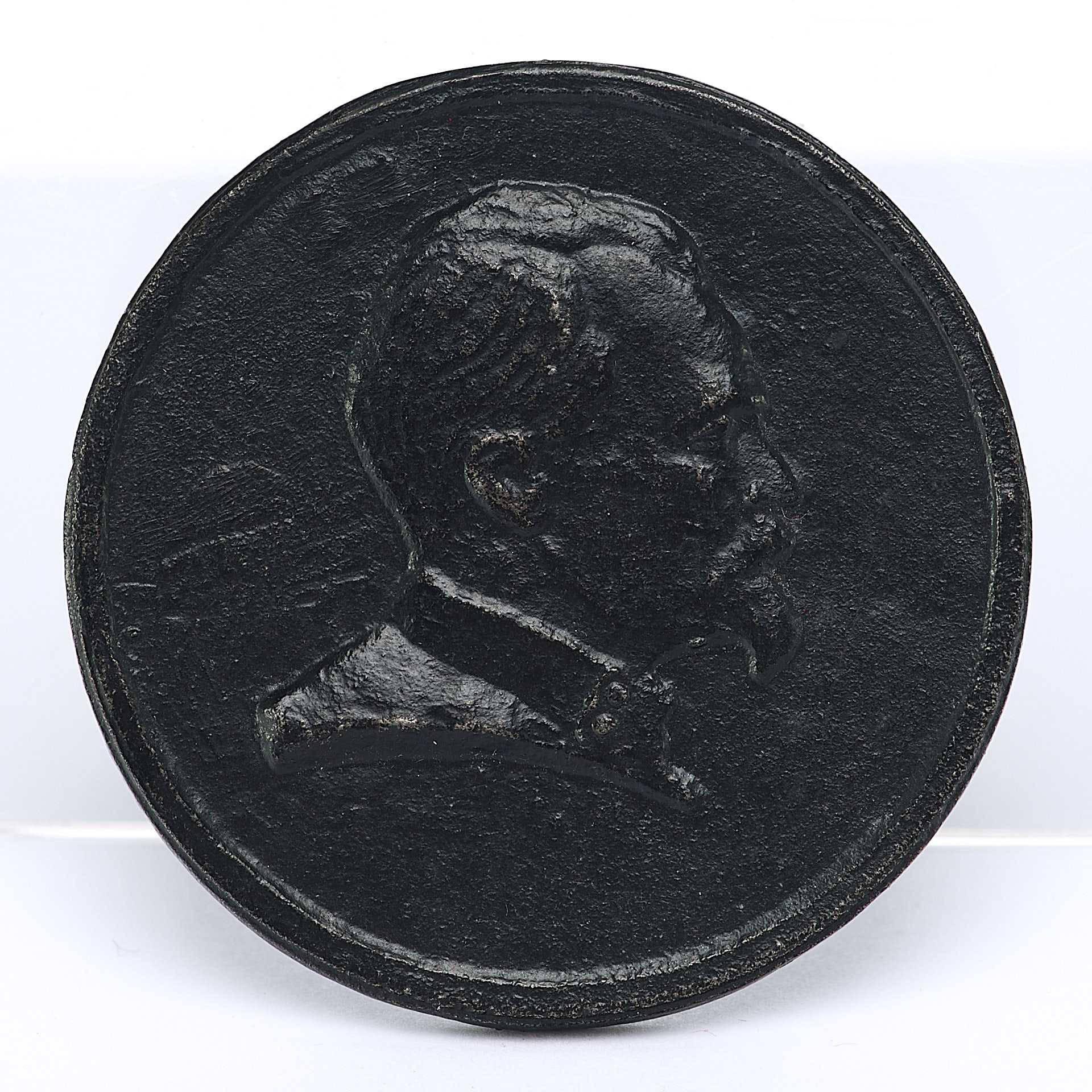 Медаль круглая, двусторонняя. Аверс: в центре рельефное профильное (вправо) изображение мужчины с усами и бородкой