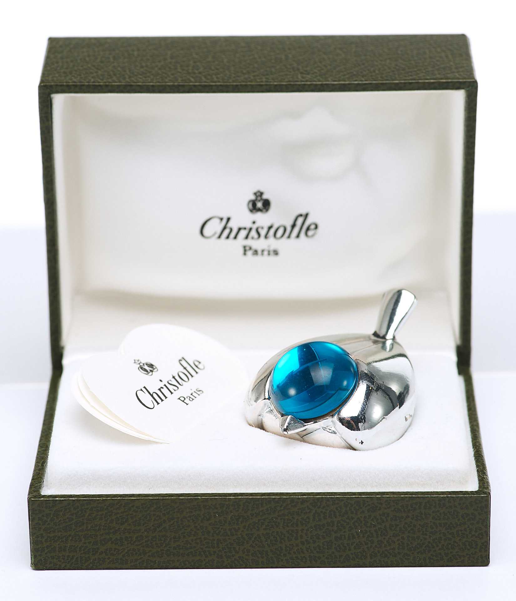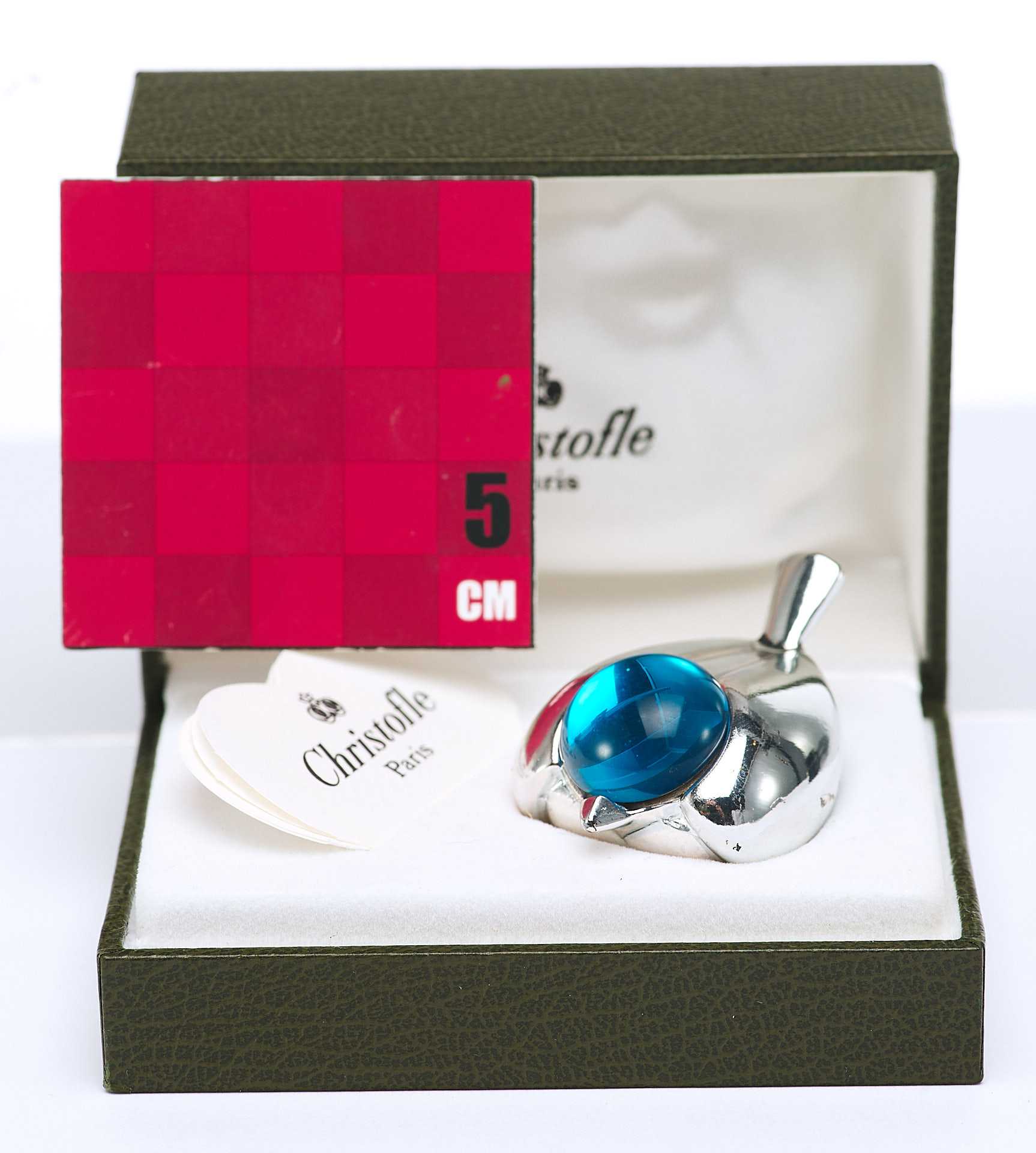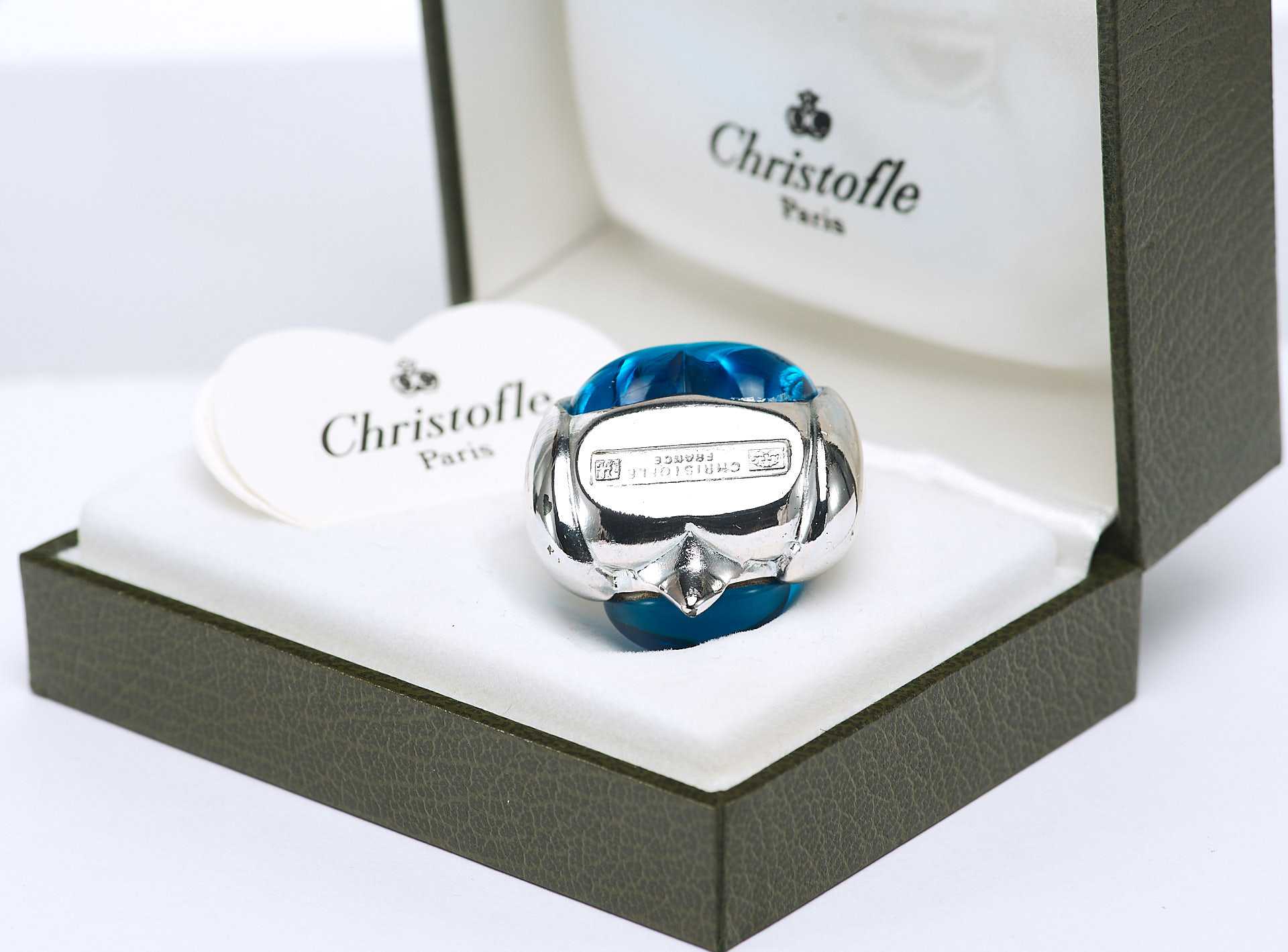 На белой атласной подкладке верхней крышки футляра штамп: Christofíle & Сіе. На изделии штамп в прямоугольном шильдике — Christoffle France. CHRISTOFLE.