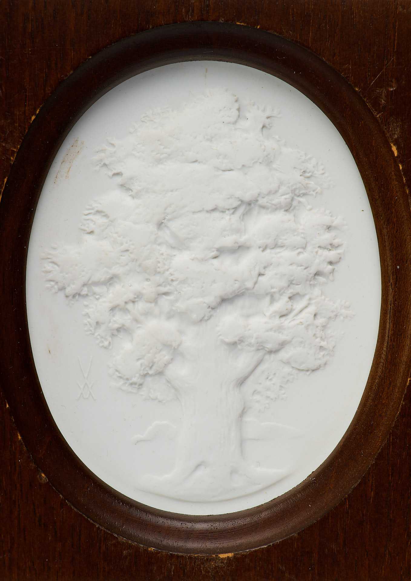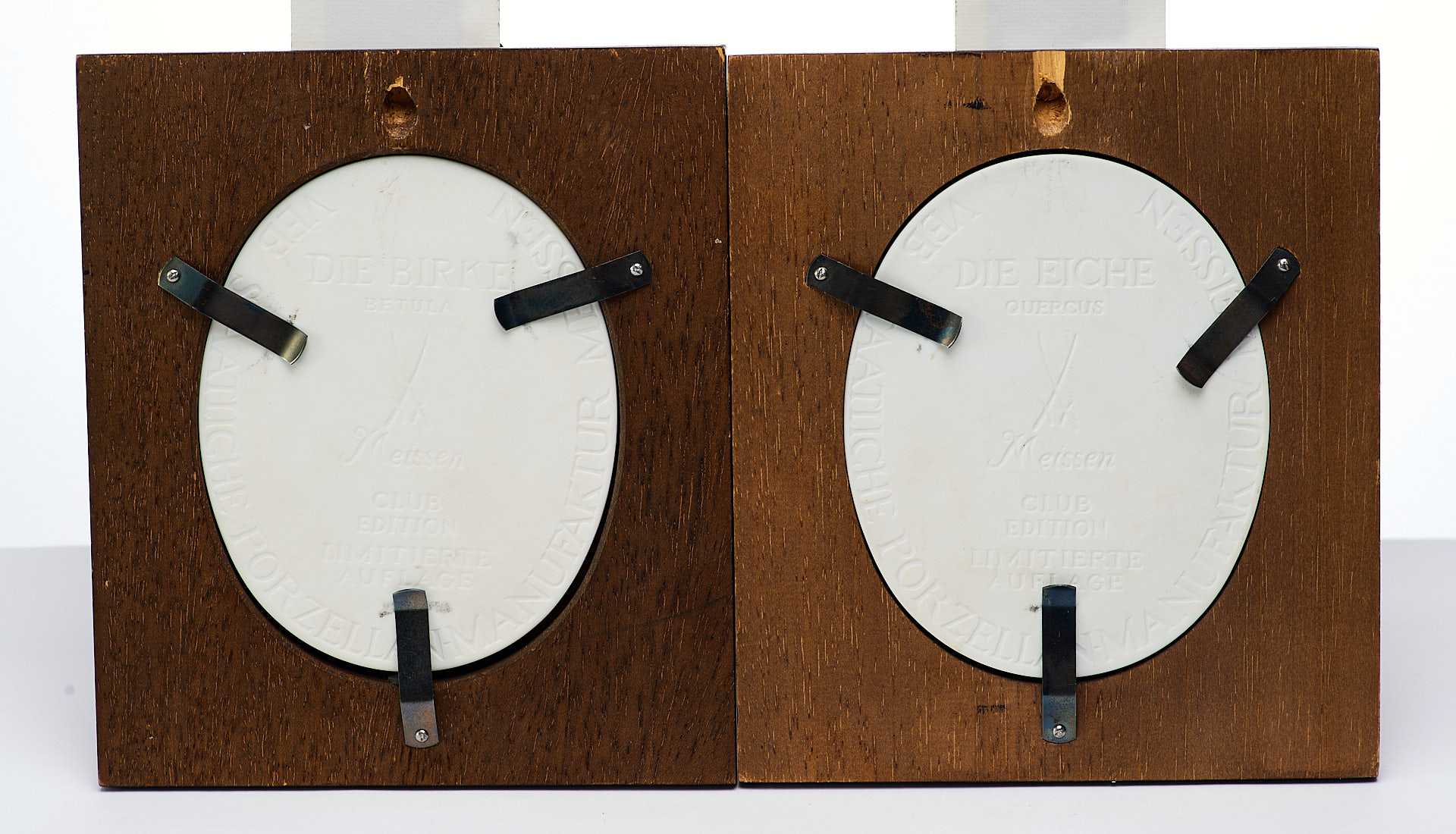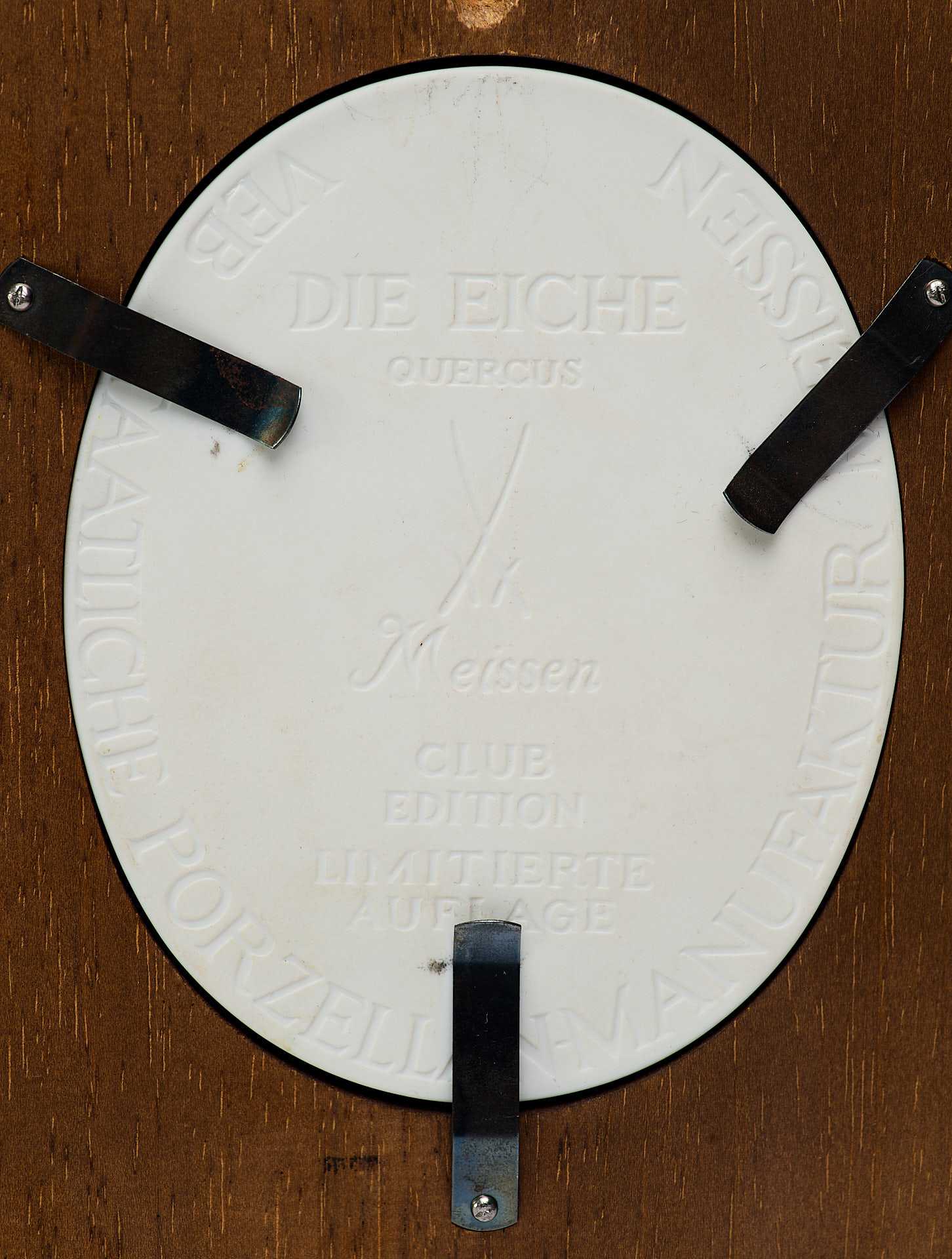 скульптурный фарфоровый рельеф, изображающий дерево - дуб. На обороте обоих панно по краю имеется надпись «в тесте»: «ѴЕВ STAATLICHE PORZELLAN-MANUFACTUR MEISSEN». В центре панно «Дуб» воспроизведено «в тесте» клеймо Мейсенской фарфоровой мануфактуры надпись: «Die Eiche Quercus/ Limitierte Auflage / Club edition».