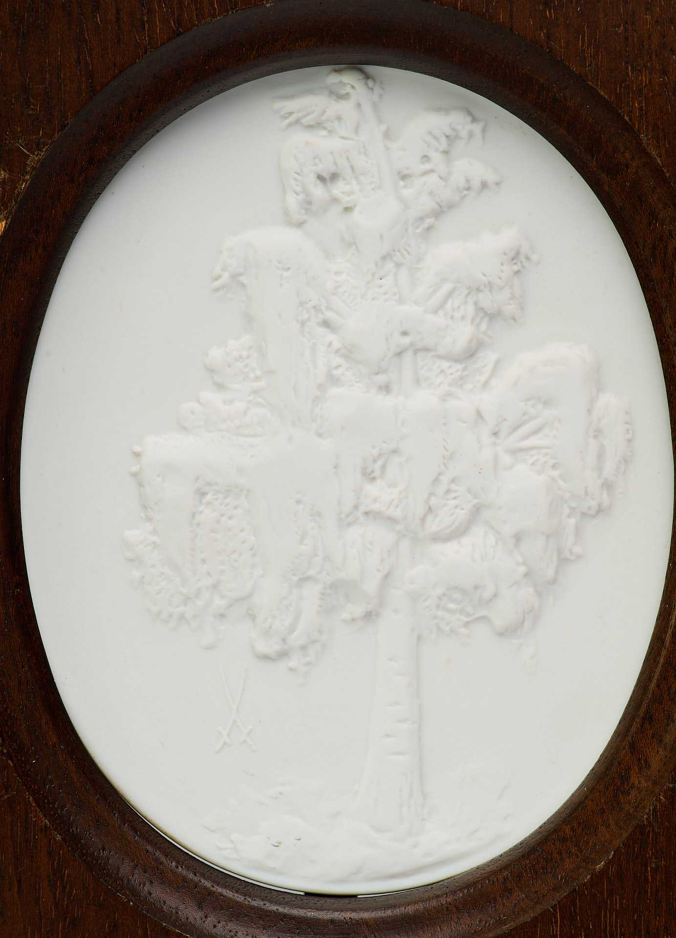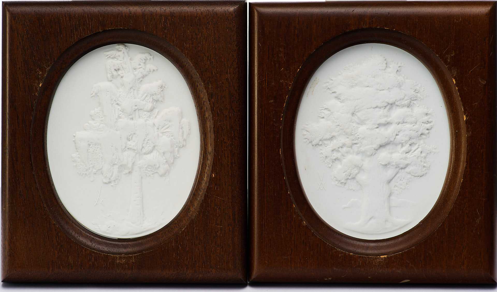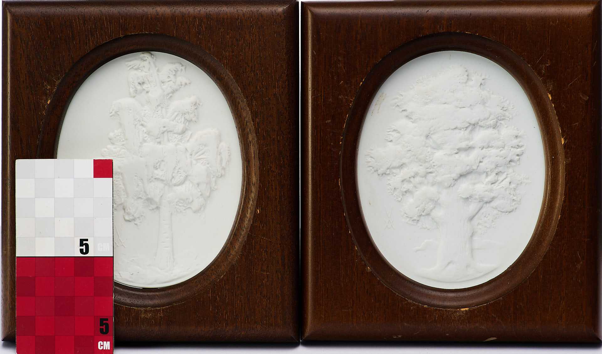 скульптурный фарфоровый рельеф, изображающий дерево - дуб. На обороте обоих панно по краю имеется надпись «в тесте»: «ѴЕВ STAATLICHE PORZELLAN-MANUFACTUR MEISSEN». В центре панно «Дуб» воспроизведено «в тесте» клеймо Мейсенской фарфоровой мануфактуры надпись: «Die Eiche Quercus/ Limitierte Auflage / Club edition».