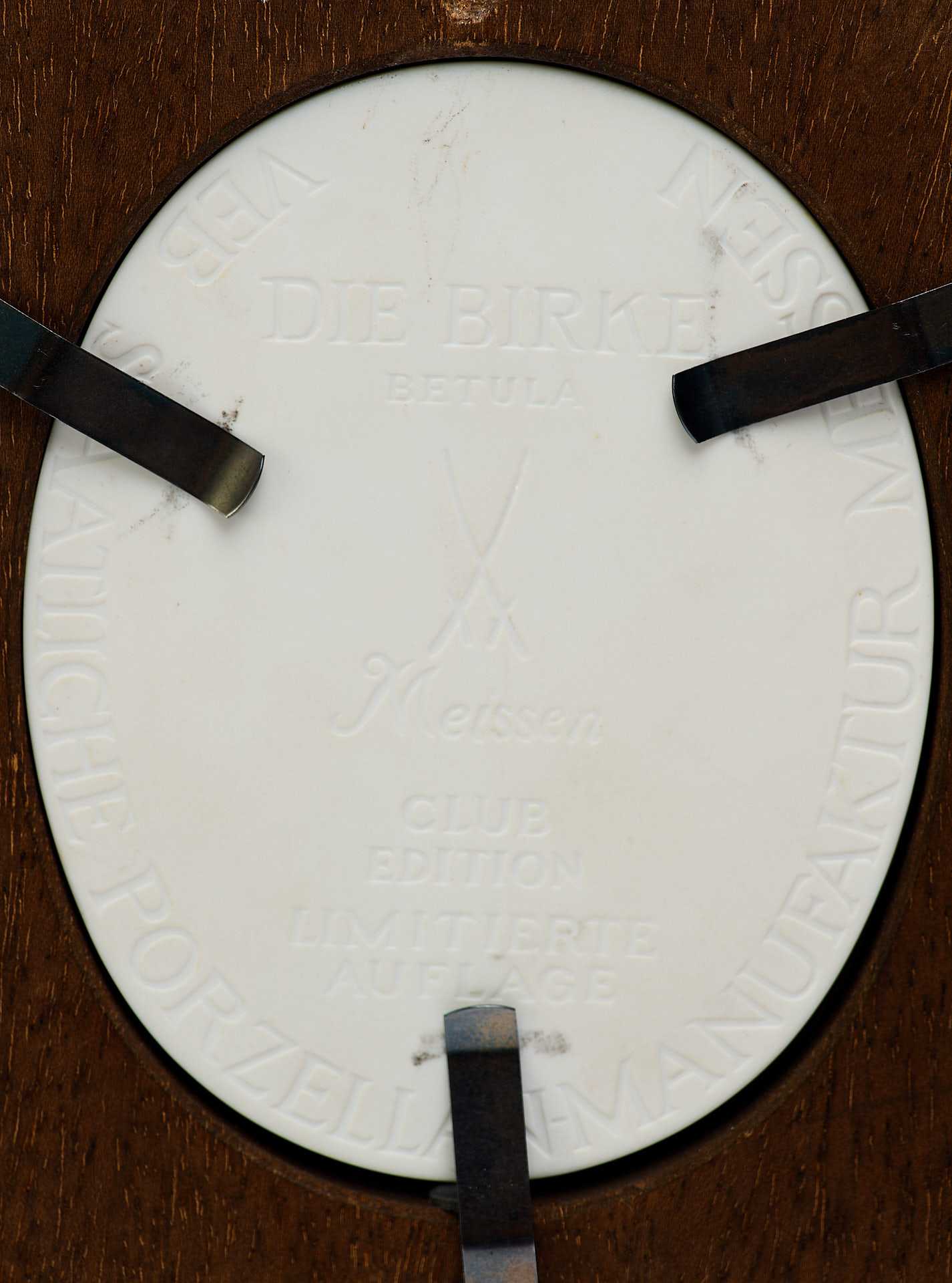 На обороте панно «Береза» такое же клеймо и надпись: «Die Birke Betula / Limitierte Auflage / Club edition». Серия этих фарфоровых панно была выпущена наМейсенской фабрике в 1981-1982 гг. Первоисточником создания таких рельефов