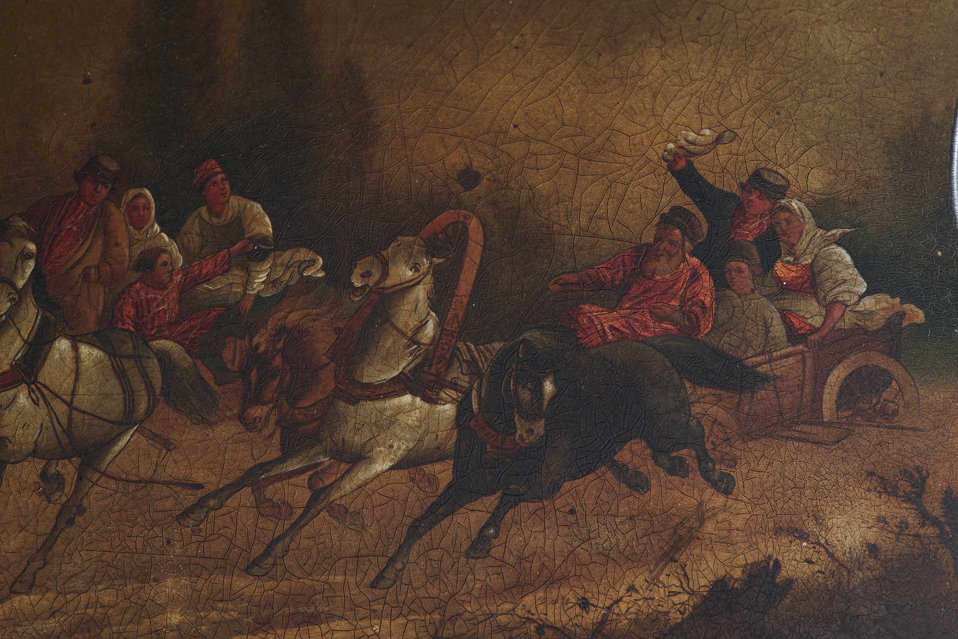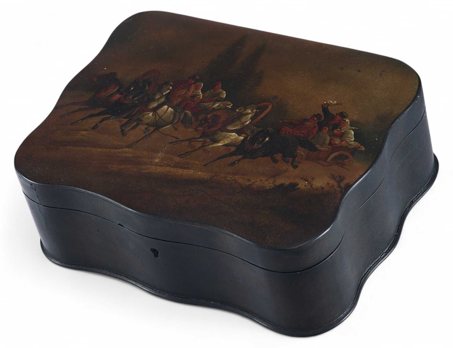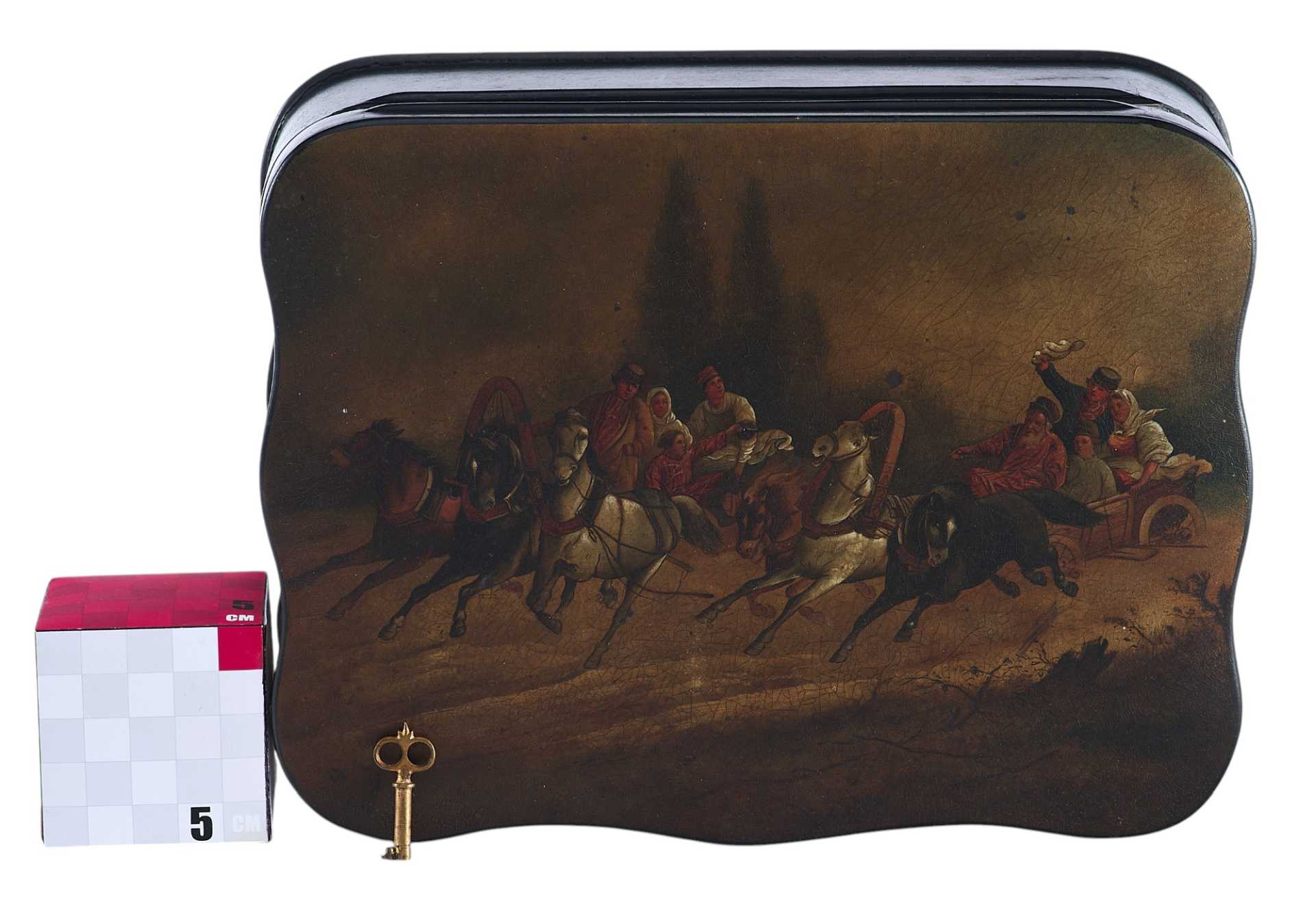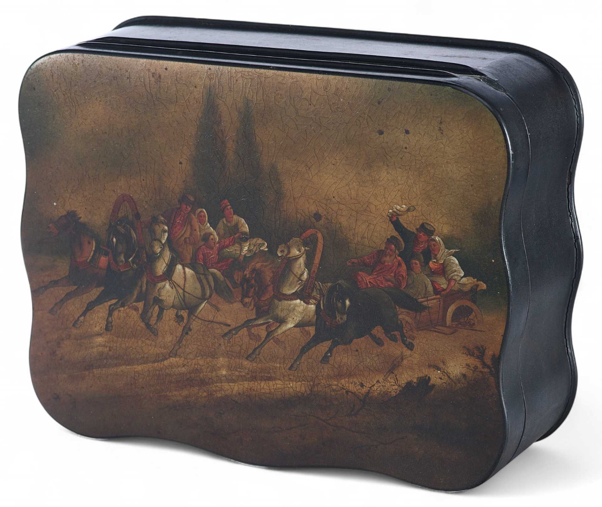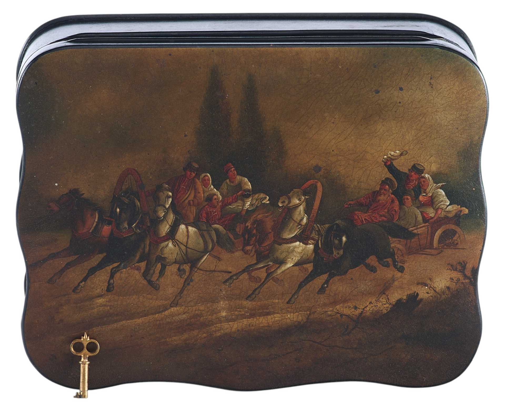 Шкатулка «Две летящие тройки» Россия. Фабрика О.Ф. Вишнякова 1870-гг