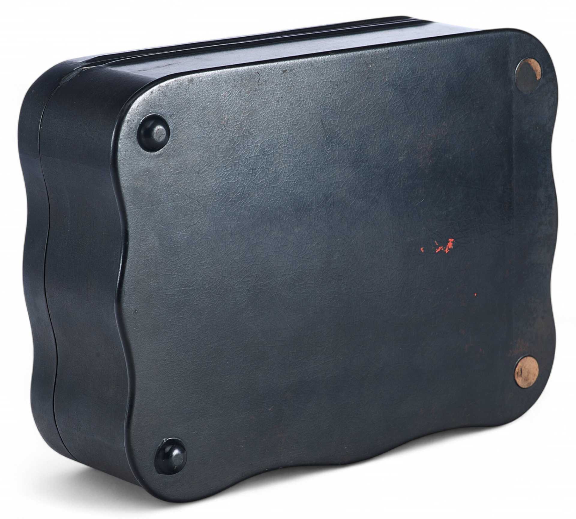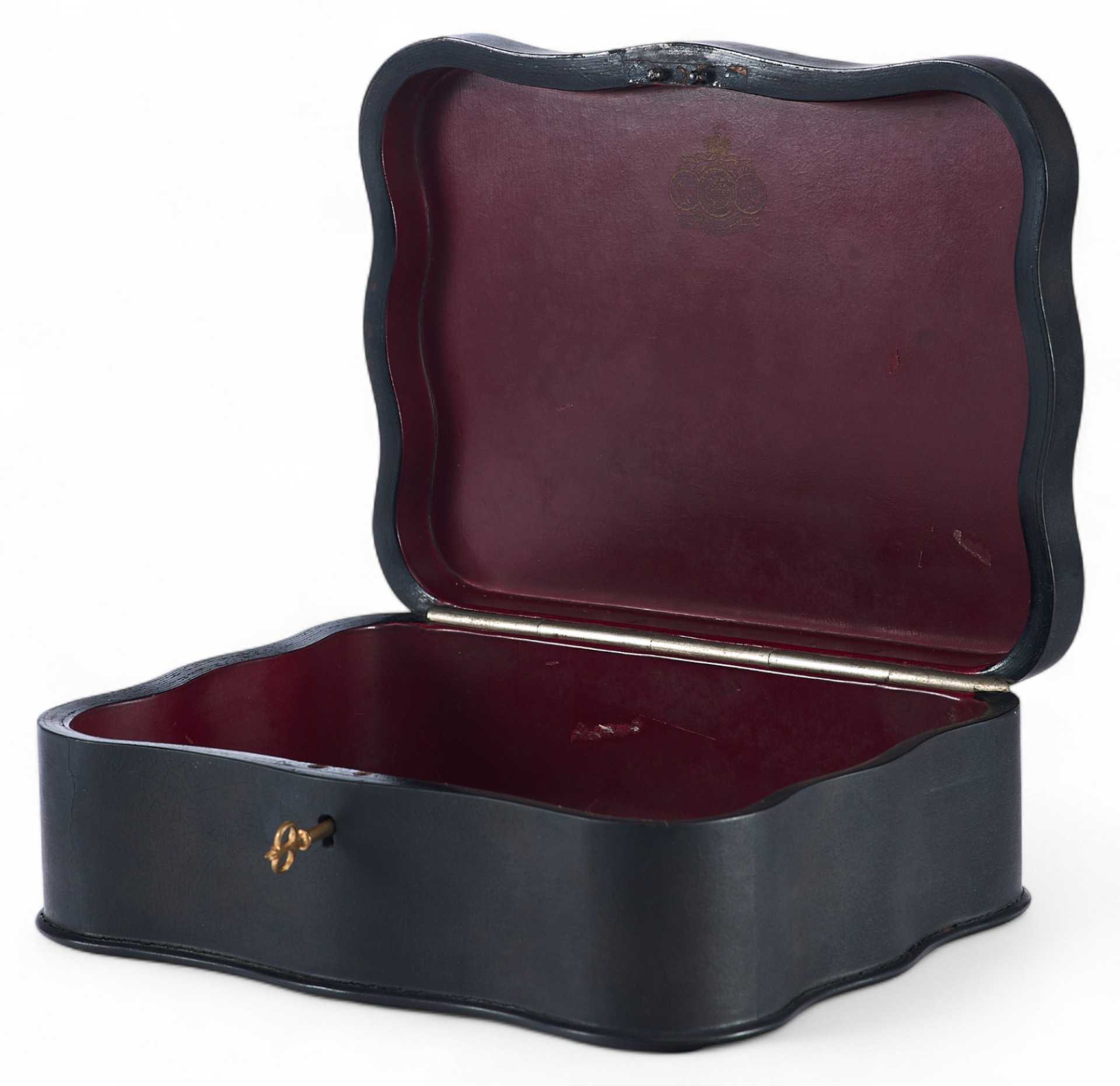 Шкатулка прямоугольной формы волнистыми краями. На лицевой стороне шкатулки изображены две тройки лошадей,