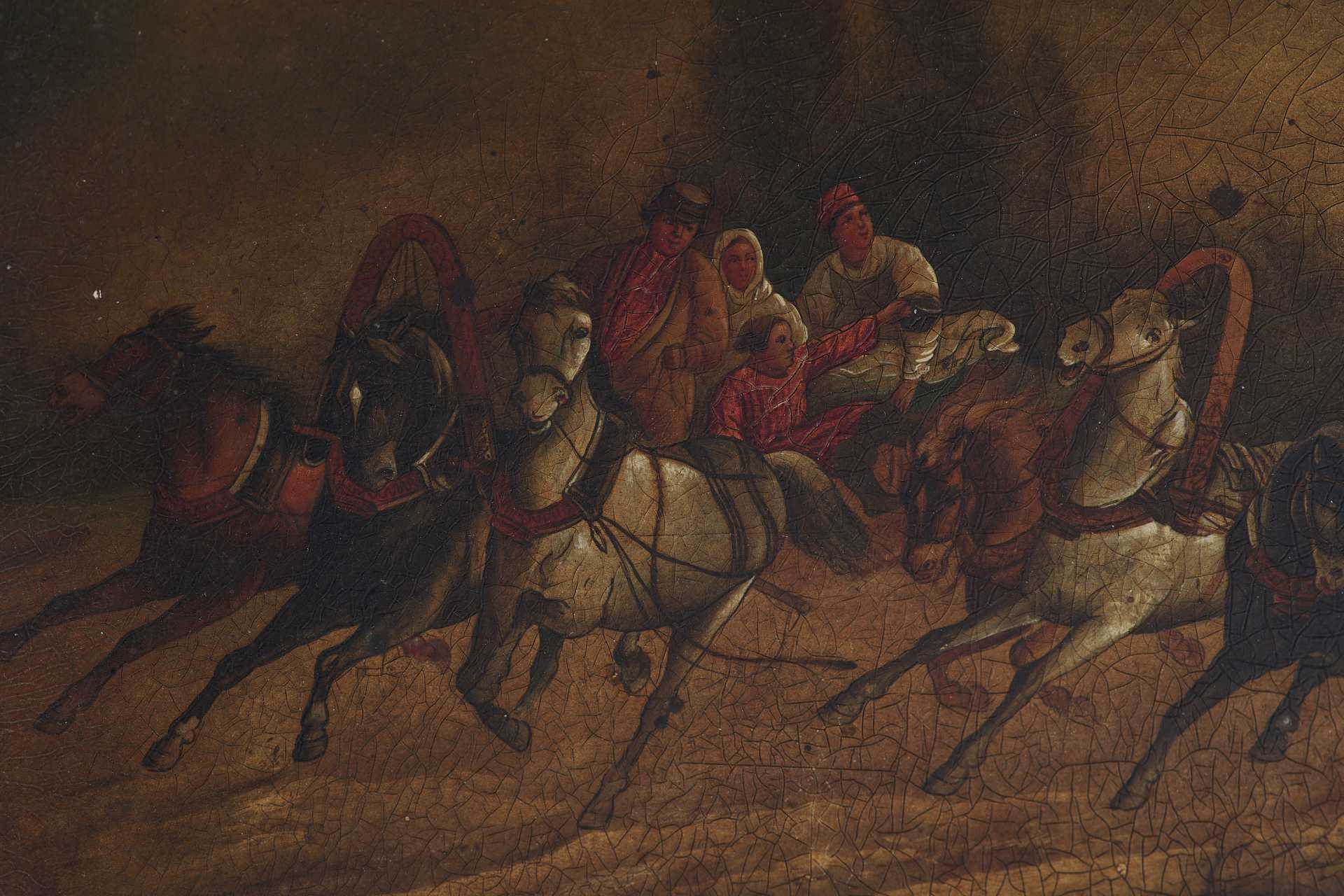несущихся наперегонки. Тройки запряжены в повозки, на которых сидят люди. По их позам и жестам видно, что они с