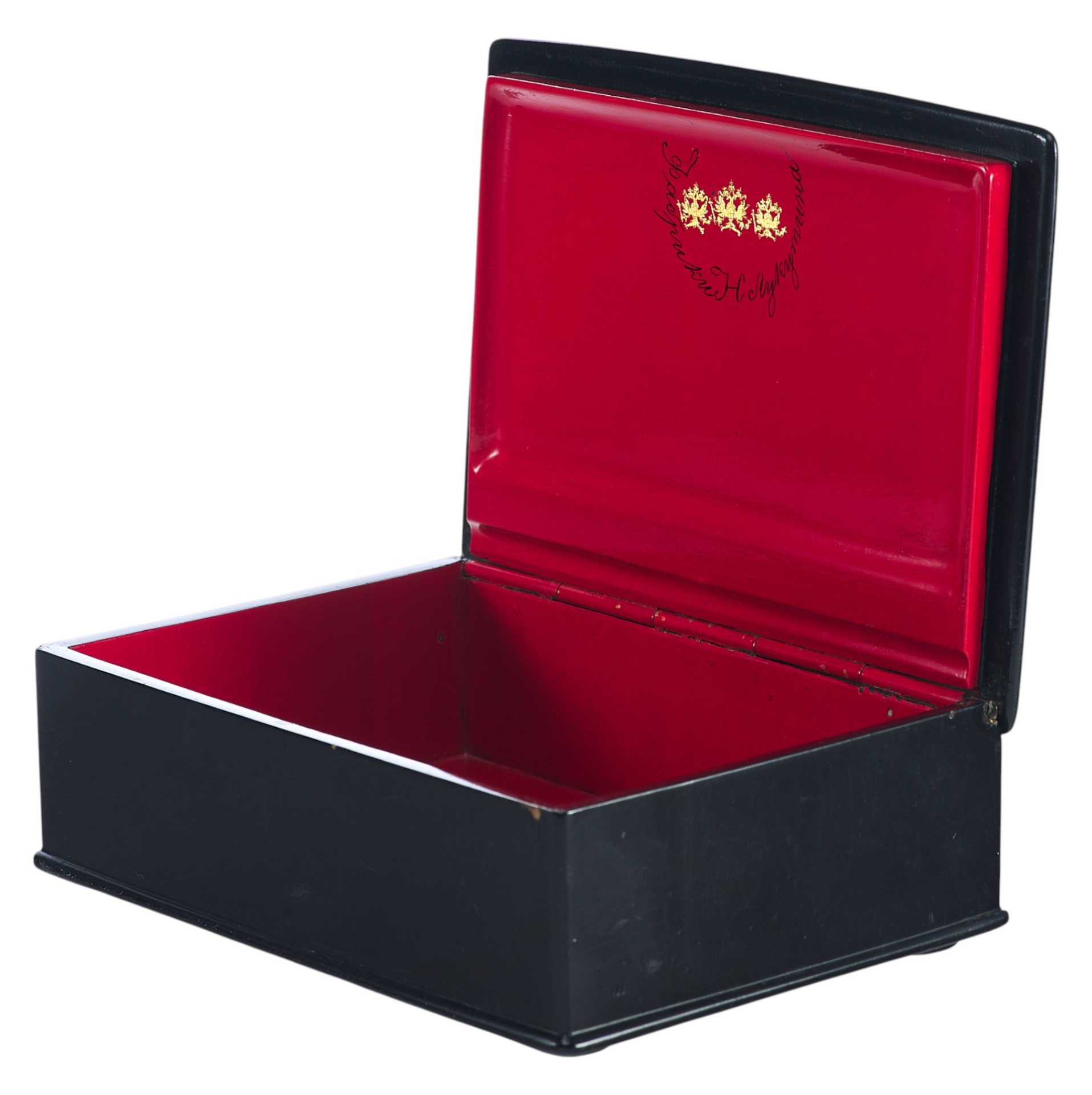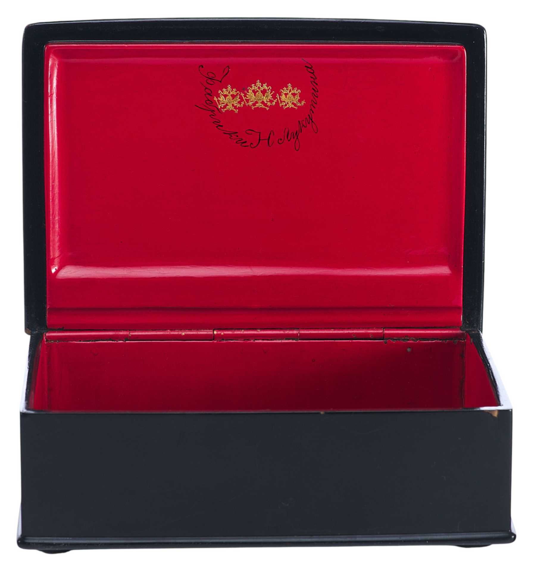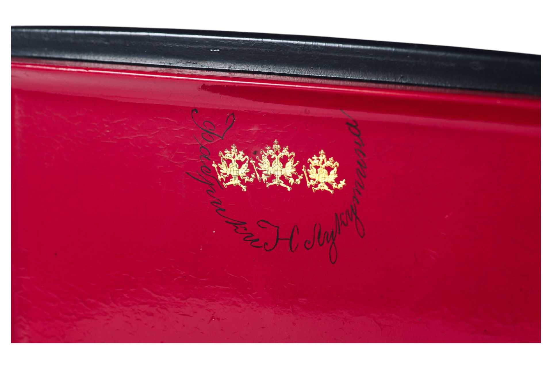 На внутренней стороне крышки клеймо фабрики Н.А. Лукутина. Изображение трех Государственных гербов ставилось в период с 1888 — 1902 годы. Николай Александрович Лукутин (1853 — 1902), последний владелец фабрики лаковой