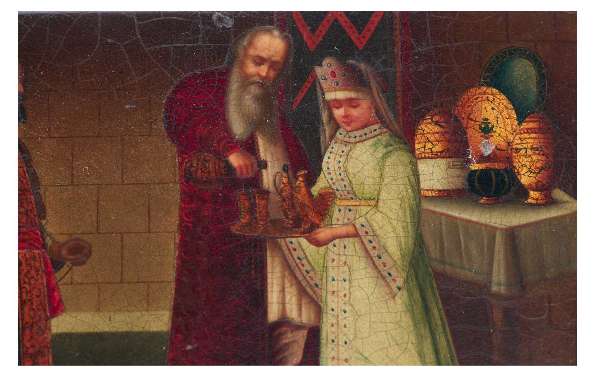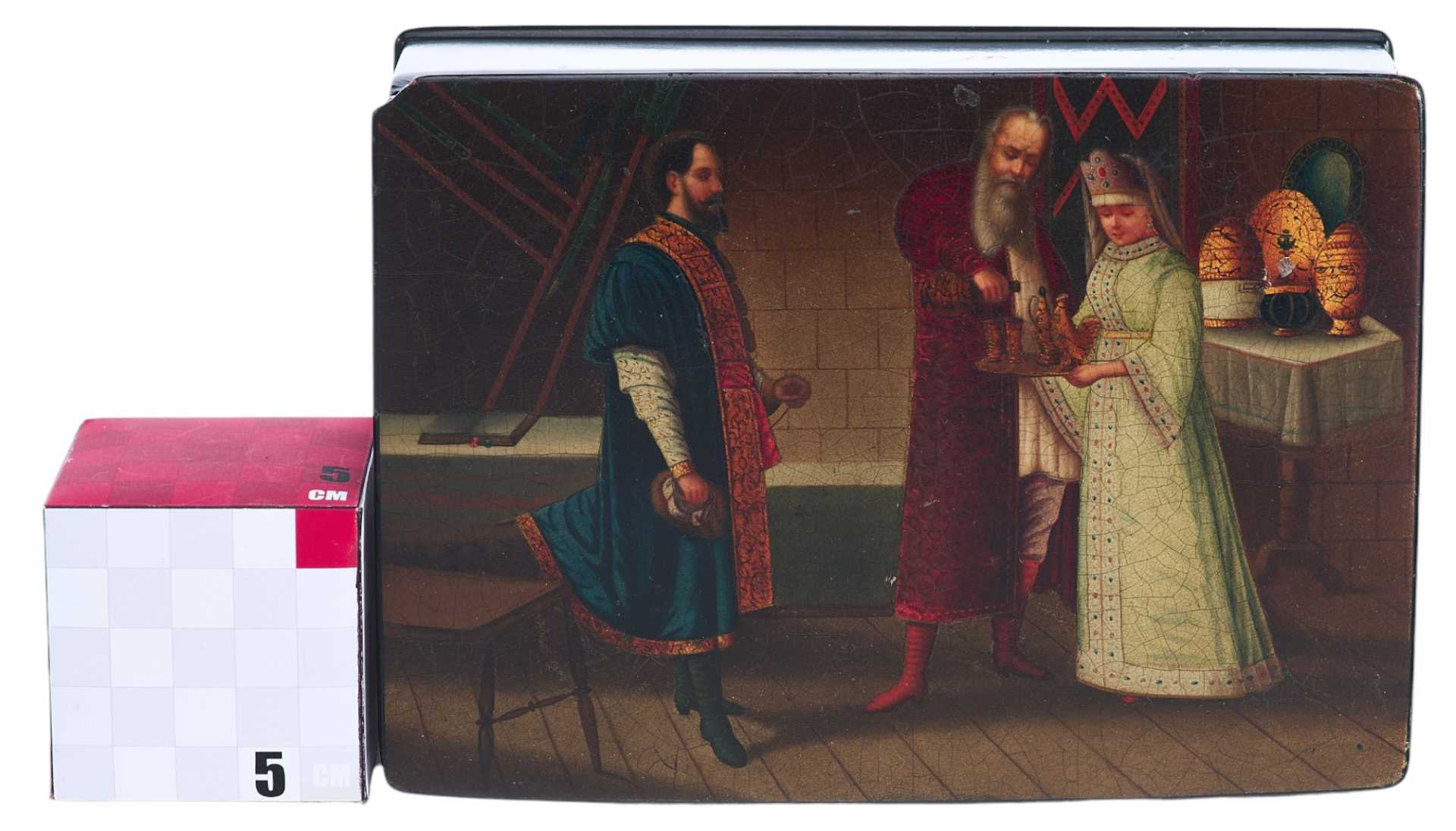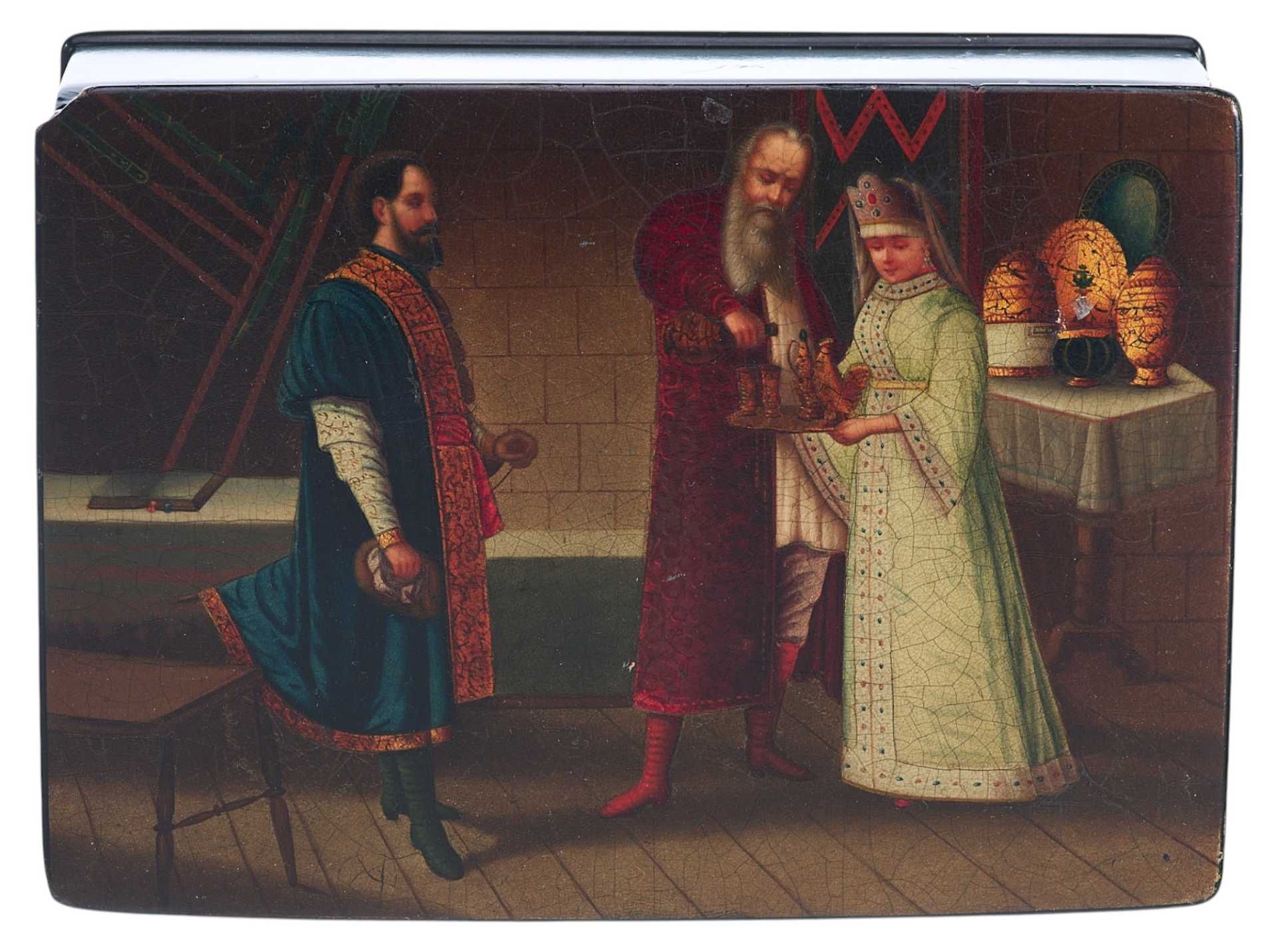 На крышке шкатулки изображена бытовая сцена из жизни русских бояр ХѴП века. В светлой горнице отец с дочерью встречают дорогого гостя. Девушка, скромно потупив взор, держит в руках поднос с угощением, а её отец наливает в кубки вино.