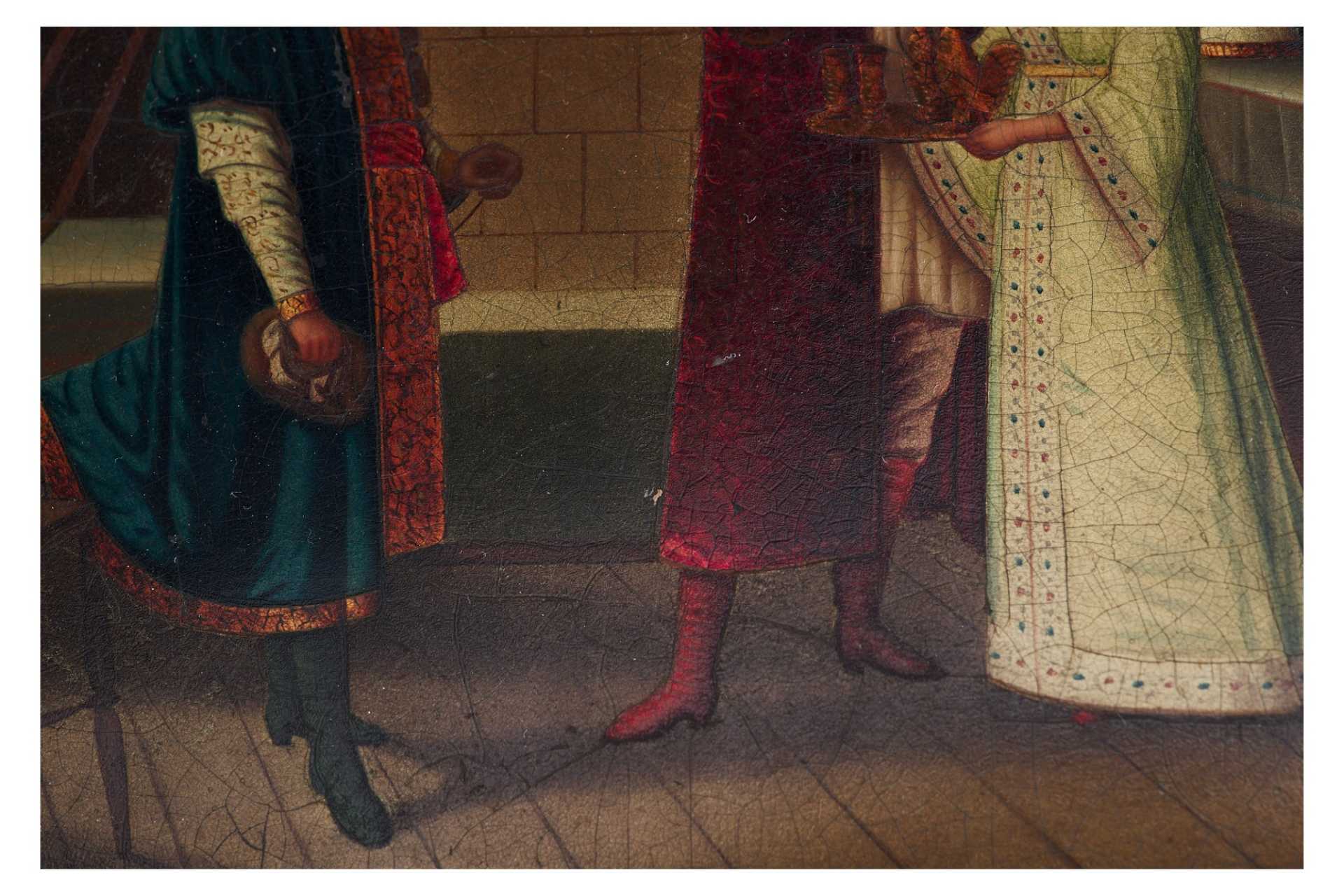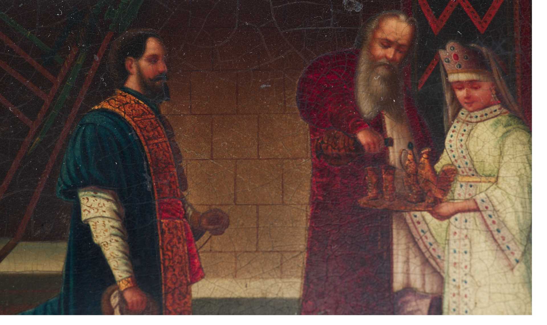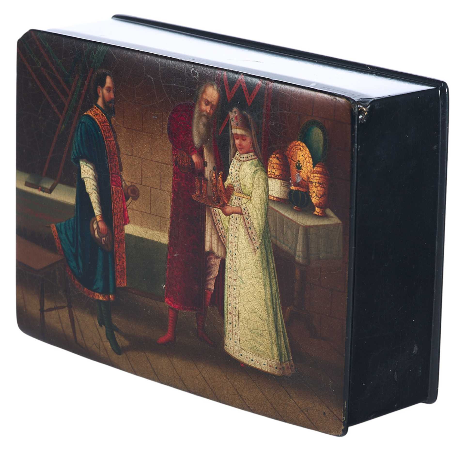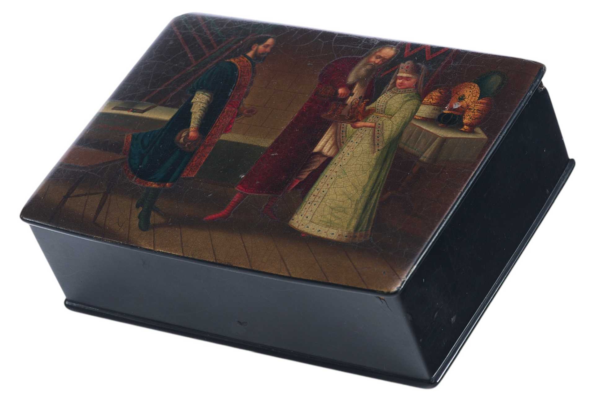 На крышке шкатулки изображена бытовая сцена из жизни русских бояр ХѴП века. В светлой горнице отец с дочерью встречают дорогого гостя. Девушка, скромно потупив взор, держит в руках поднос с угощением, а её отец наливает в кубки вино.