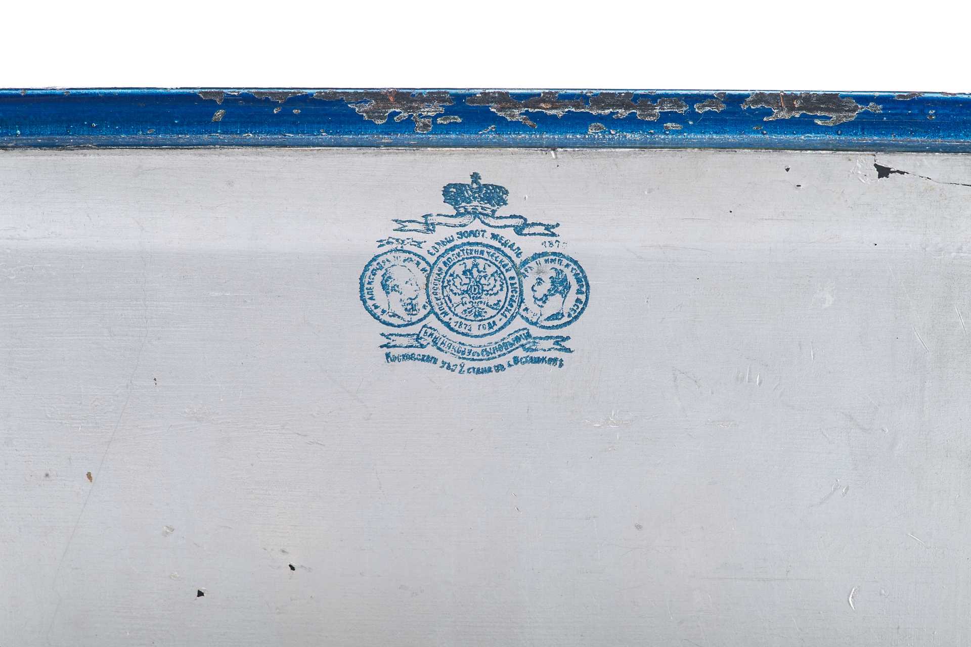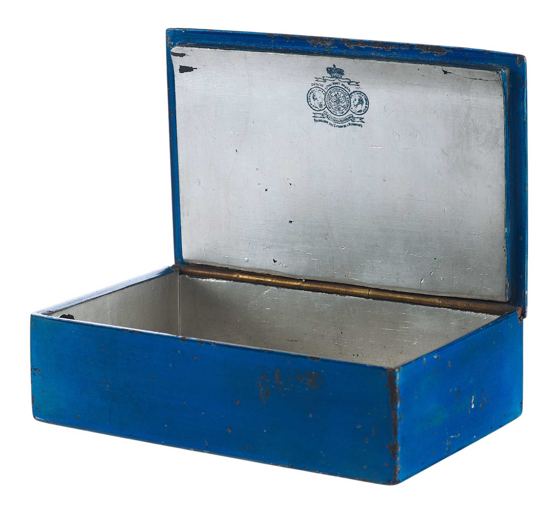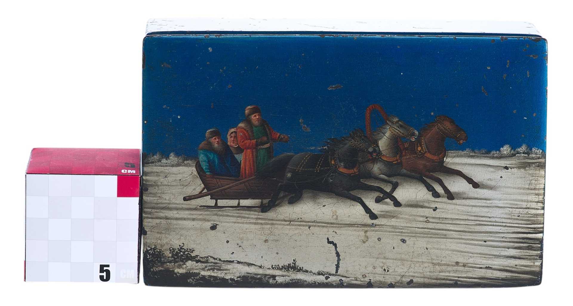 Шкатулка прямоугольной формы на четырех ножках. На лицевой стороне шкатулки изображение тройки лошадей, несущейся по снежной дороге. Тройка запряжена в сани, в которых сидят люди. На внутренней стороне крышки клеймо “Фабрика Вишнякова с сыновьями” и медали.