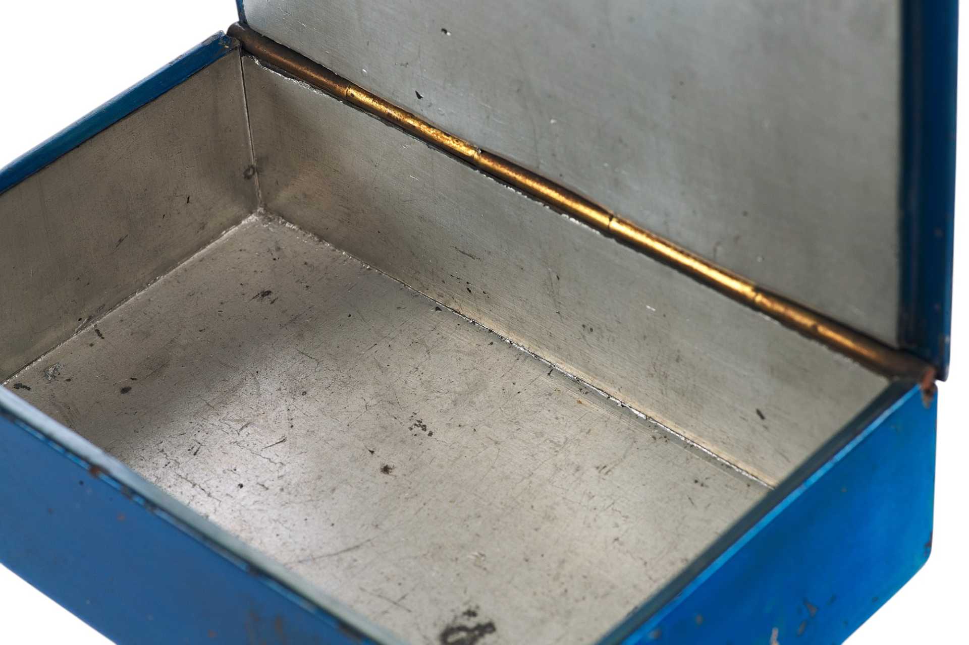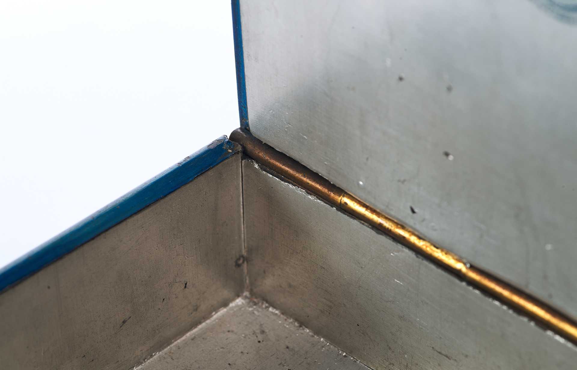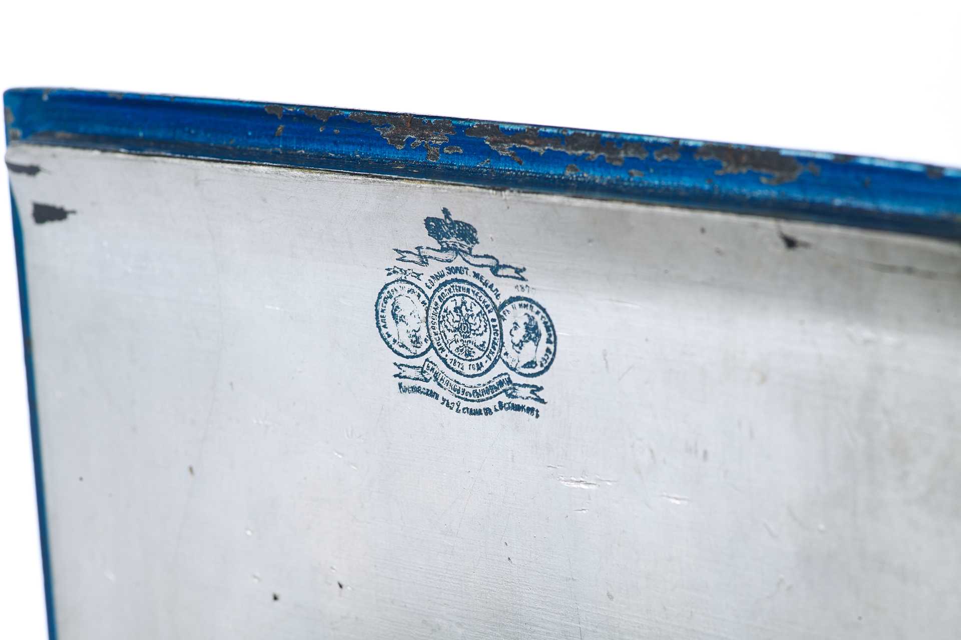 Шкатулка прямоугольной формы на четырех ножках. На лицевой стороне шкатулки изображение тройки лошадей, несущейся по снежной дороге. Тройка запряжена в сани, в которых сидят люди. На внутренней стороне крышки клеймо “Фабрика Вишнякова с сыновьями” и медали.