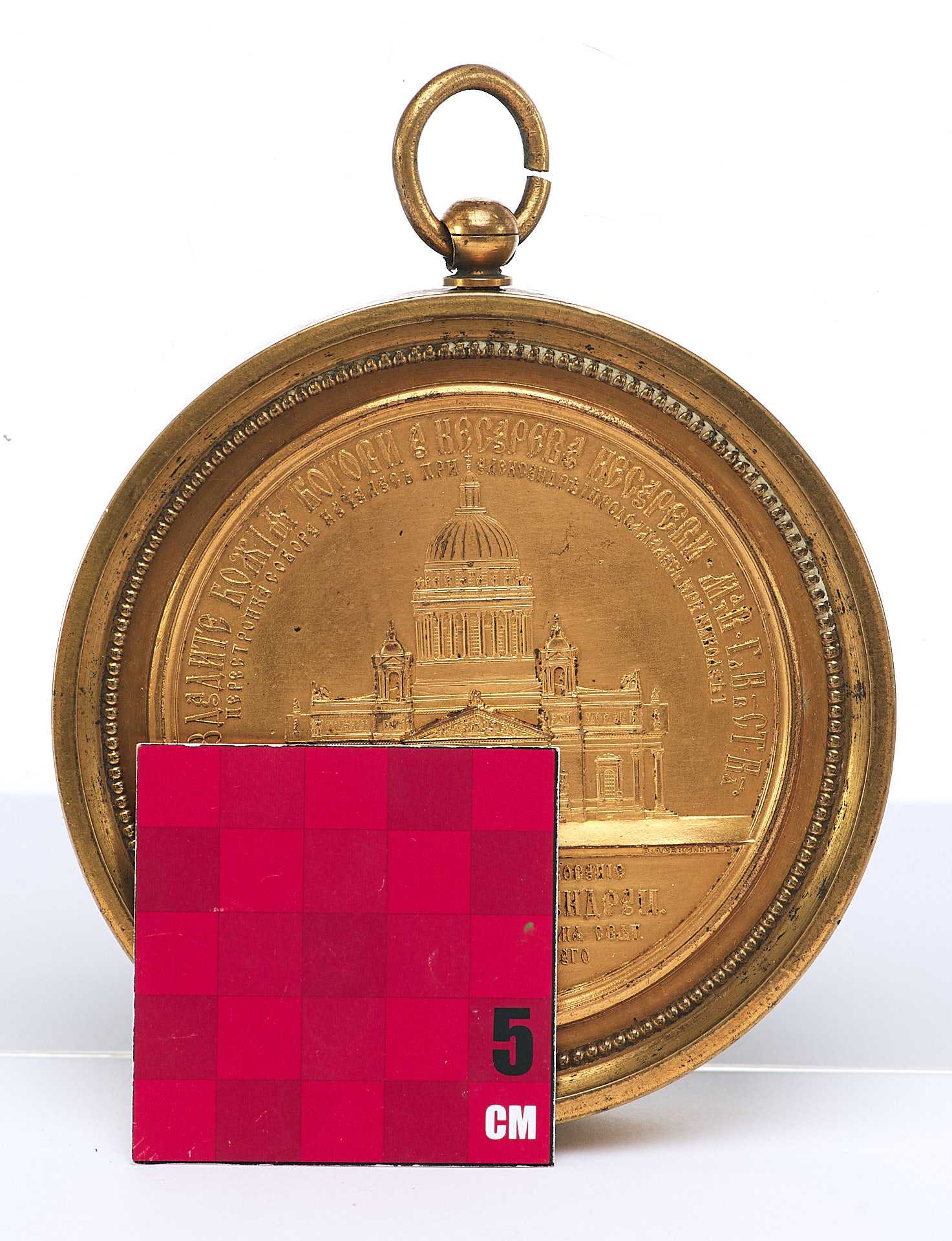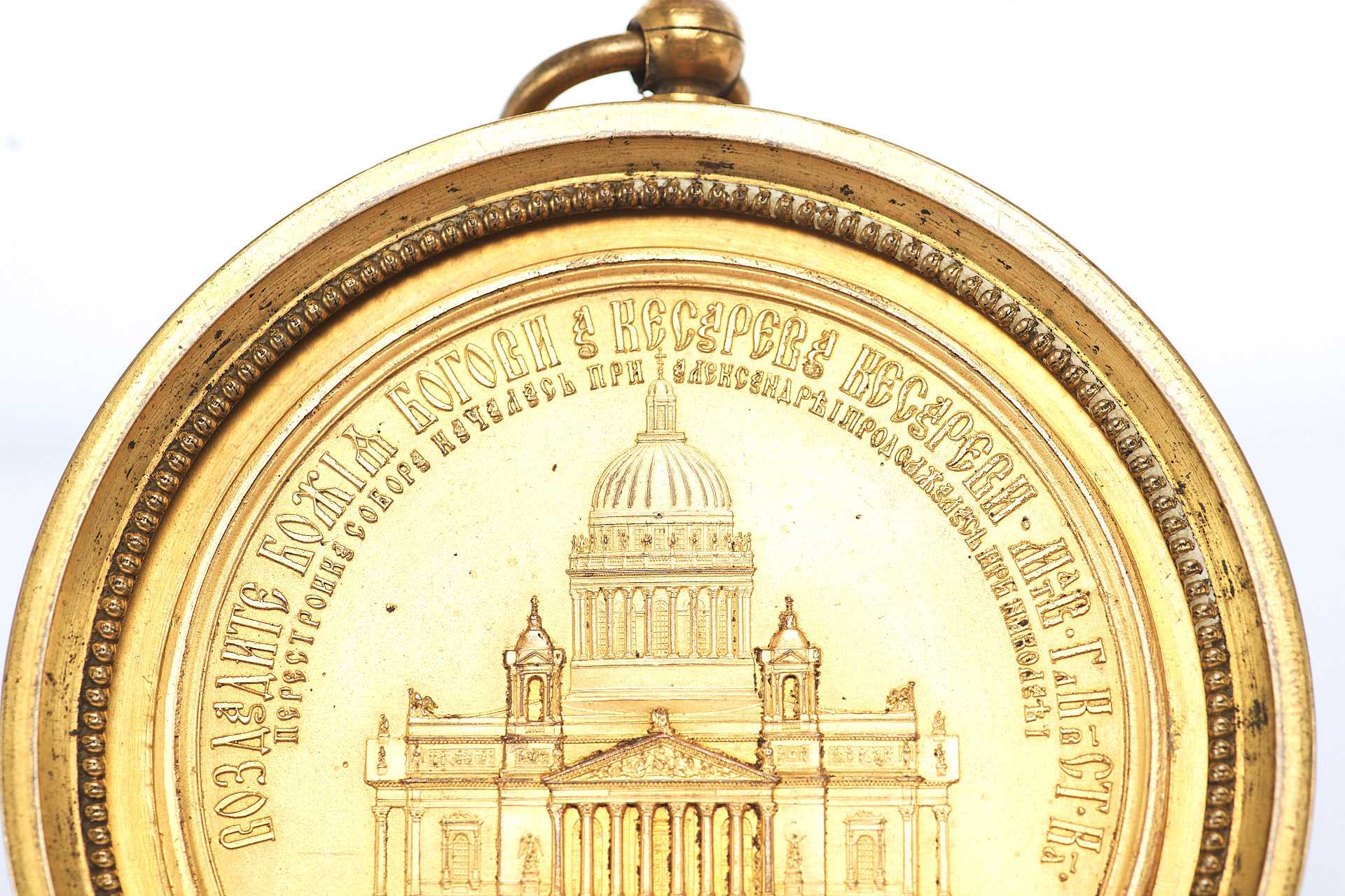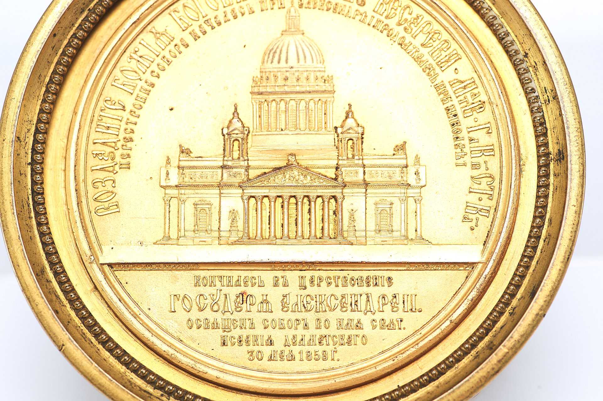 Сверху по краю надпись: «Воздадите Божие Богови, а Кесарево Кесареви — Матв. глК в СТ-ка». Надпись внизу: «кончилась въ царствование государя Александра II освящен соборъ во имя свят Исаакия Далматскаго 30 мая 1858 г.».