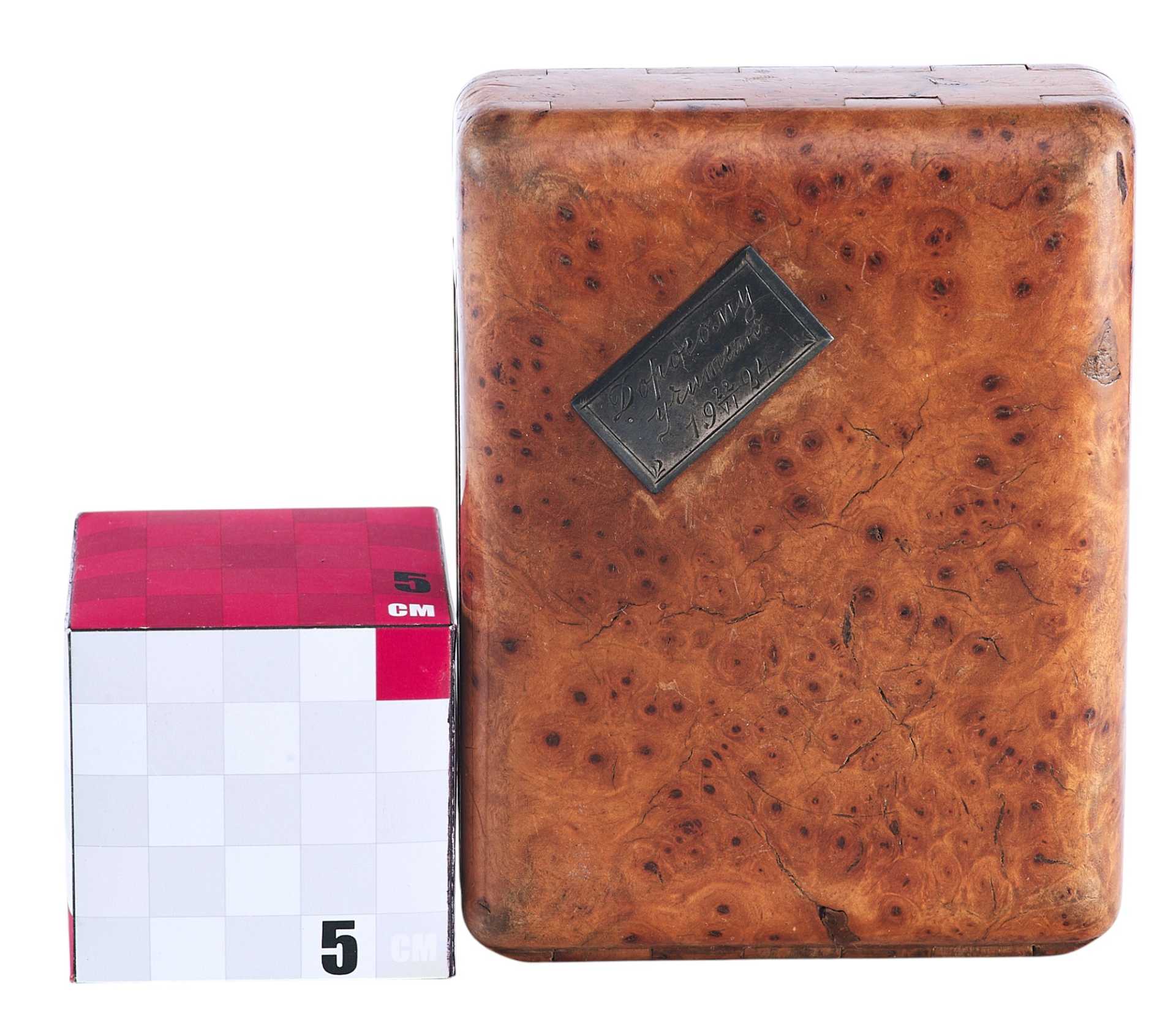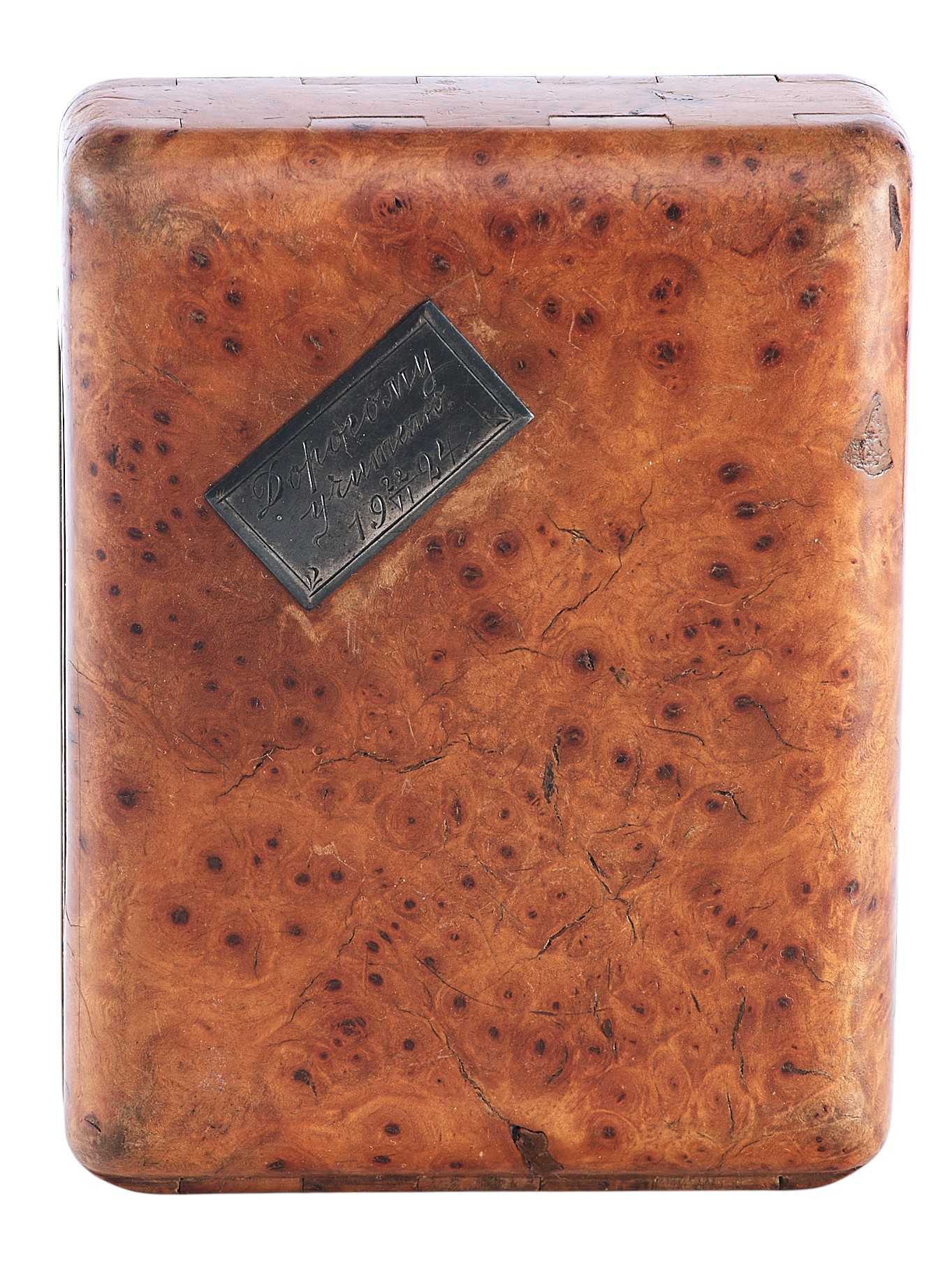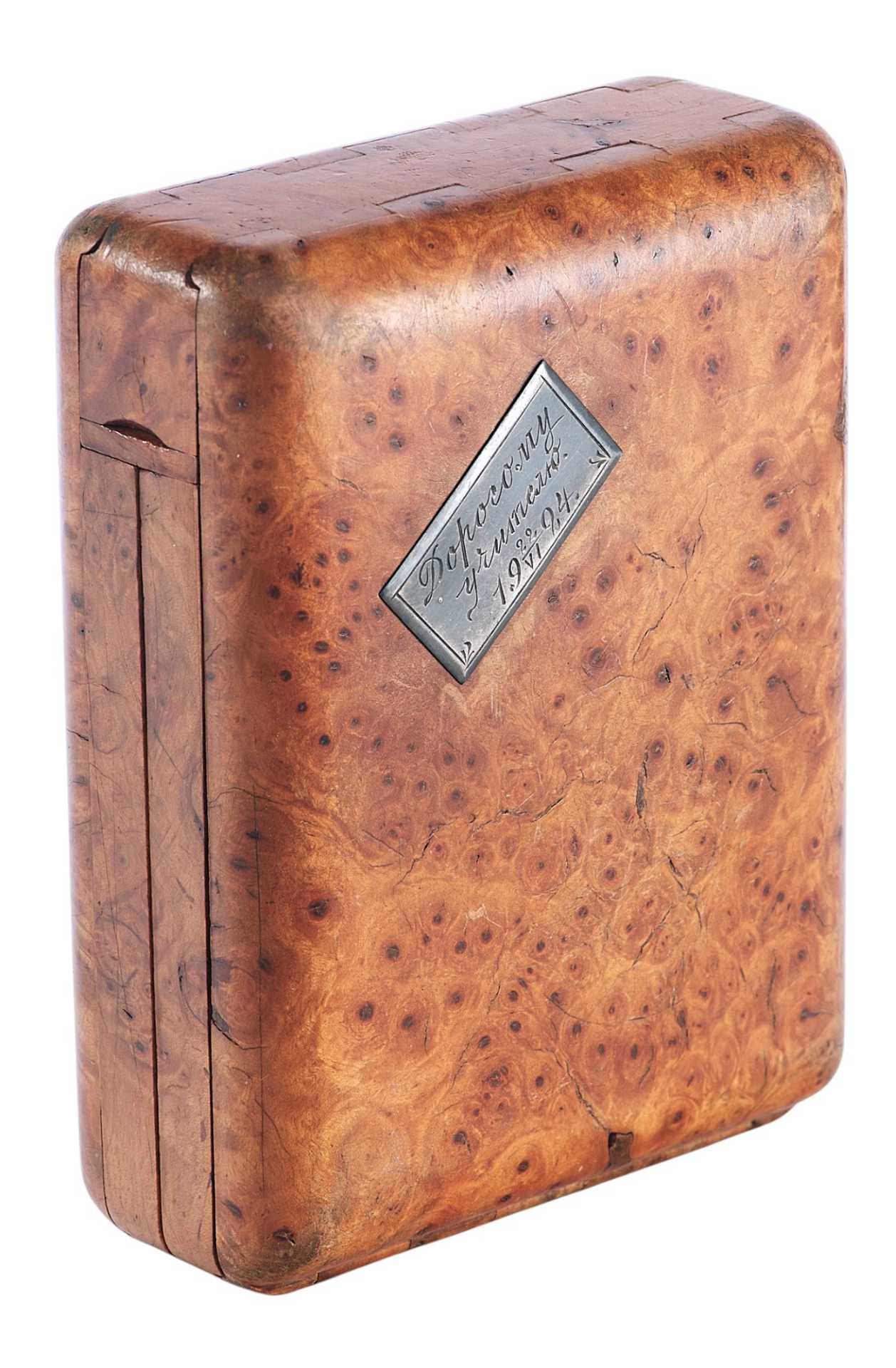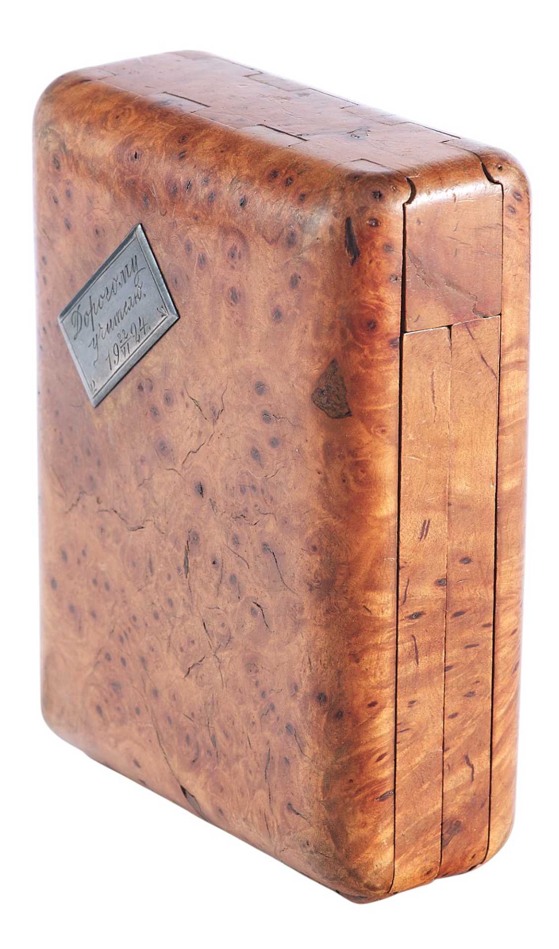 Материалом для изготовления портсигара использован кленовый кап. Кап — редкий, твердый и красивый материал, был широко известен в России с 17 века. На Руси из него изготавливали так называемую “каповую посуду”. Главным образом, это были выдолбленные чаши, ковши и братины. В начале 19 века кап наравне с ценными породами деревьев использовали для декоративной отделки мебели, вырезали из него шкатулки и очень редко портсигары. Рисунок волокон капа очень красив, особенно у тех пород деревьев, которые имеют полосатую текстуру. Текстуру волокон капа сравнивают с мрамором. Признанным центром обработки березового капа считается Вятская губерния. Вятские крестьяне издавна изготовляли из капа ложки, ковши, кружки, портсигары. Известный вятский столяр Григорий Макаров за свои труды получил серебряную медаль “За трудолюбие и искусство” на Всероссийской выставке в Петербурге в 1829 г. В 1931 году’ за три табакерки и шкатулку из капа мастер получил бриллиантовый перстень от Кабинета Его Величества. В 1837 году цесаревич Александр, посетивший Вятку, приобретает табакерки и шкатулки.