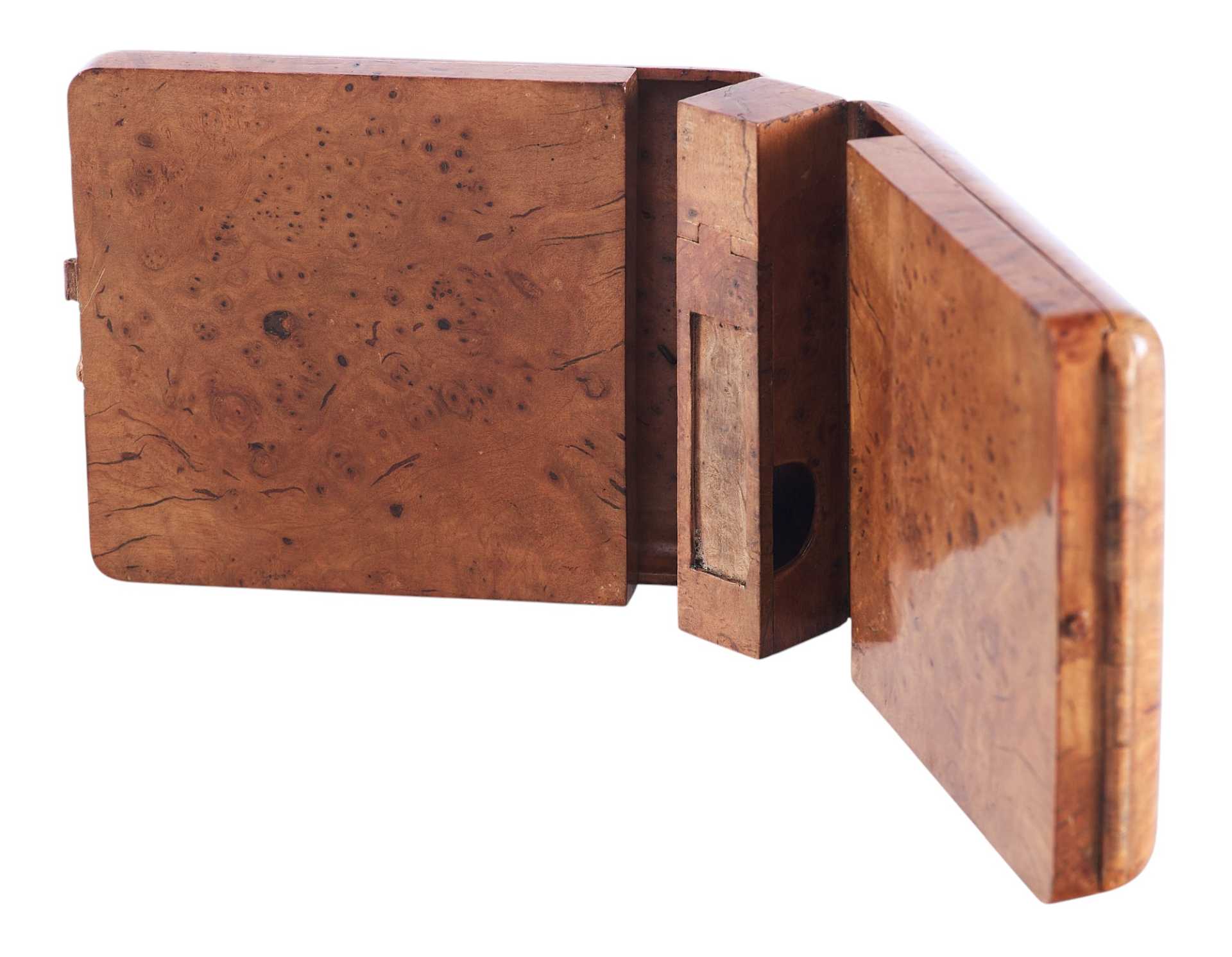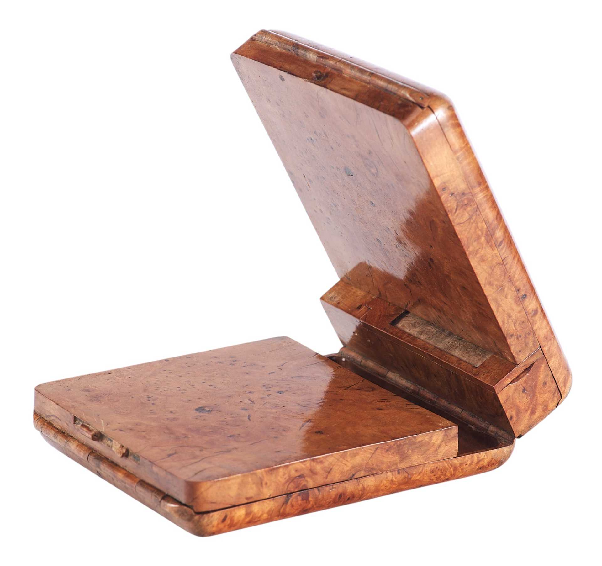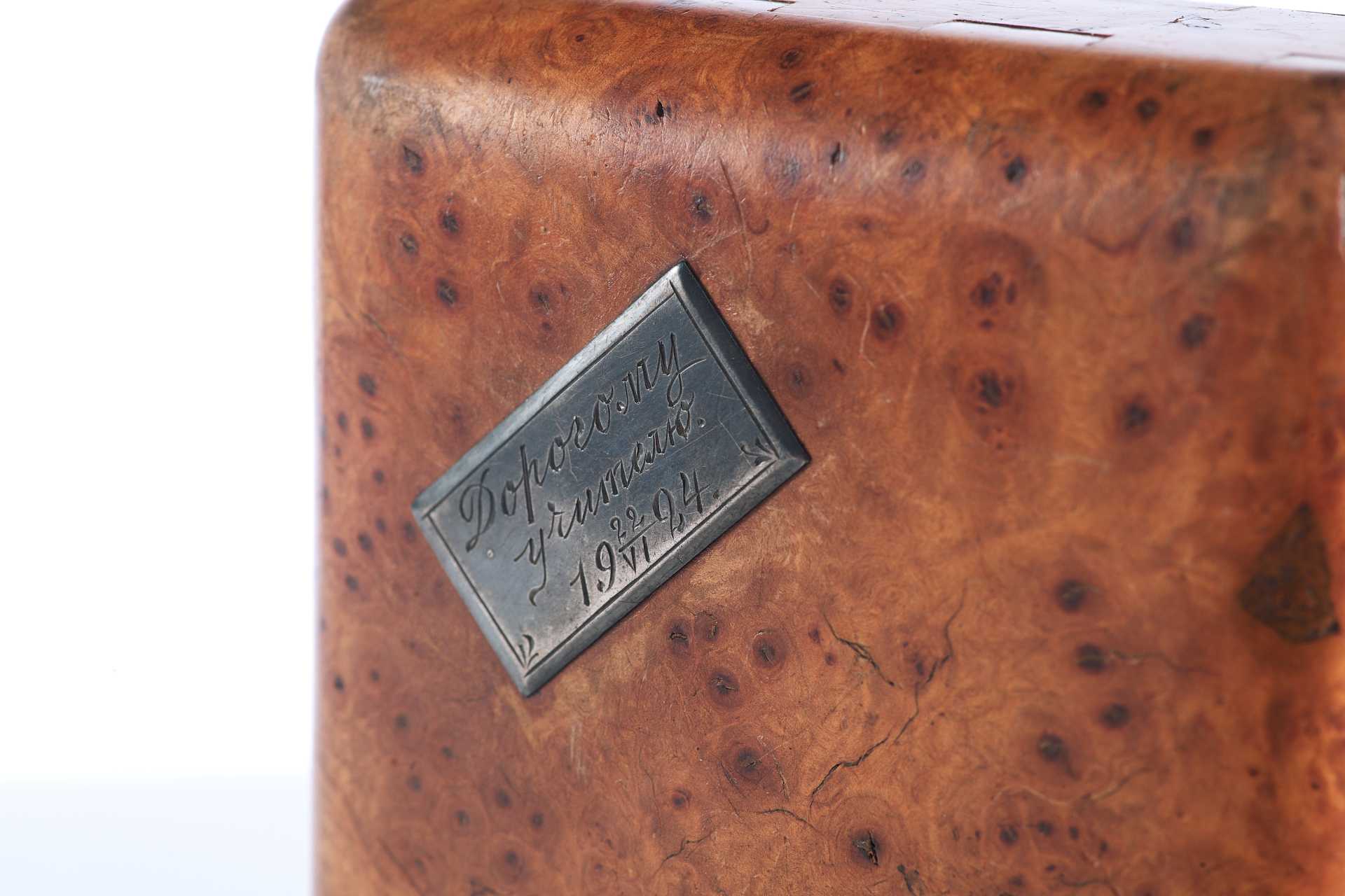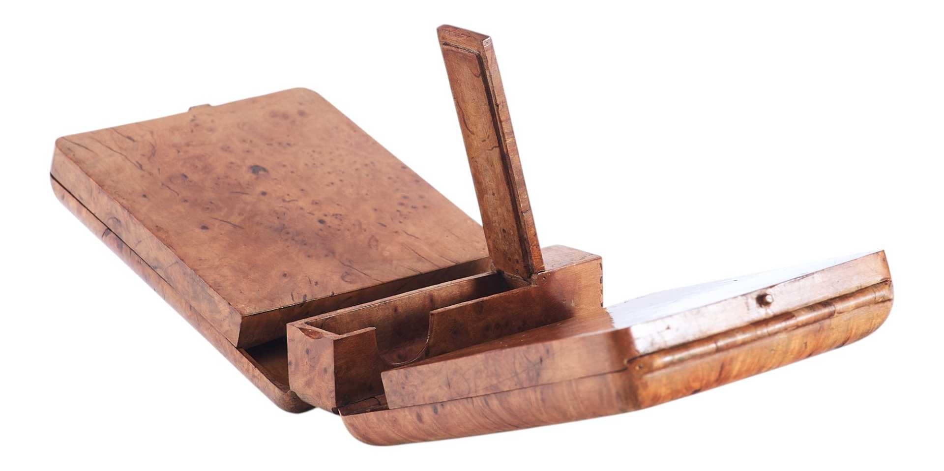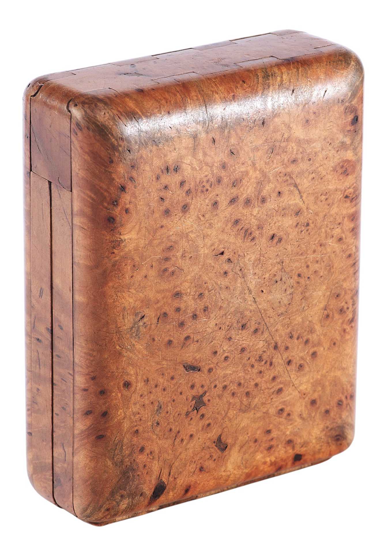 Материалом для изготовления портсигара использован кленовый кап. Кап — редкий, твердый и красивый материал, был широко известен в России с 17 века. На Руси из него изготавливали так называемую “каповую посуду”. Главным образом, это были выдолбленные чаши, ковши и братины. В начале 19 века кап наравне с ценными породами деревьев использовали для декоративной отделки мебели, вырезали из него шкатулки и очень редко портсигары. Рисунок волокон капа очень красив, особенно у тех пород деревьев, которые имеют полосатую текстуру. Текстуру волокон капа сравнивают с мрамором. Признанным центром обработки березового капа считается Вятская губерния. Вятские крестьяне издавна изготовляли из капа ложки, ковши, кружки, портсигары. Известный вятский столяр Григорий Макаров за свои труды получил серебряную медаль “За трудолюбие и искусство” на Всероссийской выставке в Петербурге в 1829 г. В 1931 году’ за три табакерки и шкатулку из капа мастер получил бриллиантовый перстень от Кабинета Его Величества. В 1837 году цесаревич Александр, посетивший Вятку, приобретает табакерки и шкатулки.