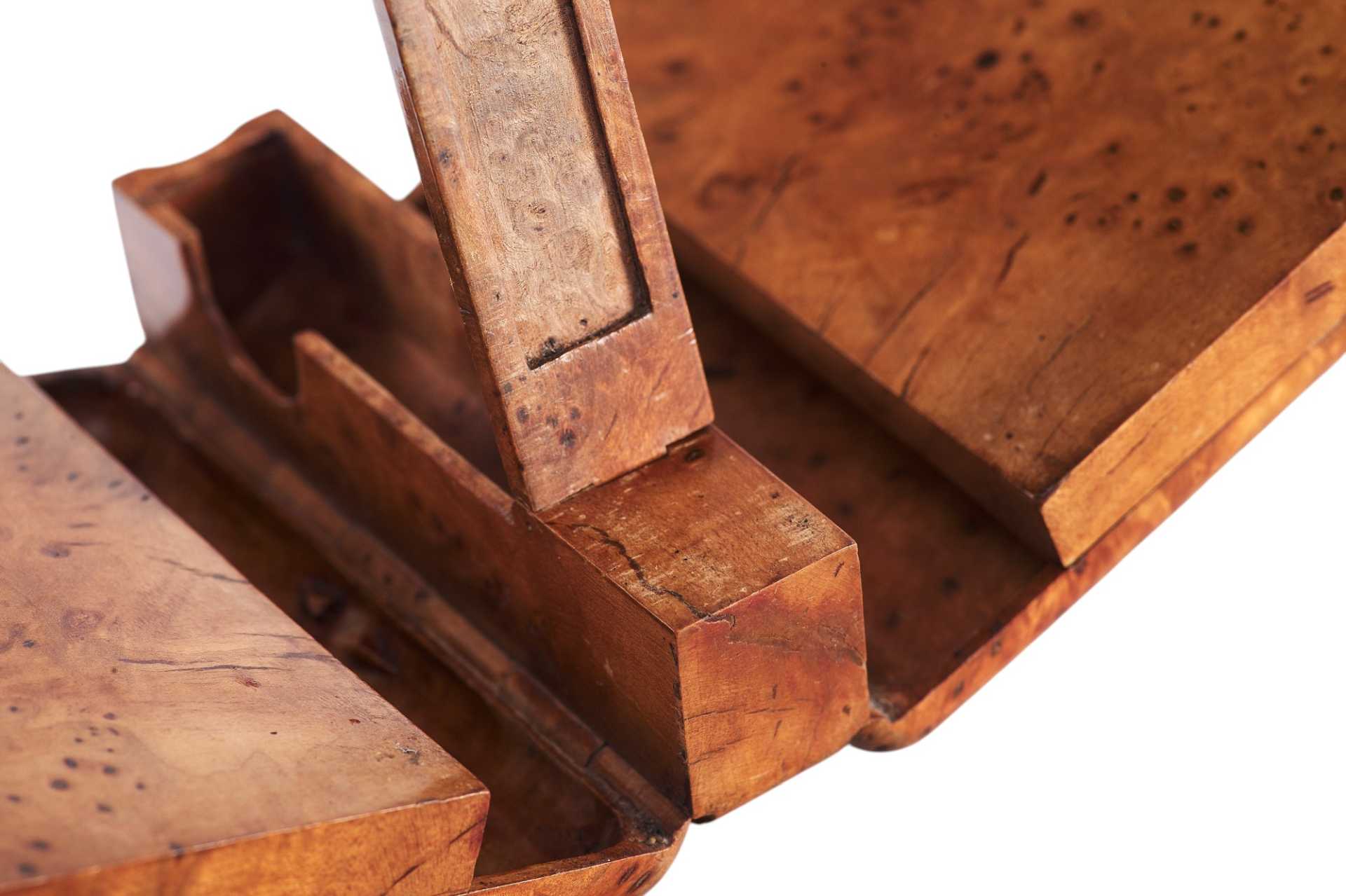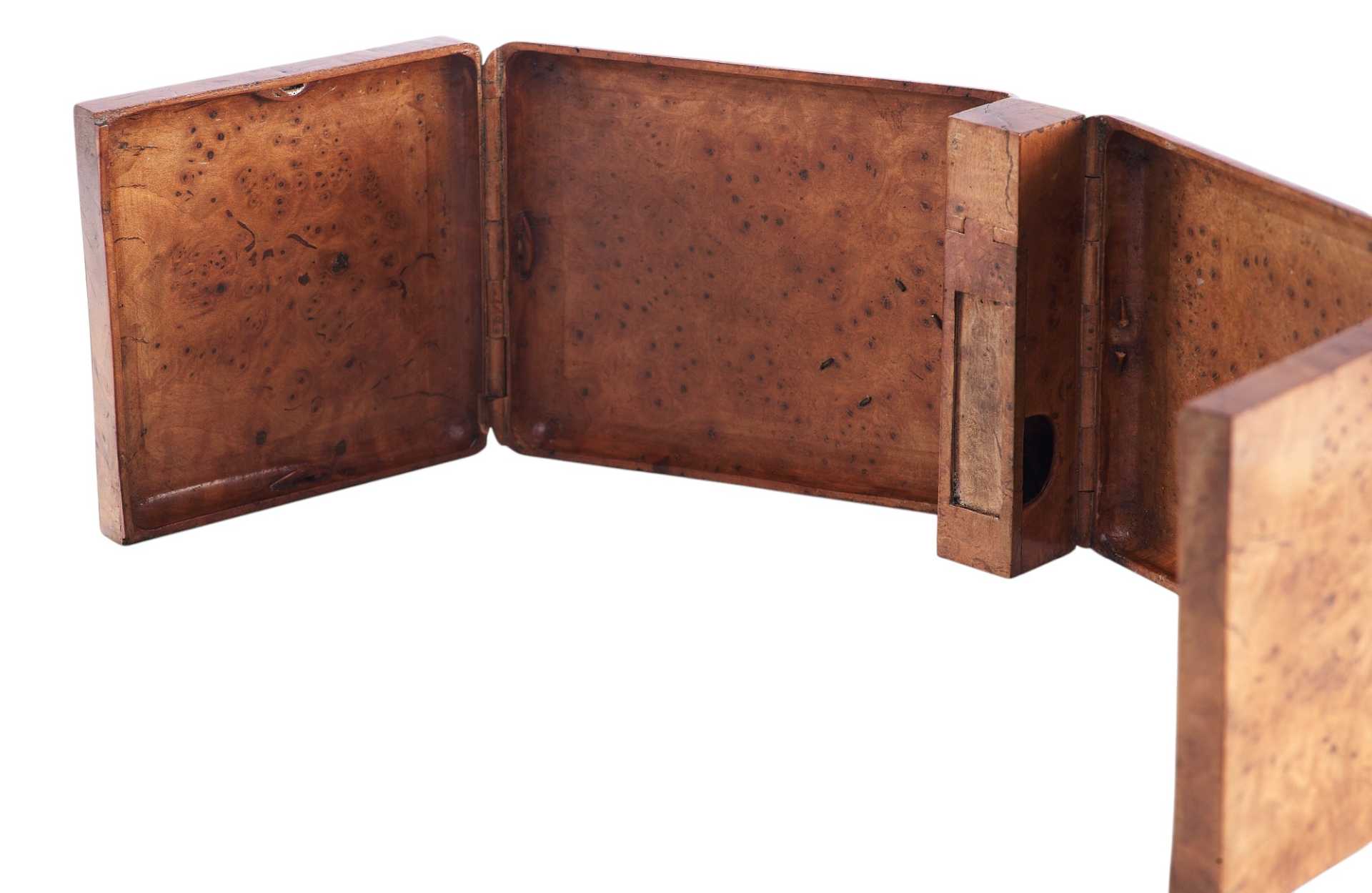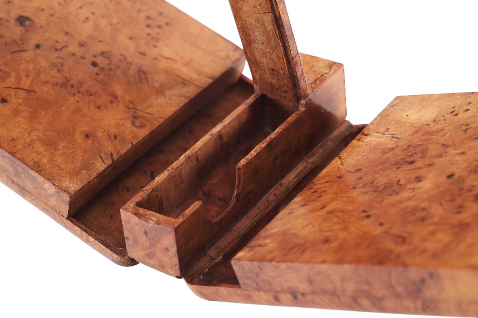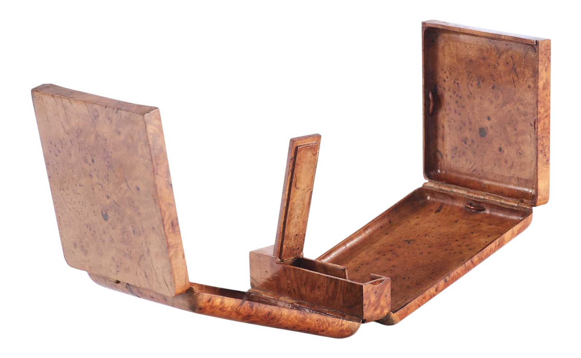 Материалом для изготовления портсигара использован кленовый кап. Кап — редкий, твердый и красивый материал, был широко известен в России с 17 века. На Руси из него изготавливали так называемую “каповую посуду”. Главным образом, это были выдолбленные чаши, ковши и братины. В начале 19 века кап наравне с ценными породами деревьев использовали для декоративной отделки мебели, вырезали из него шкатулки и очень редко портсигары. Рисунок волокон капа очень красив, особенно у тех пород деревьев, которые имеют полосатую текстуру. Текстуру волокон капа сравнивают с мрамором. Признанным центром обработки березового капа считается Вятская губерния. Вятские крестьяне издавна изготовляли из капа ложки, ковши, кружки, портсигары. Известный вятский столяр Григорий Макаров за свои труды получил серебряную медаль “За трудолюбие и искусство” на Всероссийской выставке в Петербурге в 1829 г. В 1931 году’ за три табакерки и шкатулку из капа мастер получил бриллиантовый перстень от Кабинета Его Величества. В 1837 году цесаревич Александр, посетивший Вятку, приобретает табакерки и шкатулки.