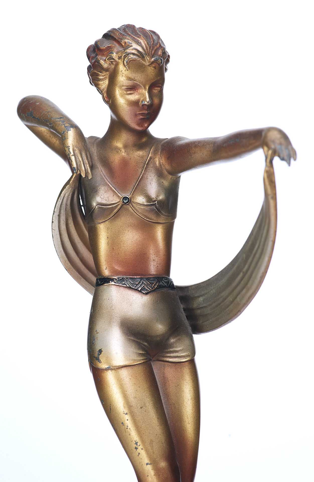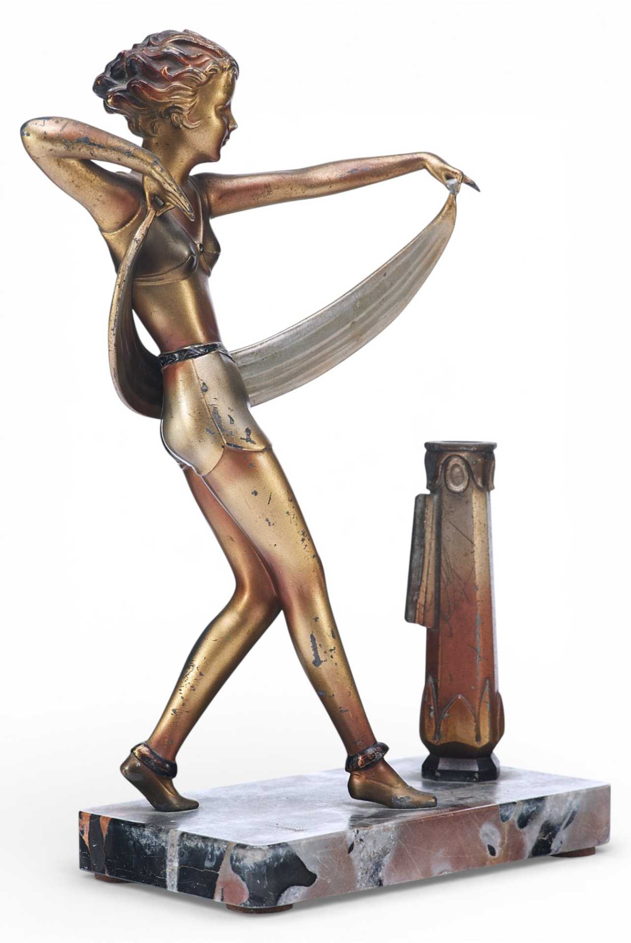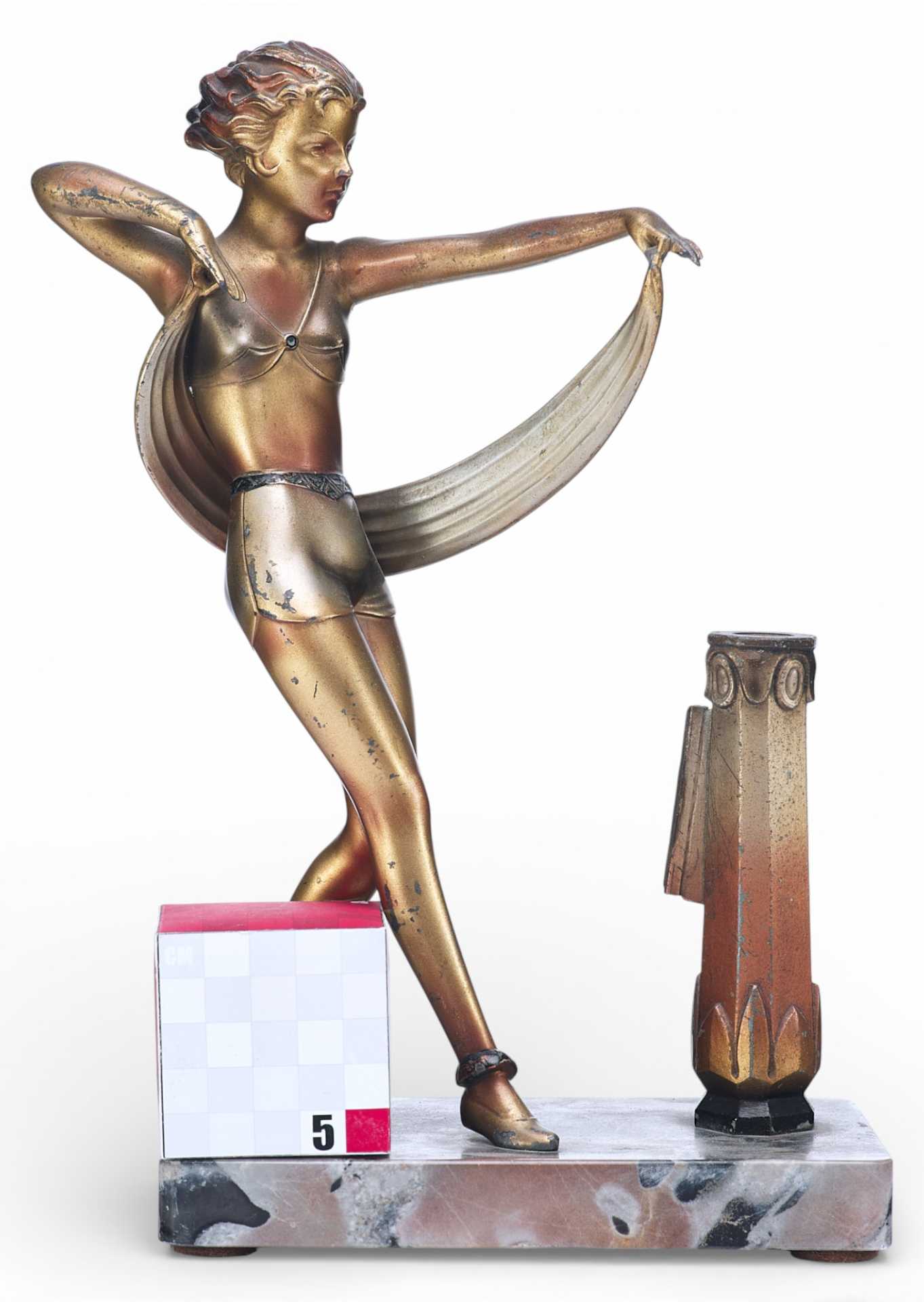 Представлена скульптура в виде танцовщицы одетой по моде 1920-1930-х гг. Скульптура представляет собой пример недорогой шпиатровой пластики имитирующей довольно популярную в Европе и получившую название в широких кругах искусствоведов и коллекционеров - «венскую бронзу».