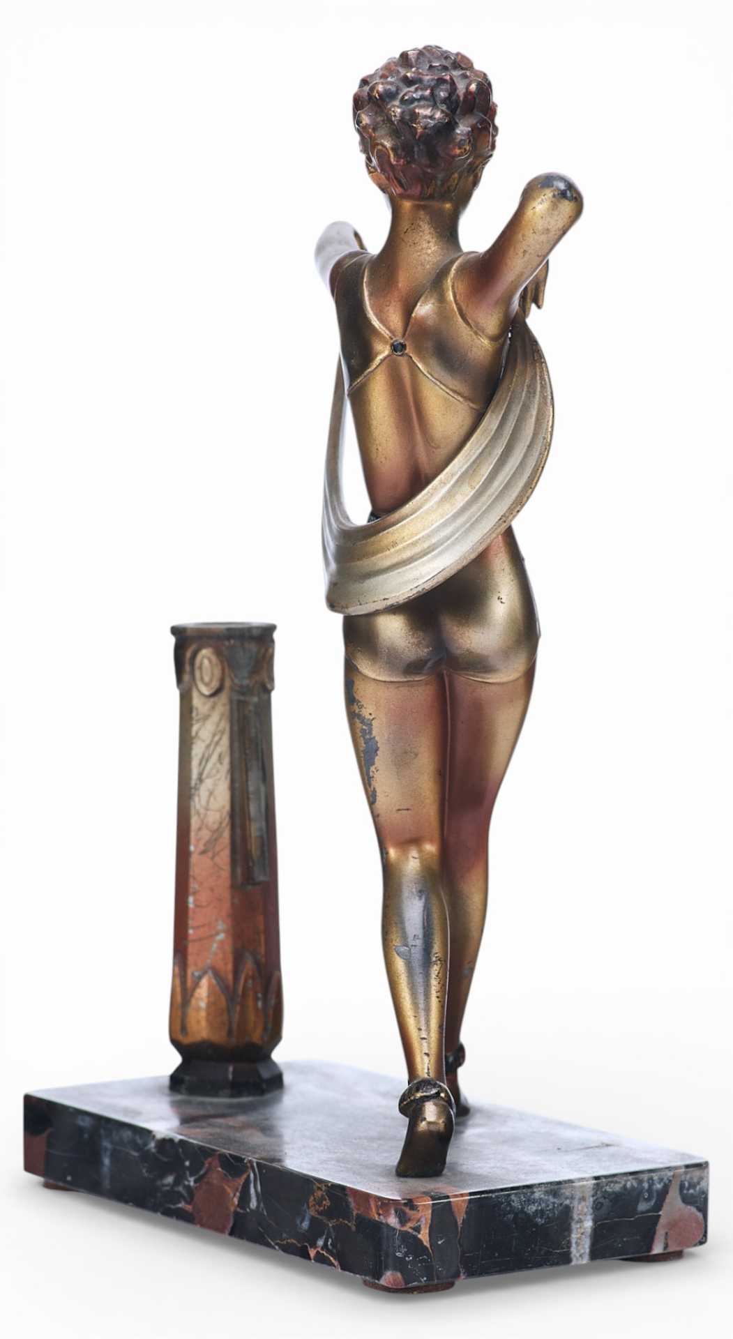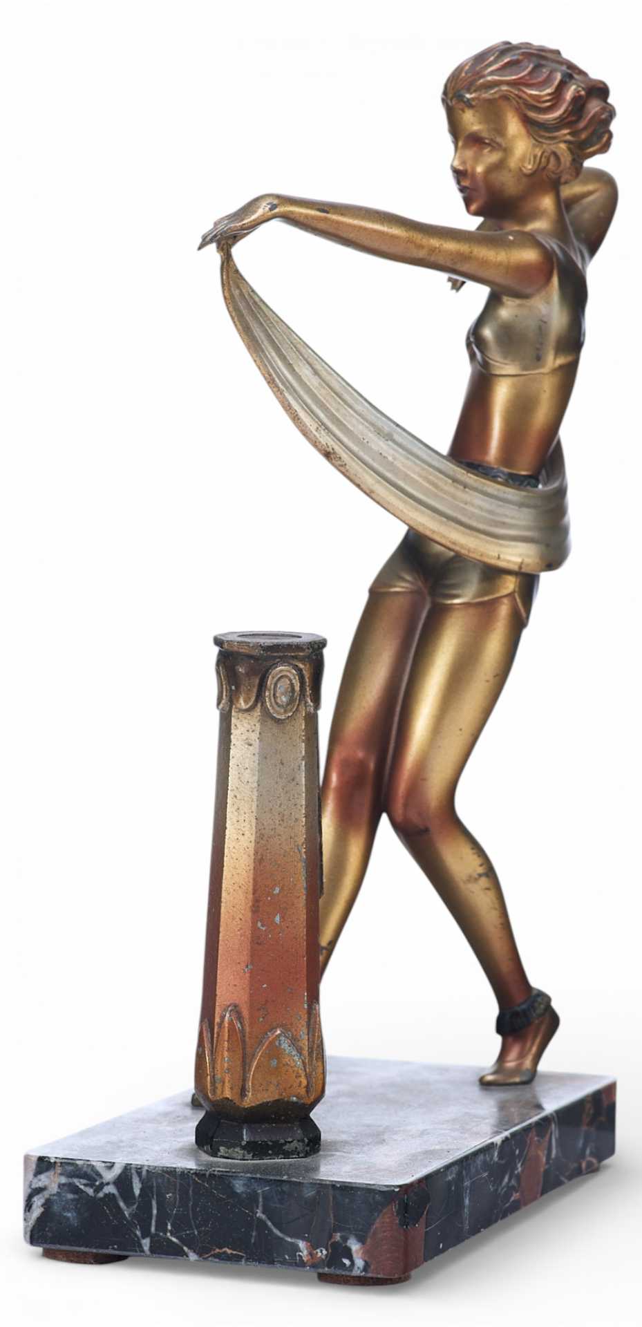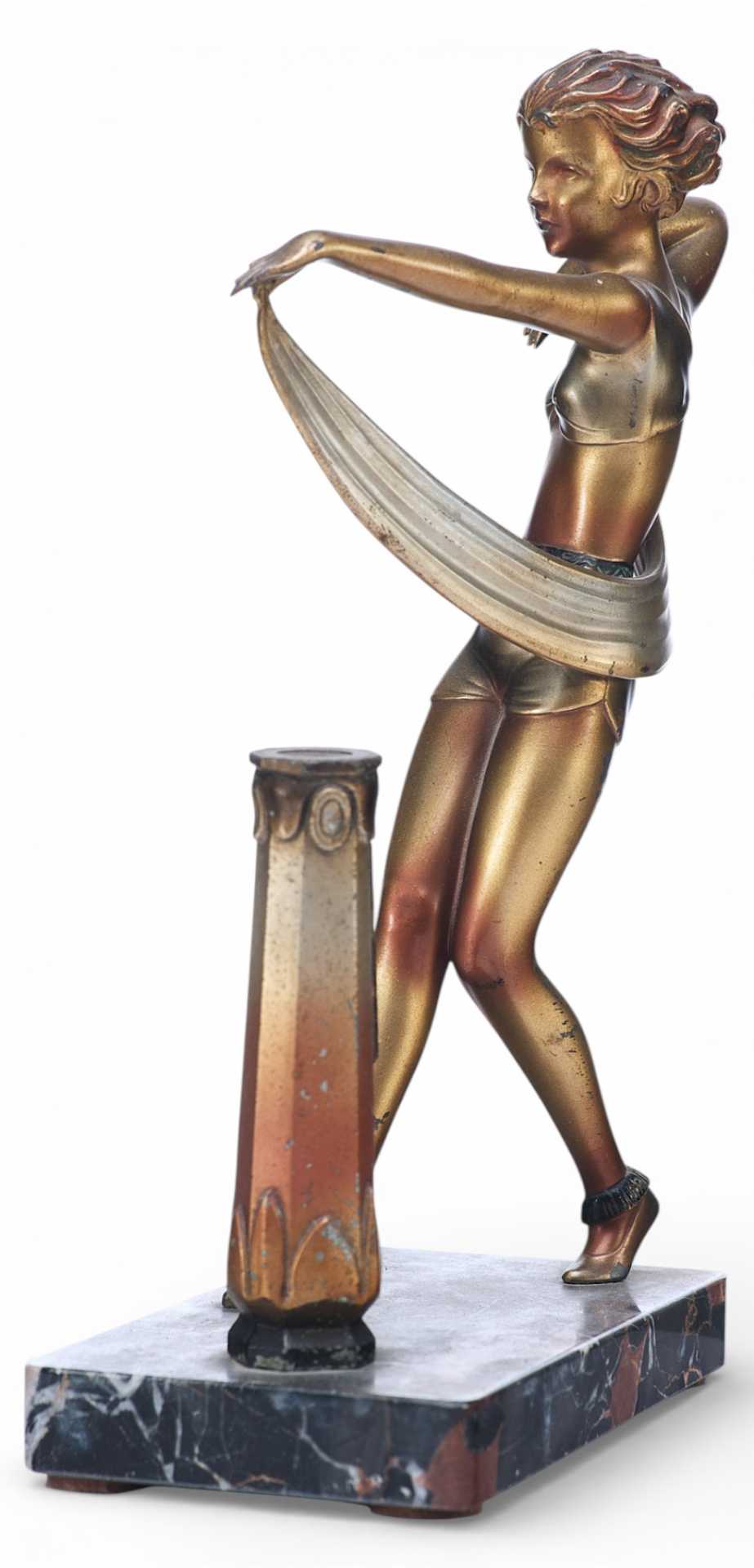 Представлена скульптура в виде танцовщицы одетой по моде 1920-1930-х гг. Скульптура представляет собой пример недорогой шпиатровой пластики имитирующей довольно популярную в Европе и получившую название в широких кругах искусствоведов и коллекционеров - «венскую бронзу».
