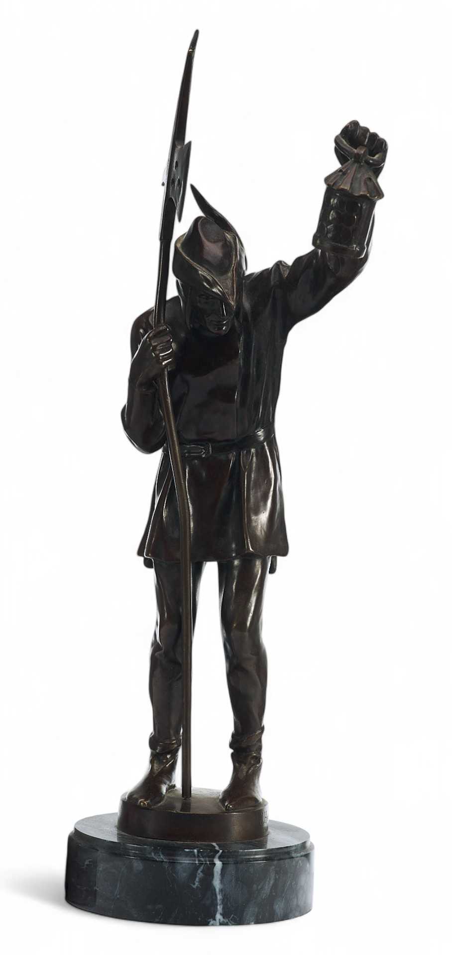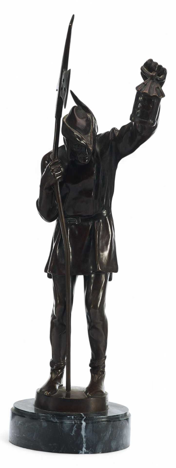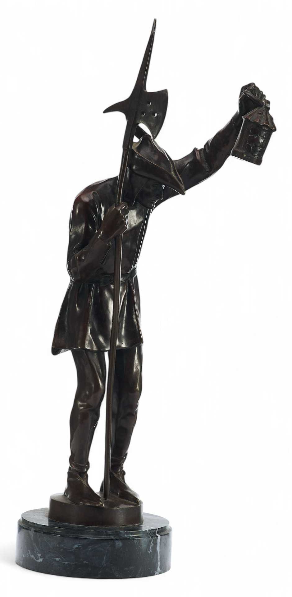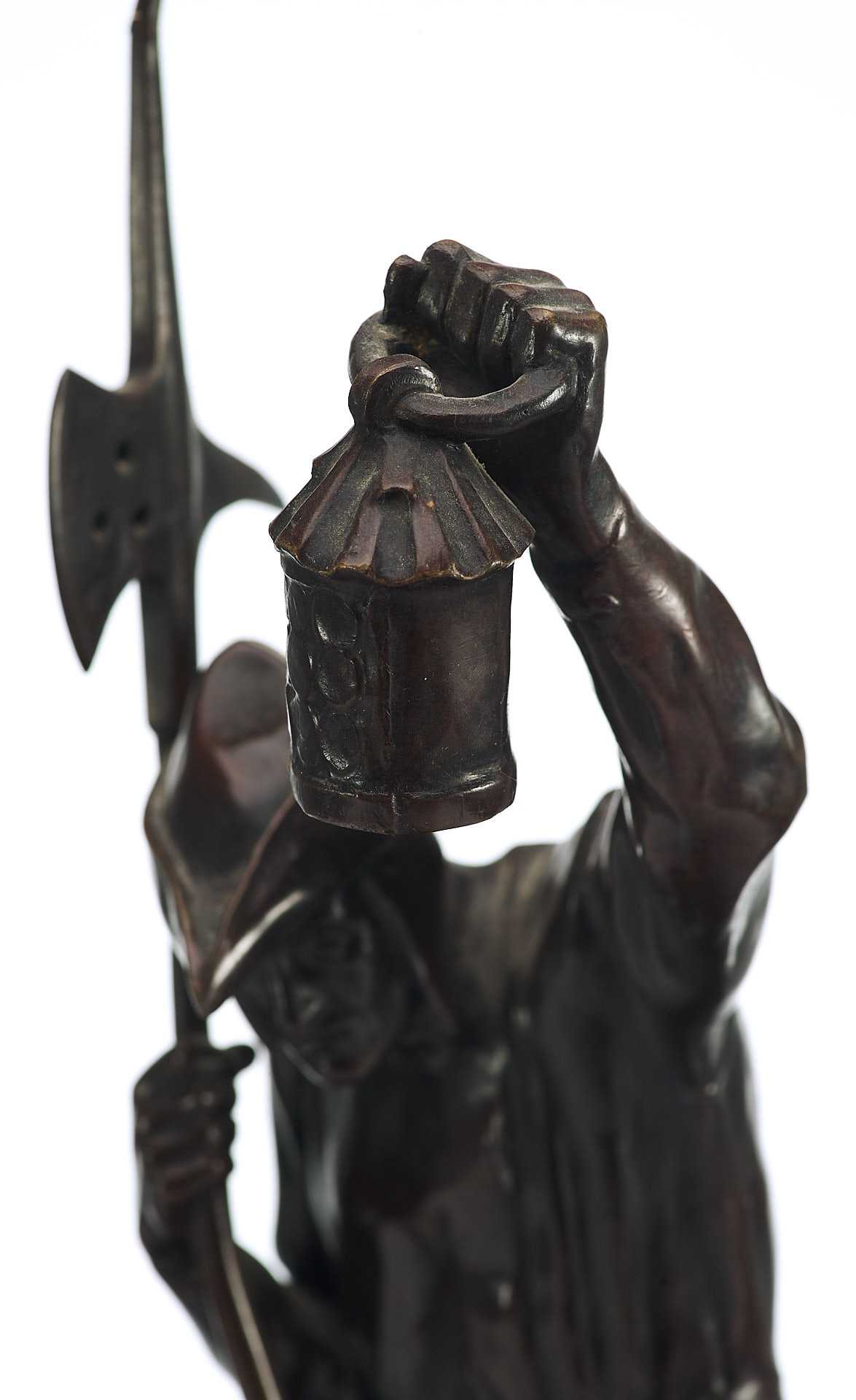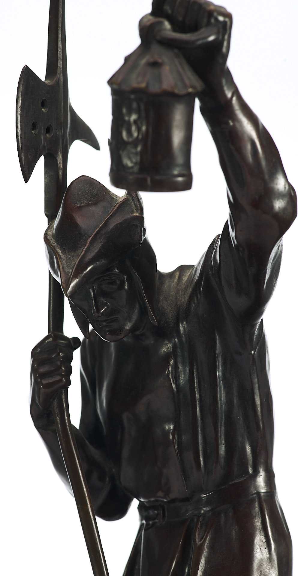 Представлена бронзовая скульптура средневекового стражника с алебардой и фонарем, пытающегося при помощи него что-то видеть во тьме. Скульптура представляет собой типичный пример «бронзовой» пластики первой четверти XX в., довольно