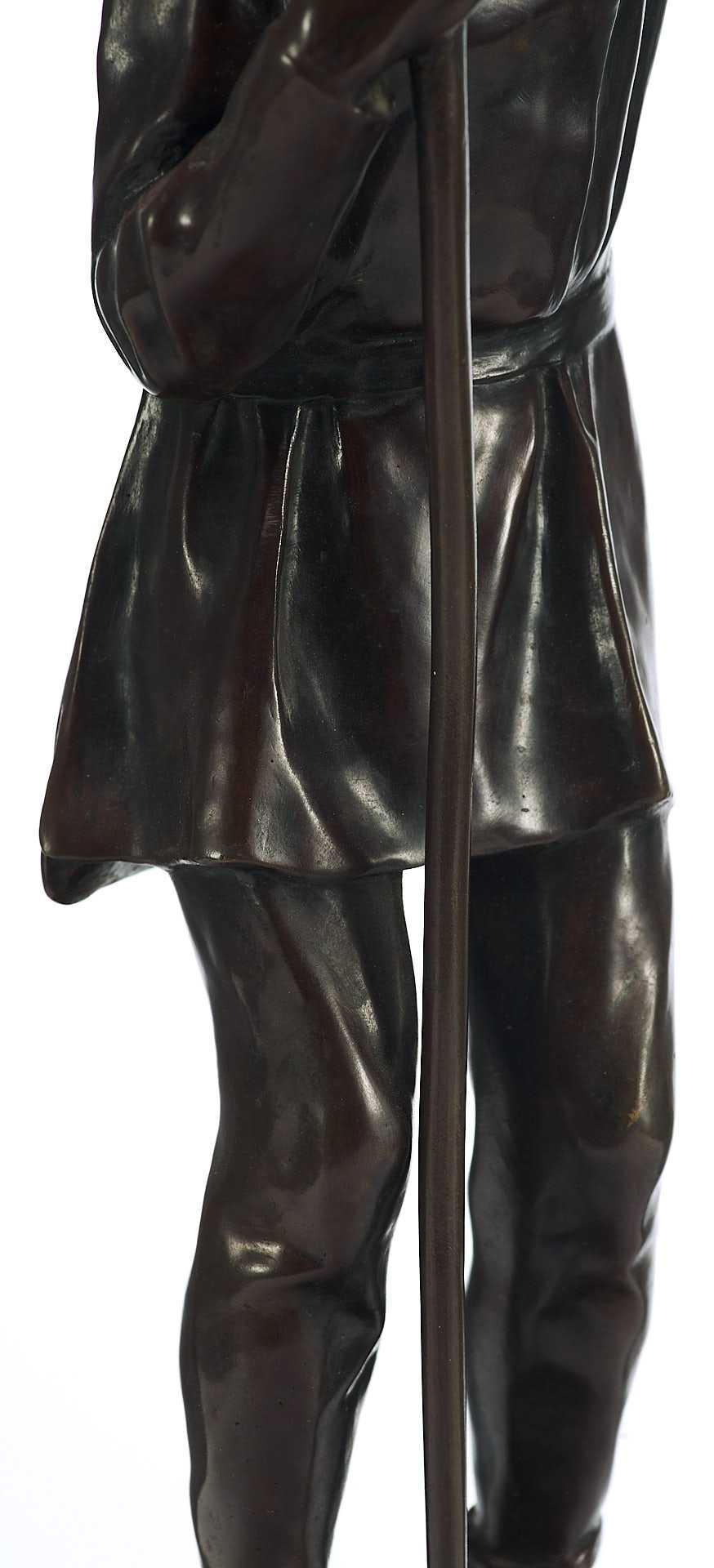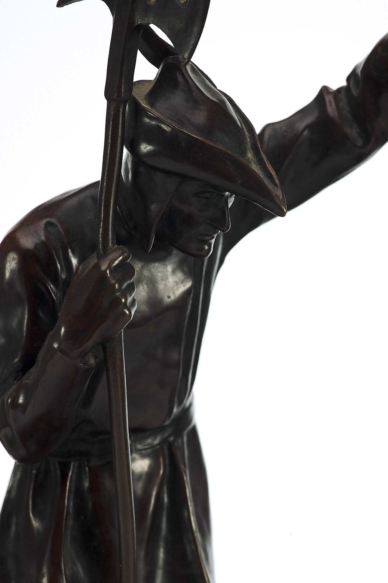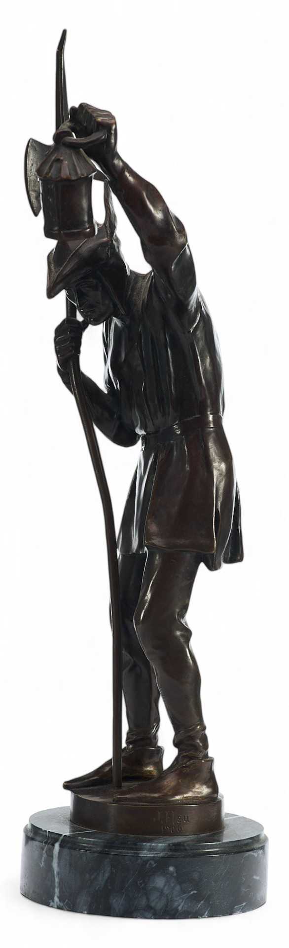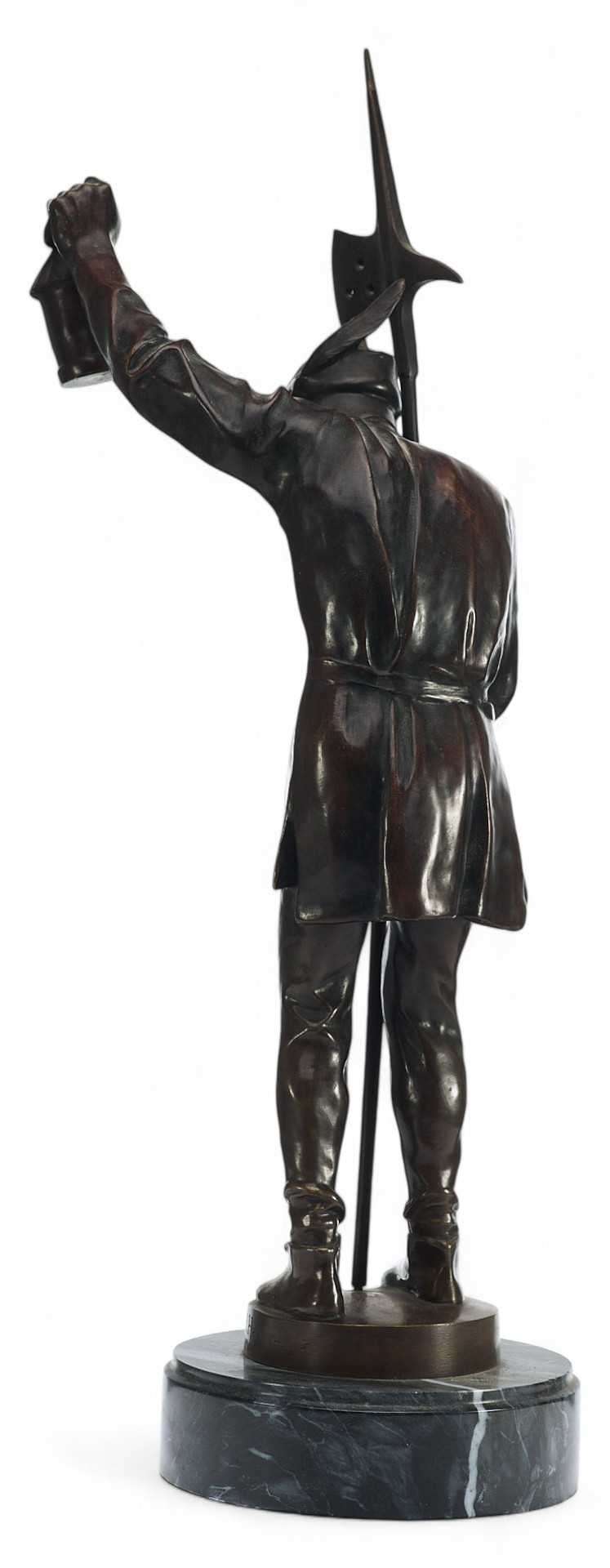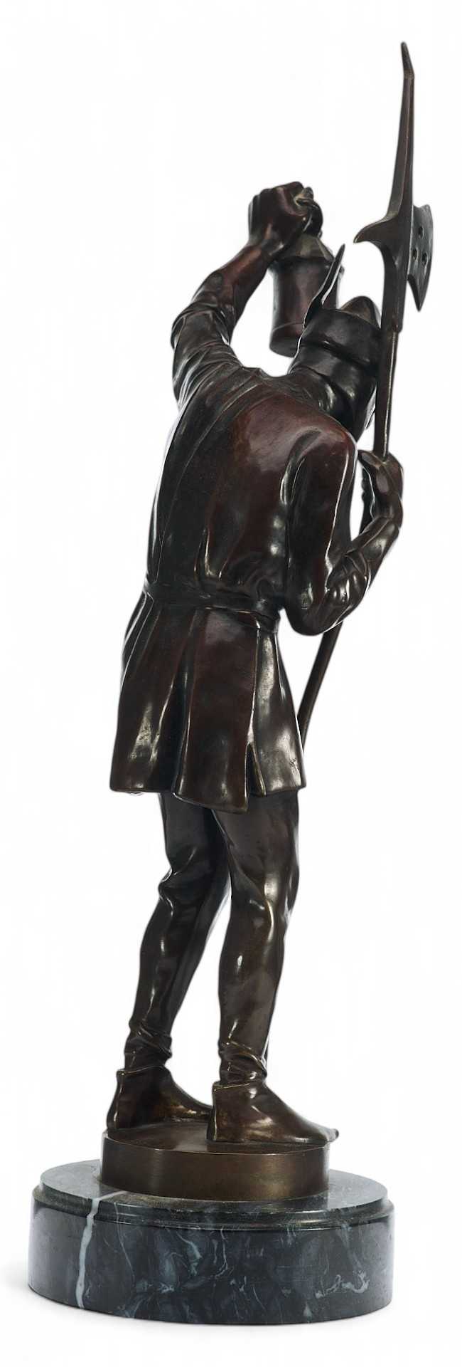 Представлена бронзовая скульптура средневекового стражника с алебардой и фонарем, пытающегося при помощи него что-то видеть во тьме. Скульптура представляет собой типичный пример «бронзовой» пластики первой четверти XX в., довольно