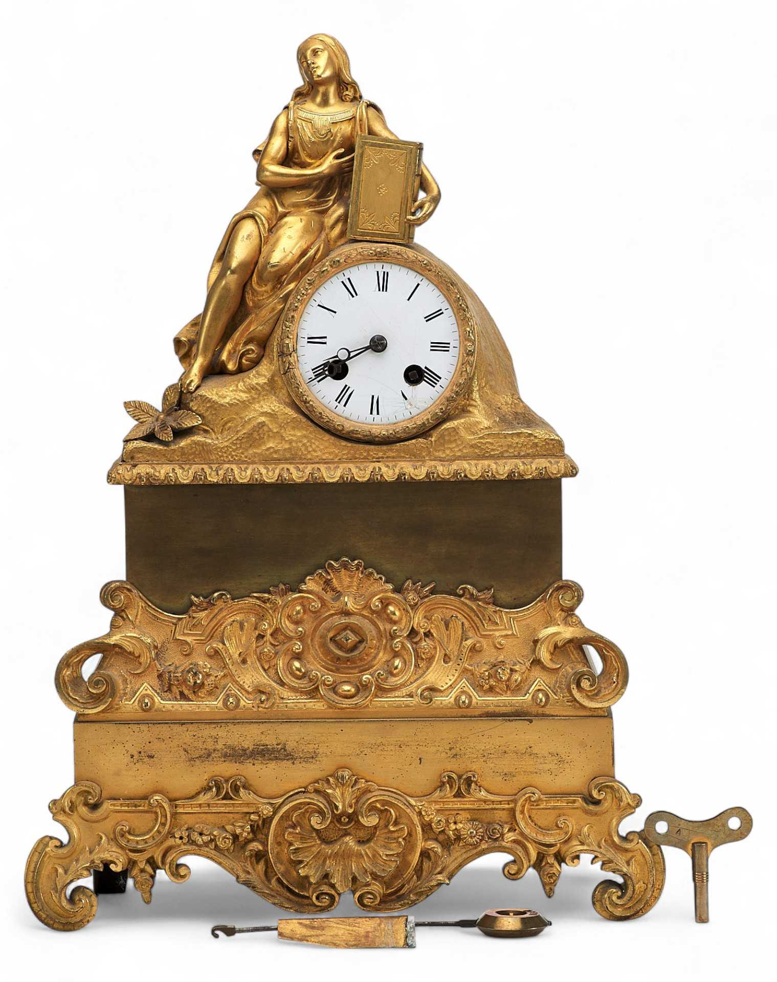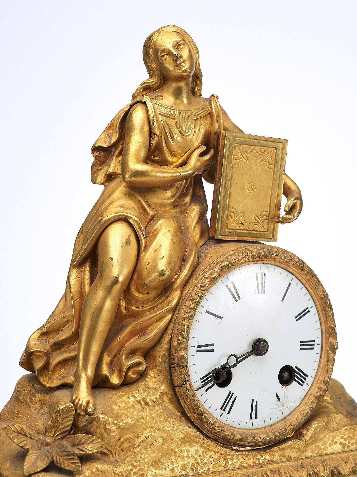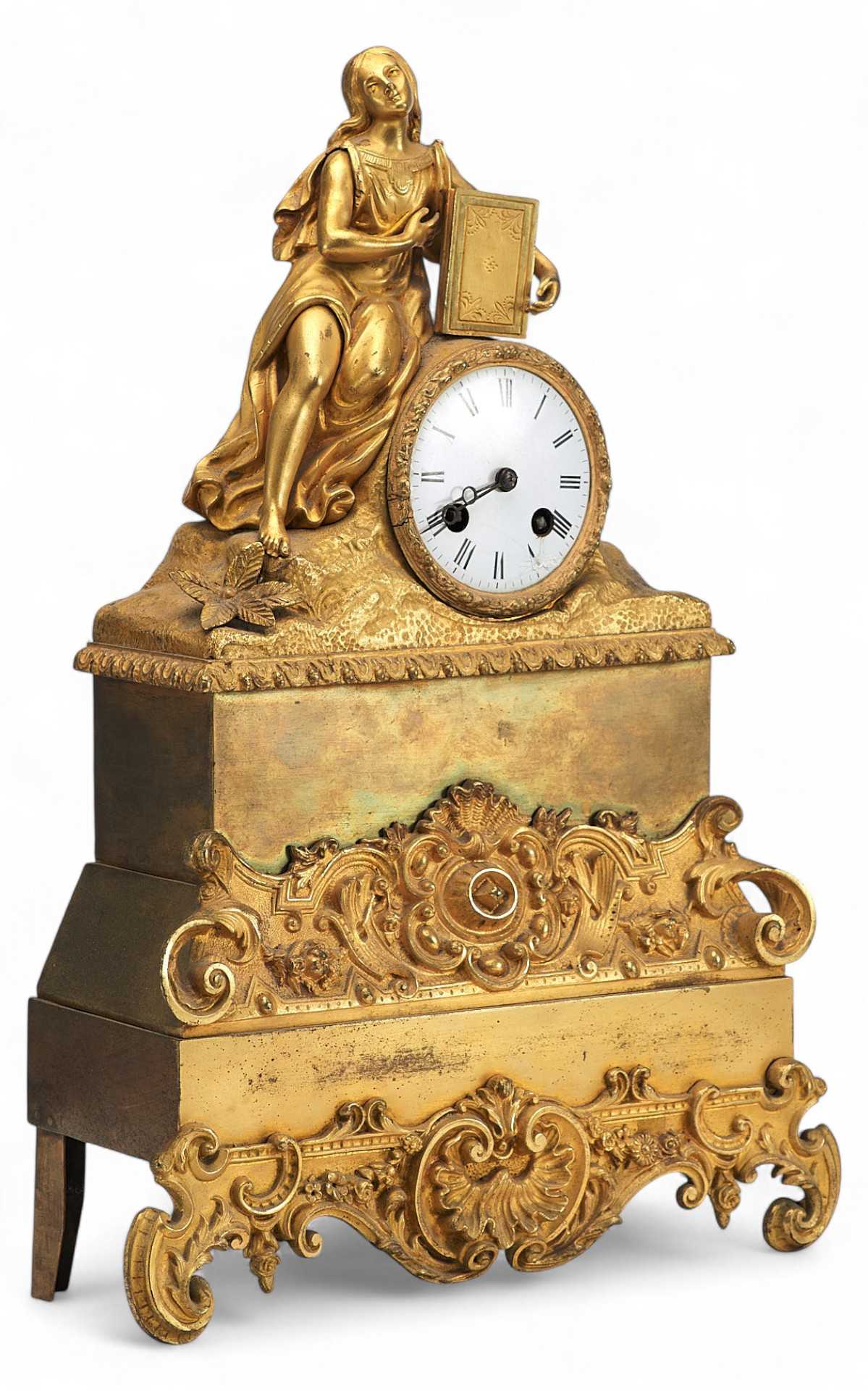 Каминные часы французского производства в стиле псевдобарокко (одна из вариаций стиля «эклектики») украшенные скульптурной фигурой Марии Магдалены (?) с евангелием в руках.