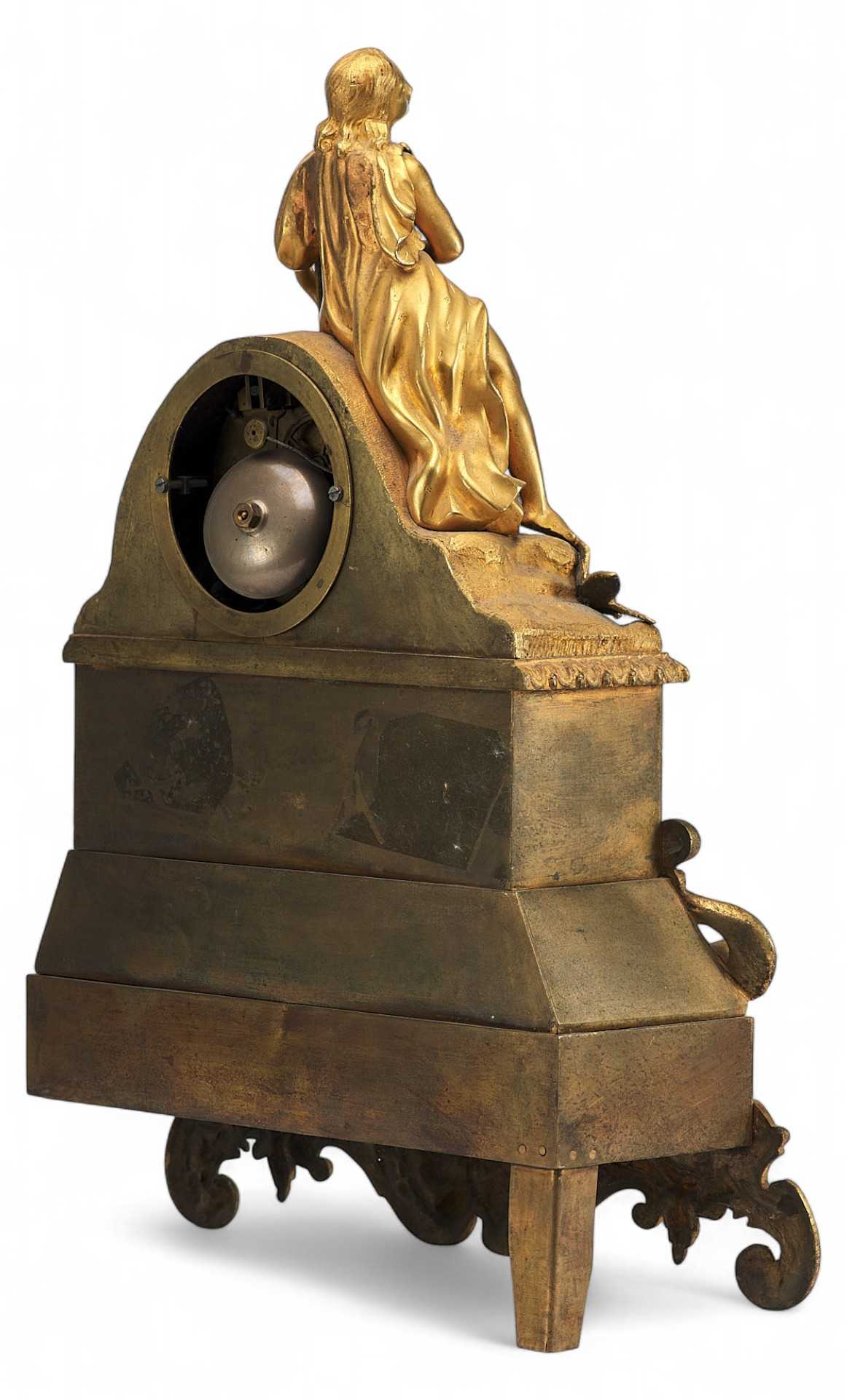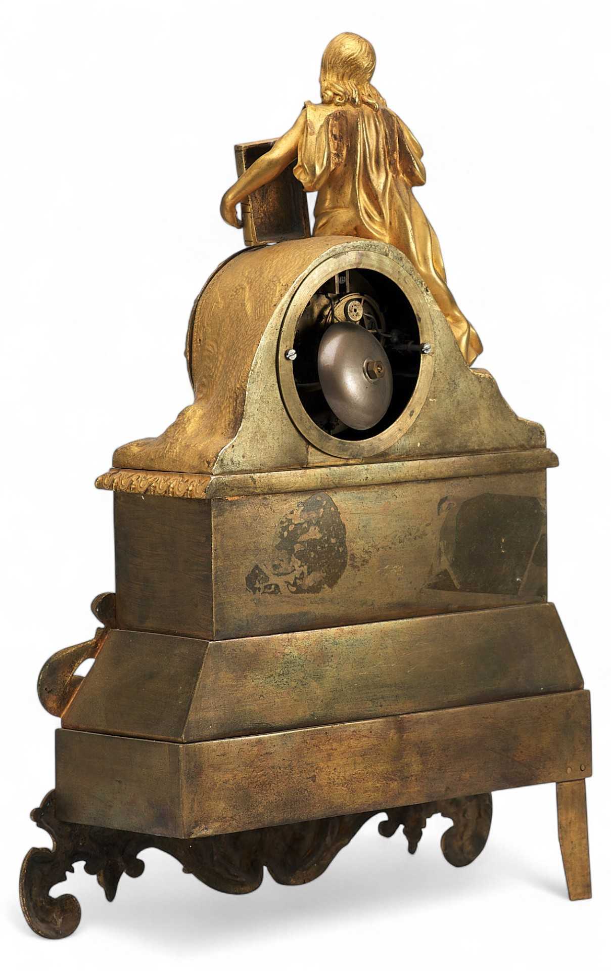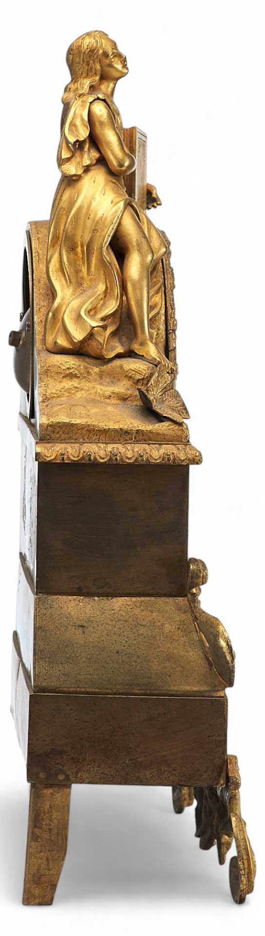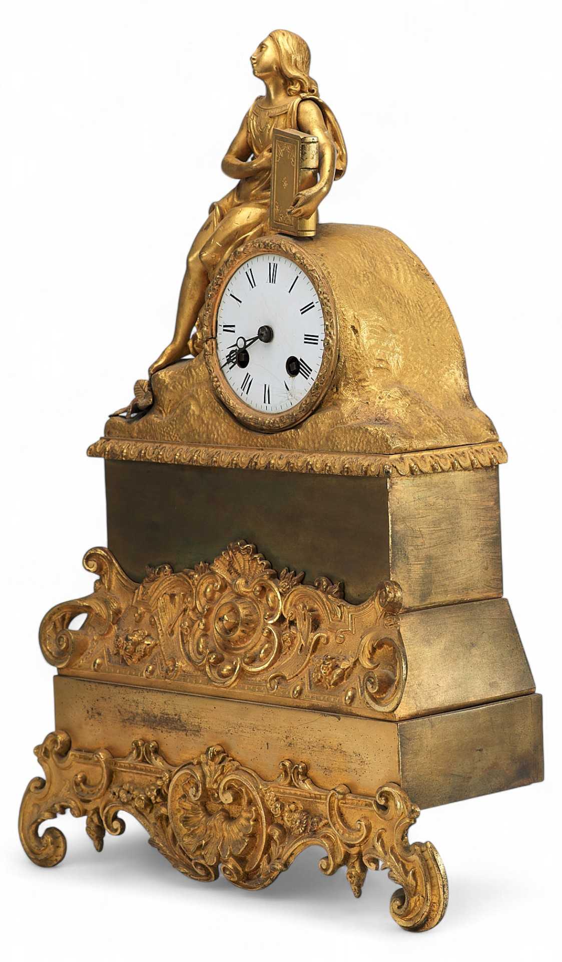 Каминные часы французского производства в стиле псевдобарокко (одна из вариаций стиля «эклектики») украшенные скульптурной фигурой Марии Магдалены (?) с евангелием в руках.