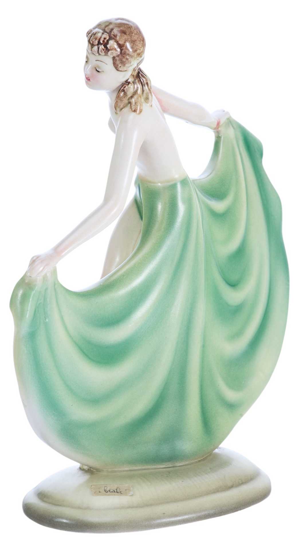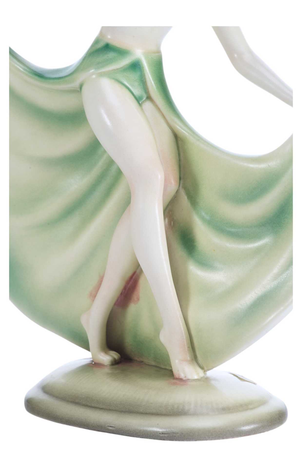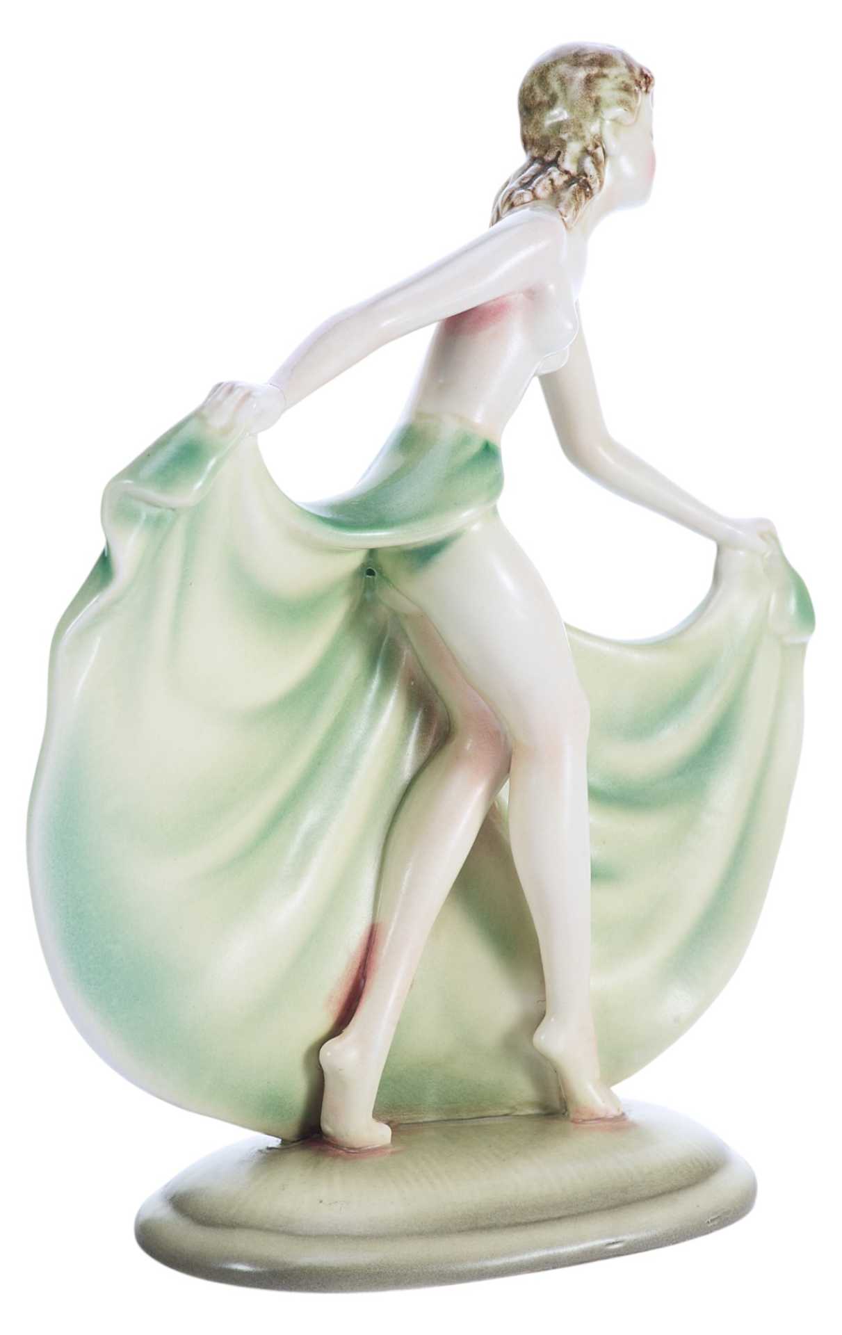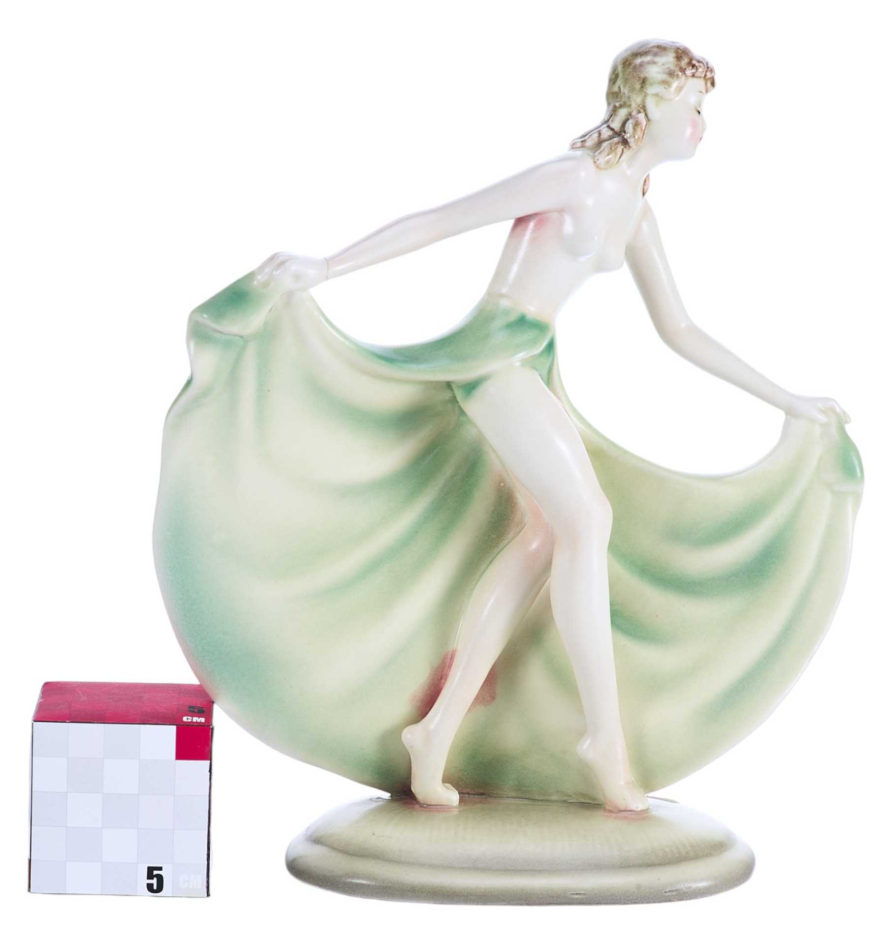 Представлено скульптурное изображение танцующей девушки с обнаженным бюстом, руками танцовщица придерживает подол нежно-зеленой юбки.