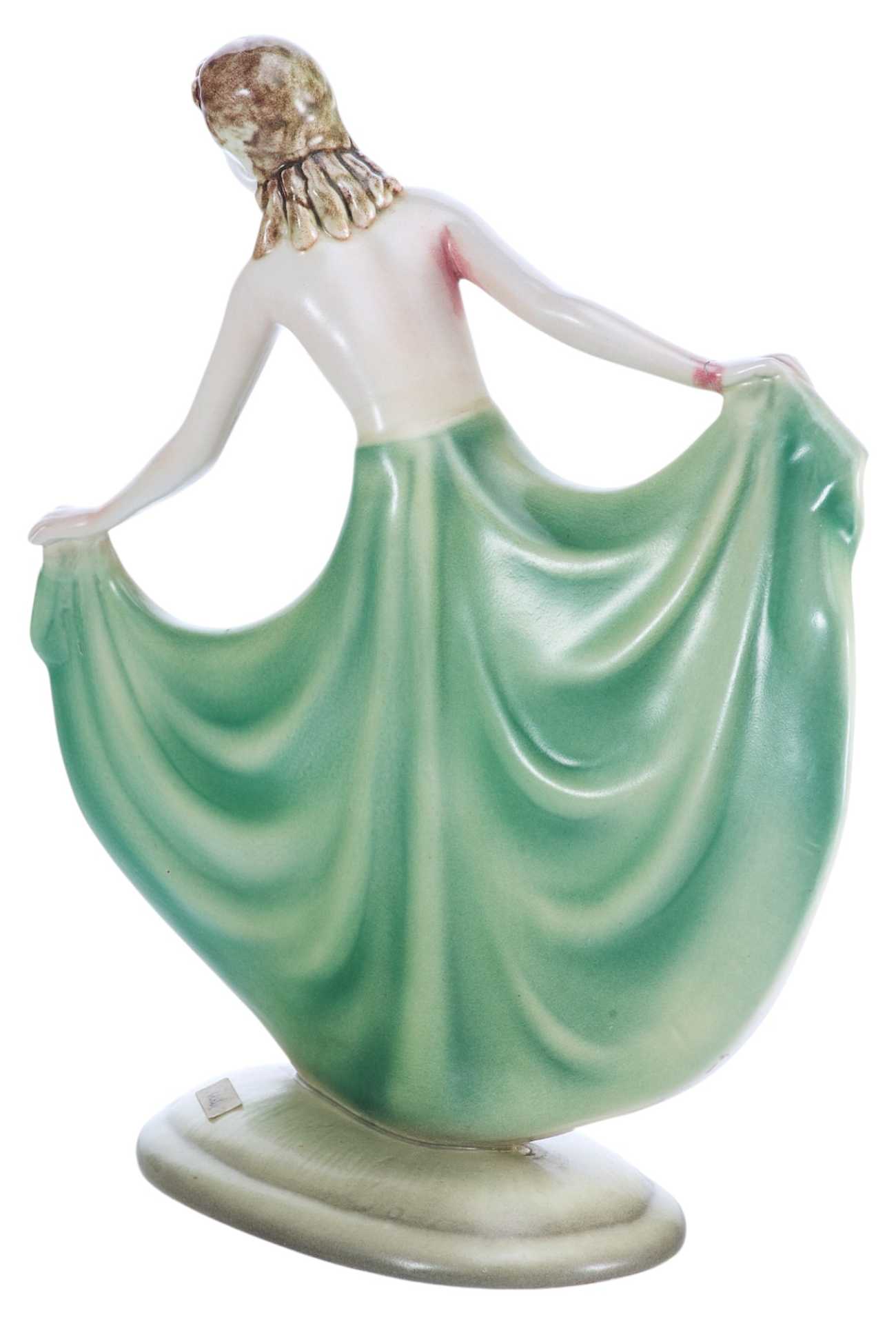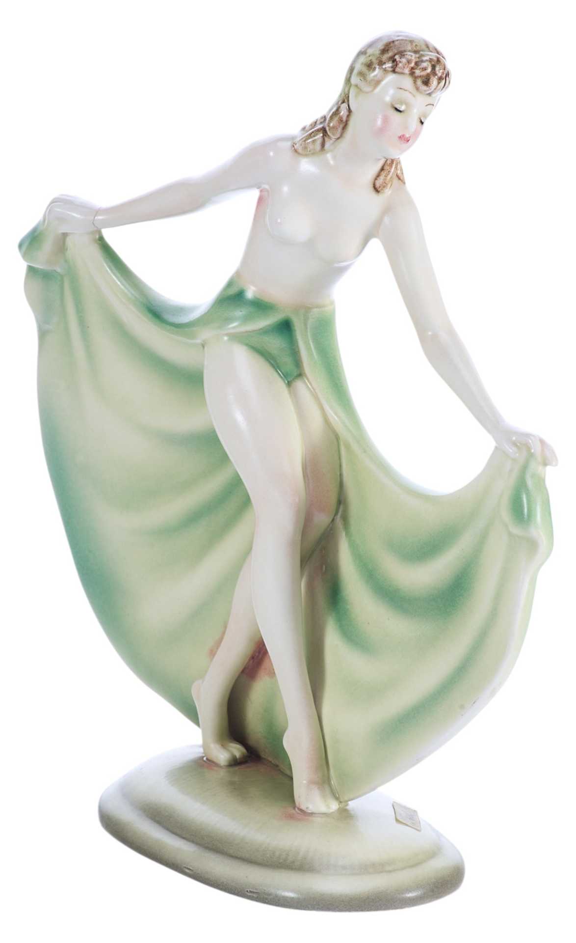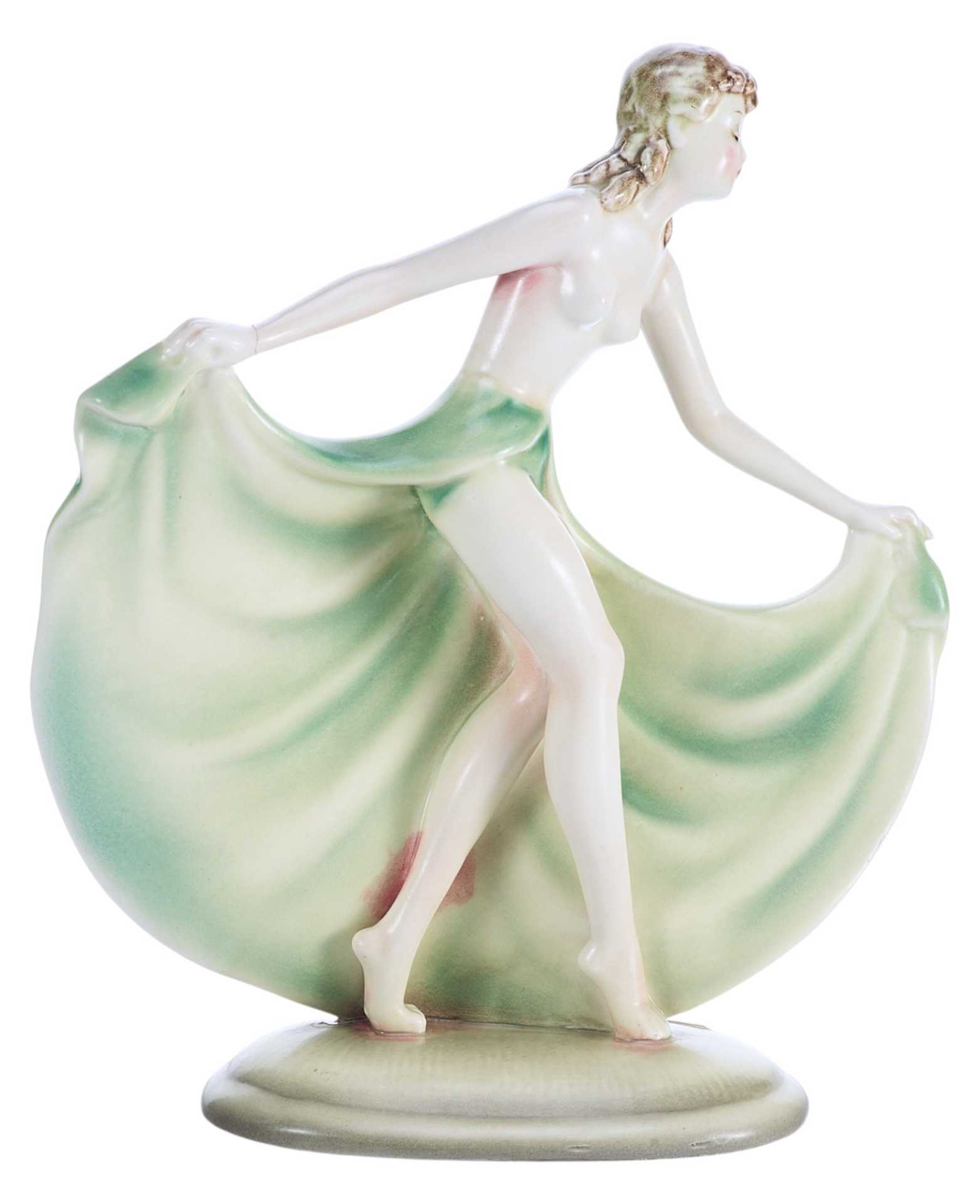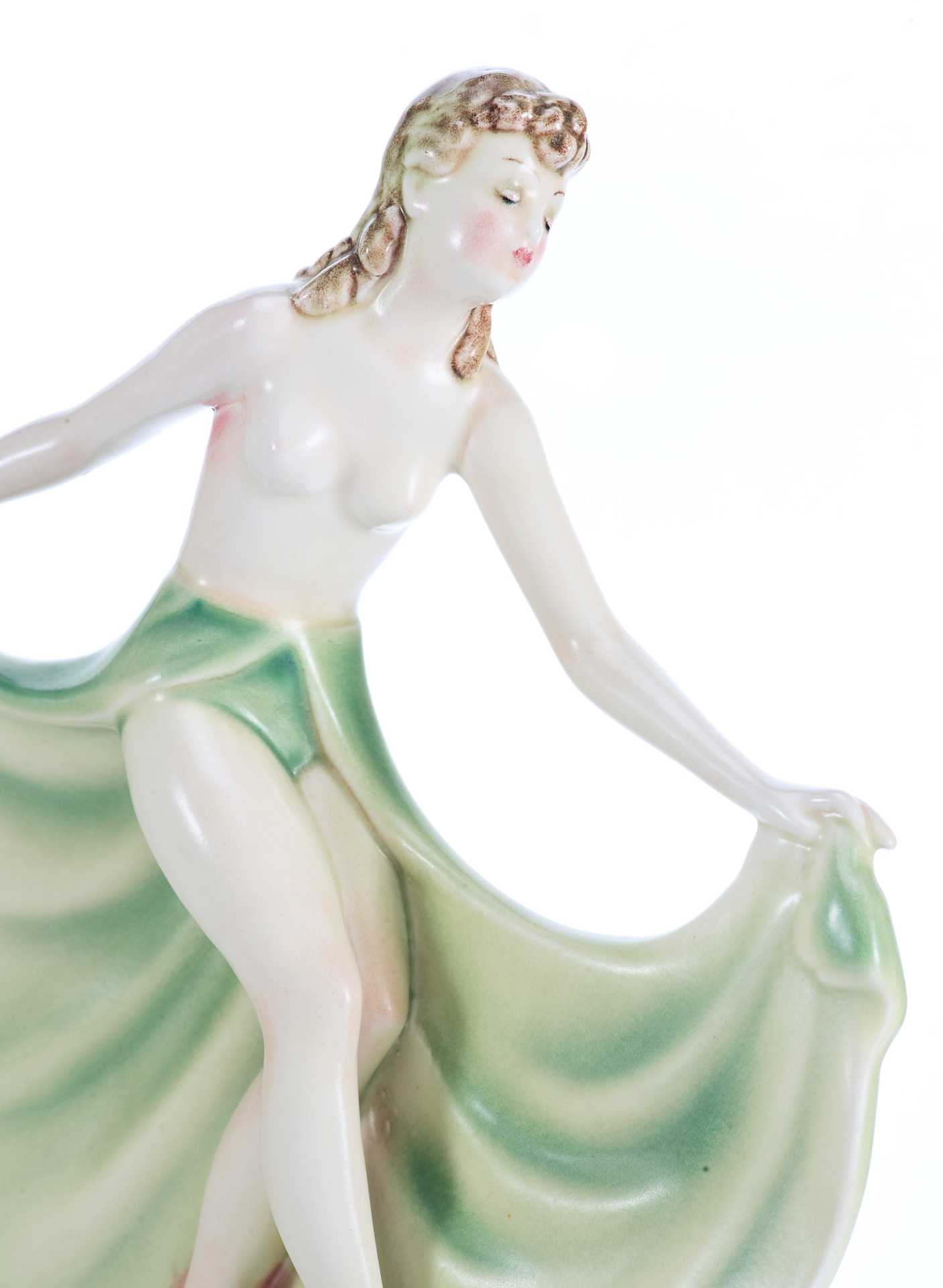 Представлено скульптурное изображение танцующей девушки с обнаженным бюстом, руками танцовщица придерживает подол нежно-зеленой юбки.