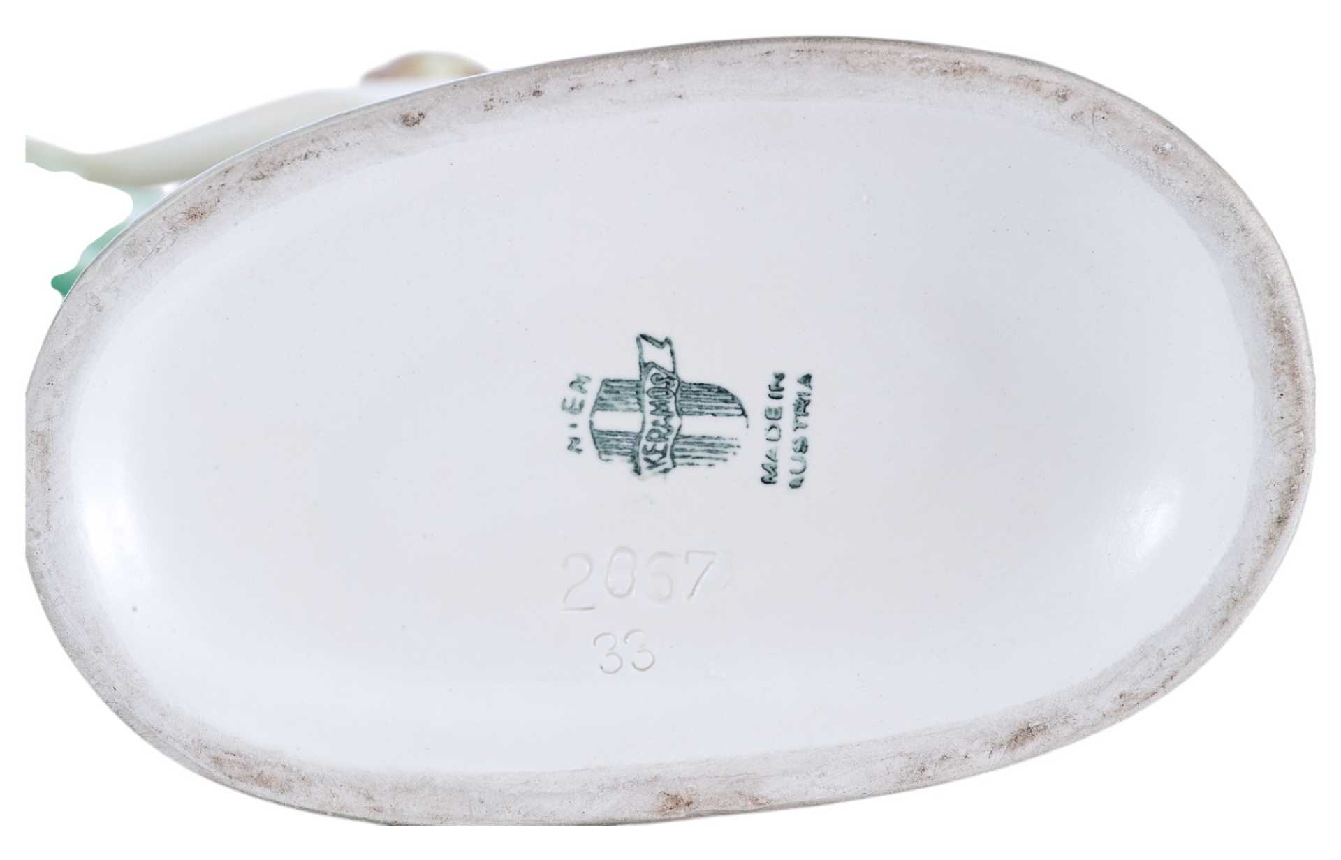 На обороте панно клеймо изготовителя -фарфоровой фабрики «Keramos» (Wiener Kunst-Keramik und Porzellanmanufaktur), ставившееся после 1945 г. «Keramos» (Wiener Kunst-Keramik und Porzellanmanufaktur). Венская фабрика художественной керамики и фарфора была основана в 1910 году несколькими пенсионерами, финансово поддержанными государством.