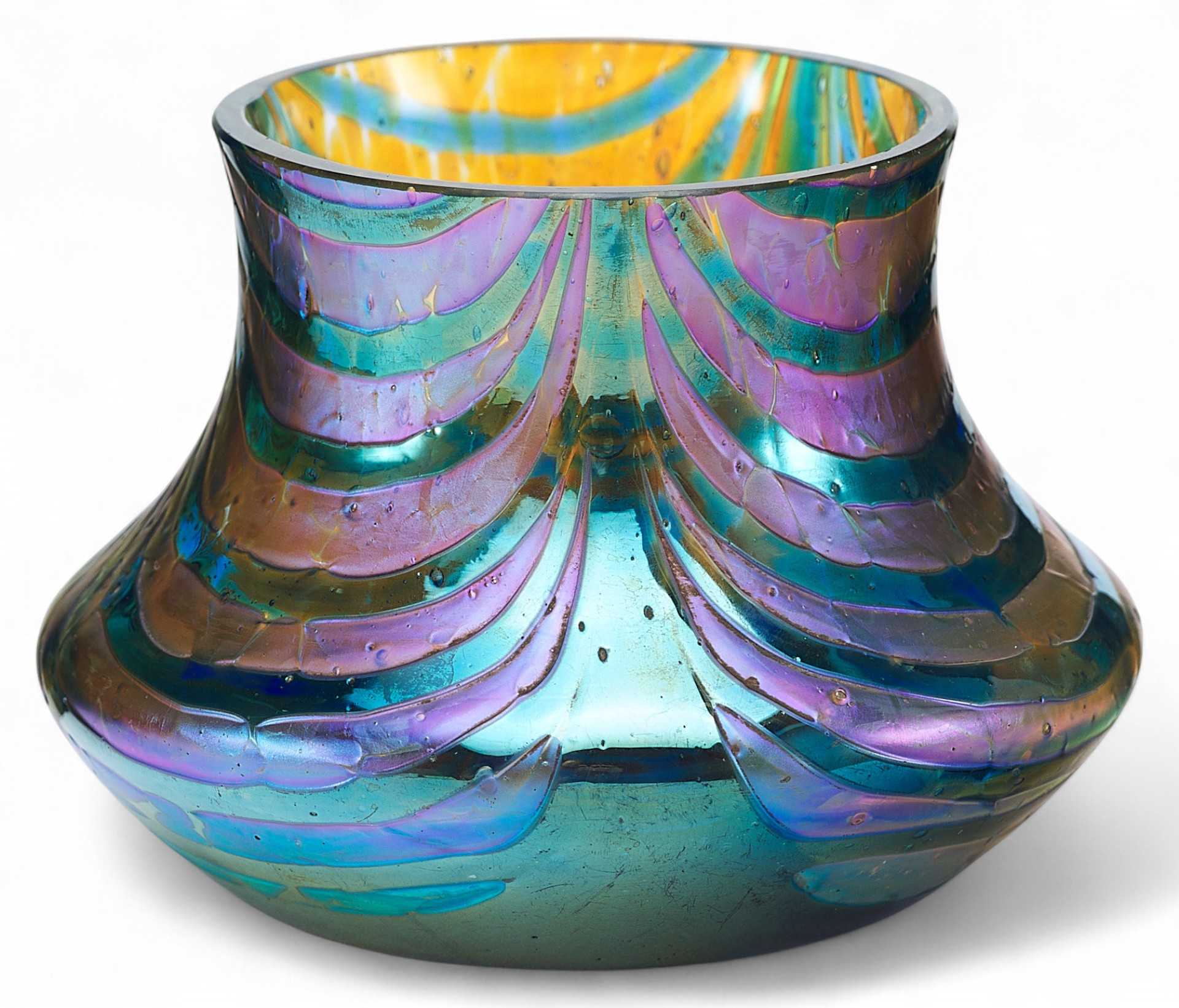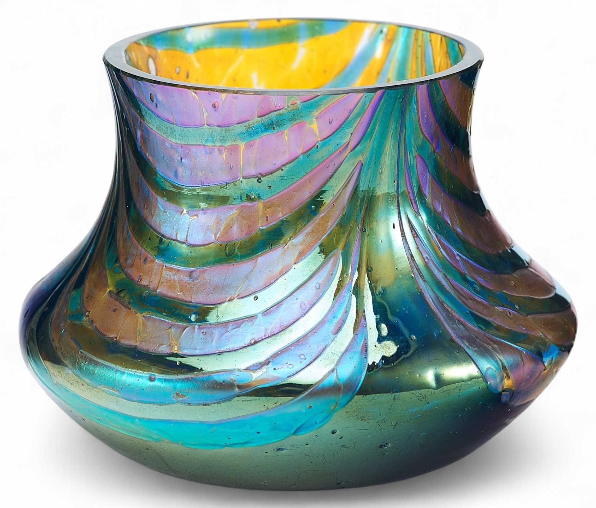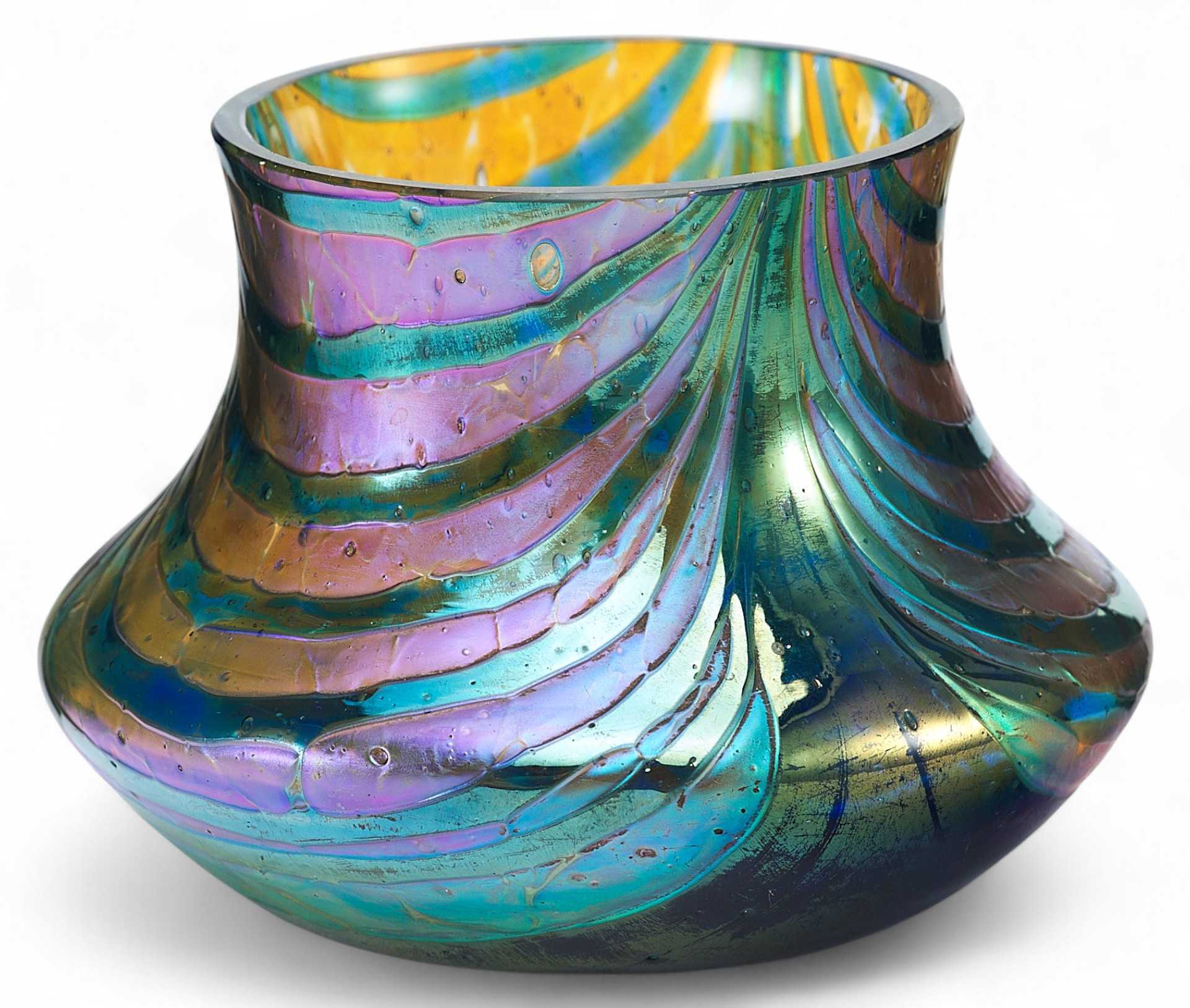 Ваза из двуцветного стекла, украшенная «плывущими» полосами другого цвета. Поверхность вазы ирризирована.