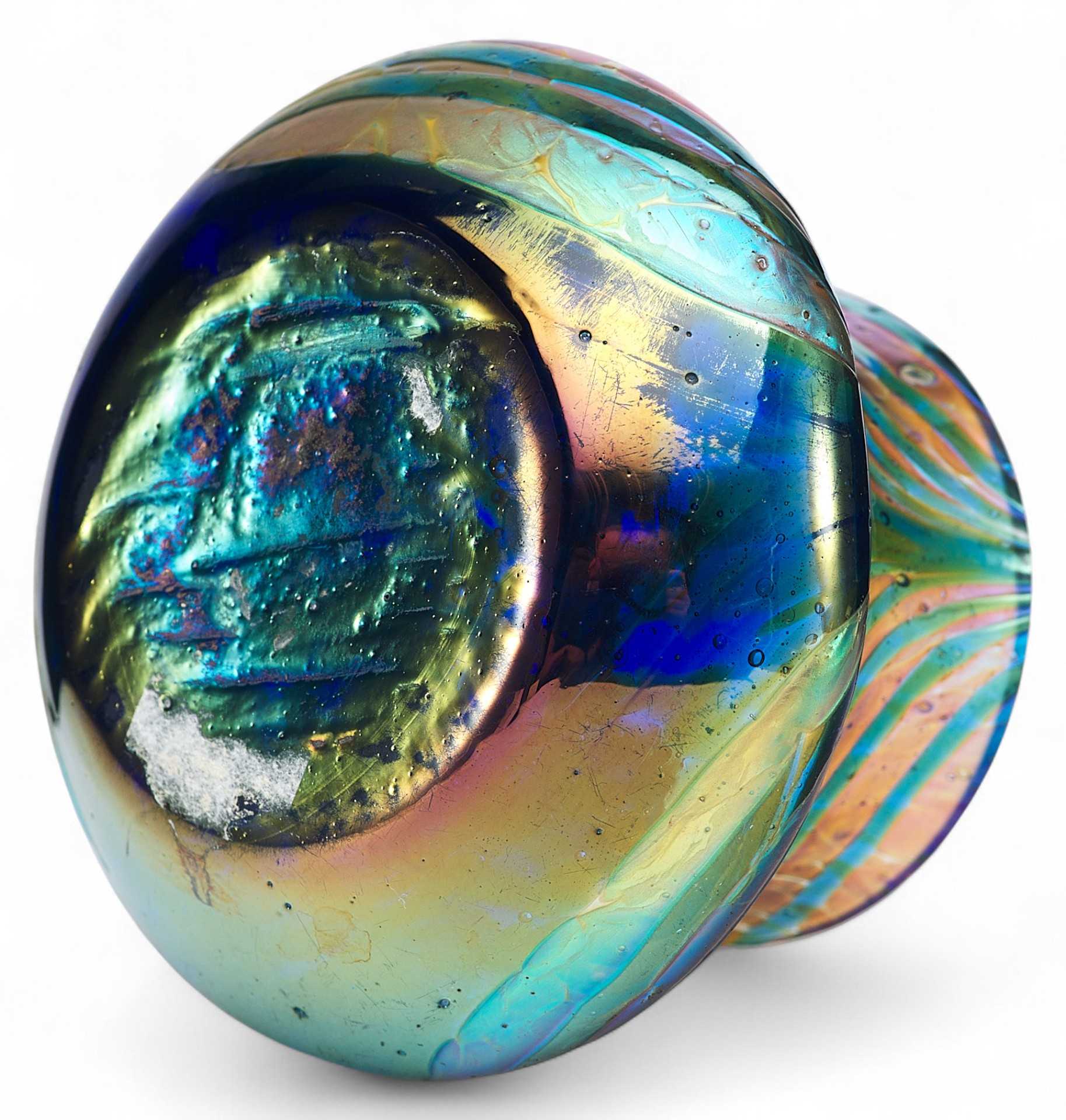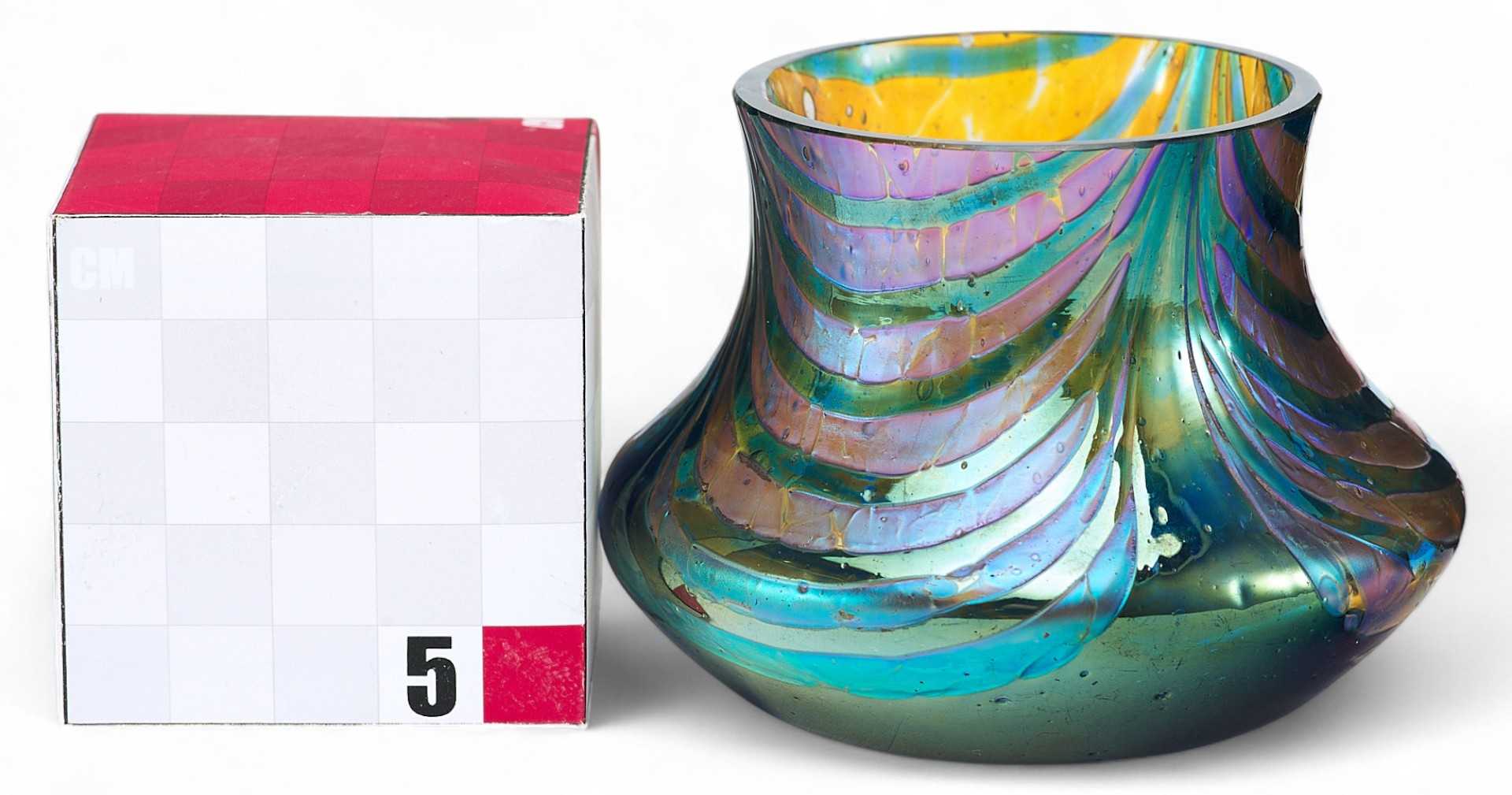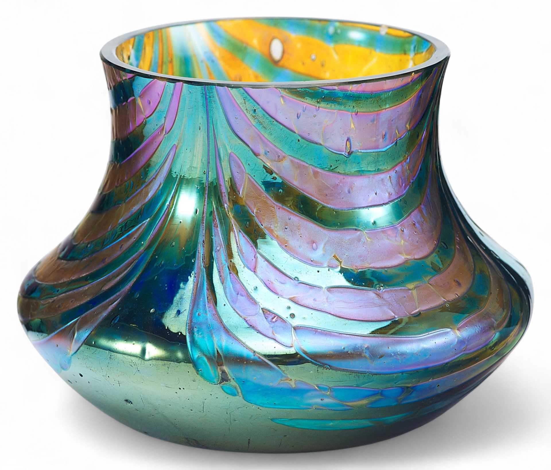 Ваза из двуцветного стекла, украшенная «плывущими» полосами другого цвета. Поверхность вазы ирризирована.