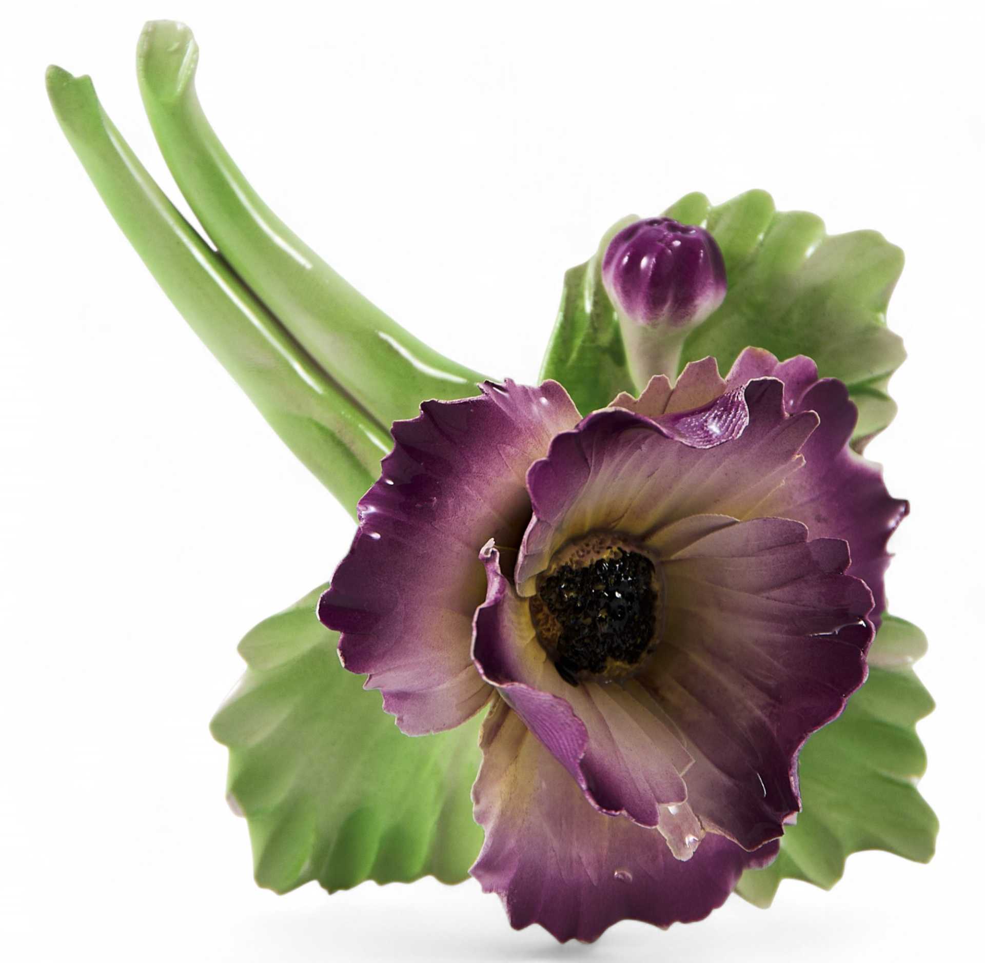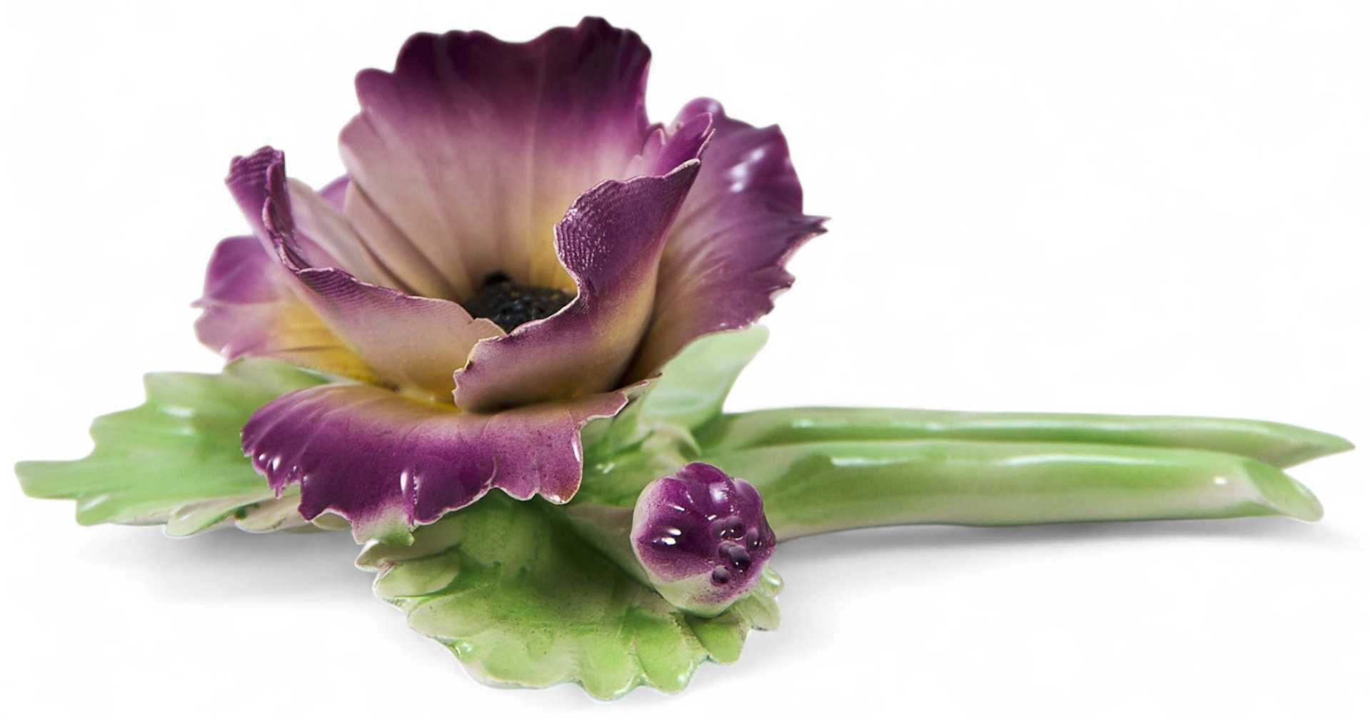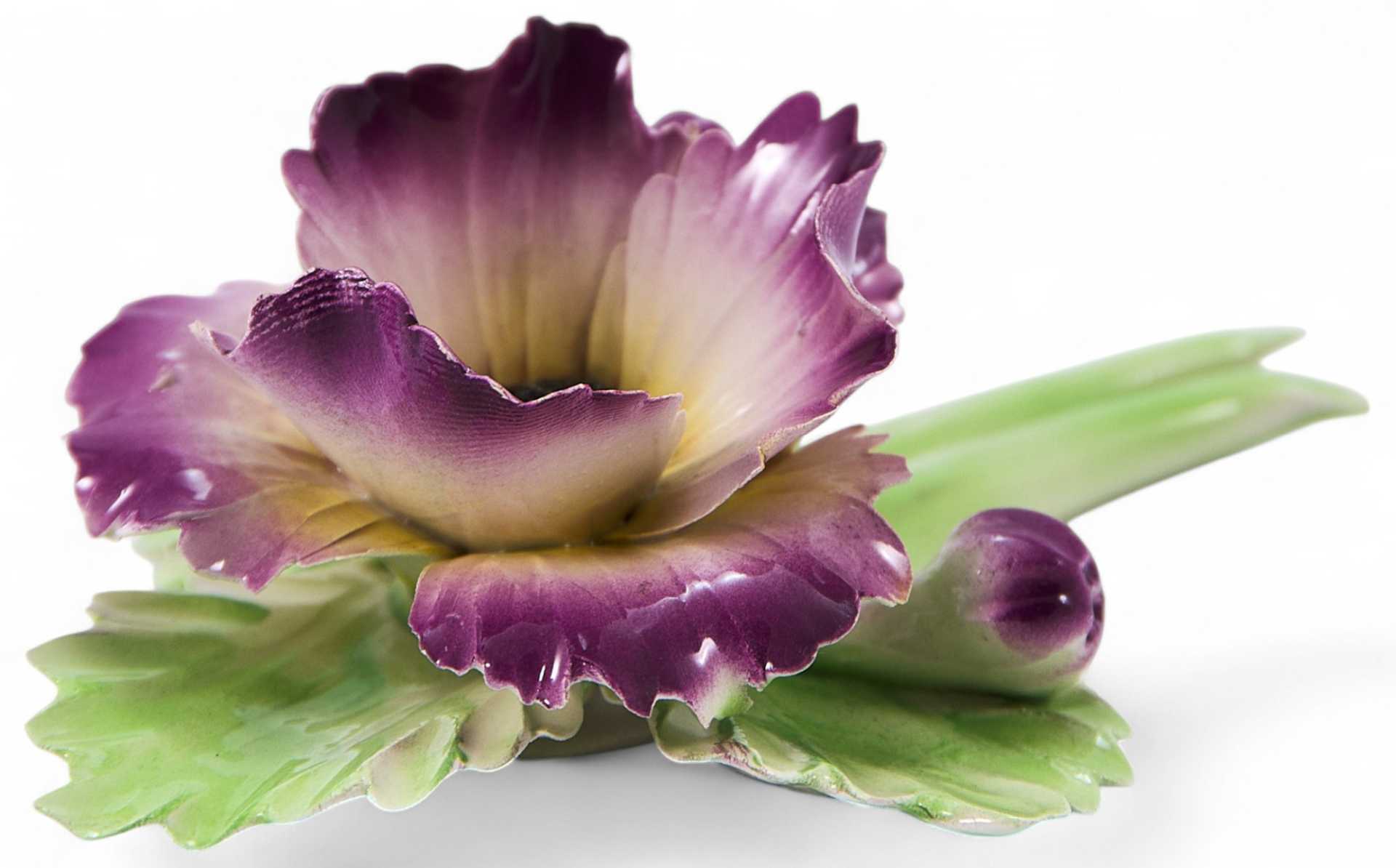 На плоской подставке на фоне листочков салатного цвета со срезанными веточками распустившийся цветок с бутоном. Уцветка неровные, волнистые края лепестков, переходящие от сочнофиолетового цвета к бело-желтому. На основании клеймо: “CAPODIMONTE MADEIN ITALY” Производство итальянского фарфора "Каподимонте” началась с 1743 г. Фабрика