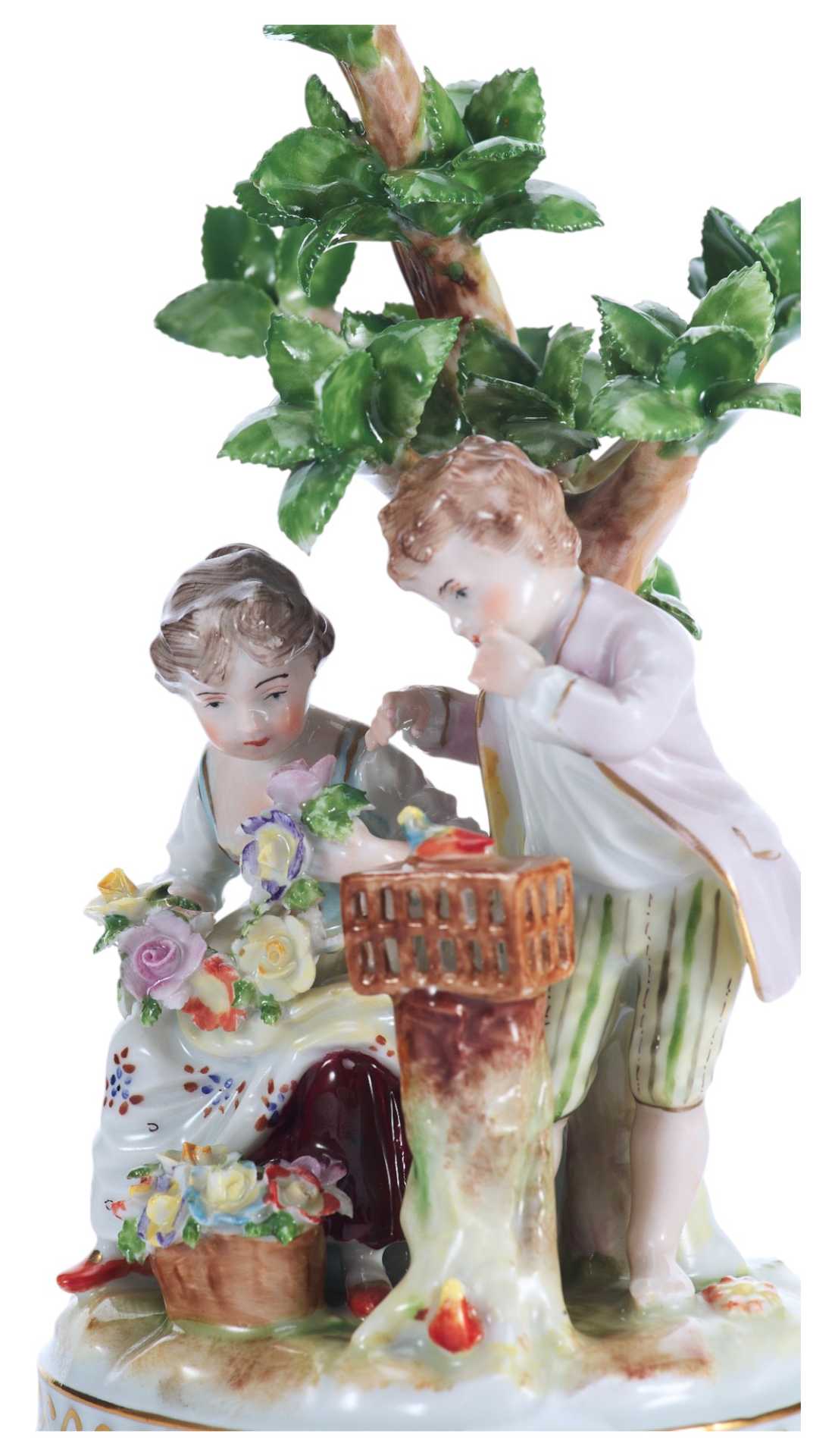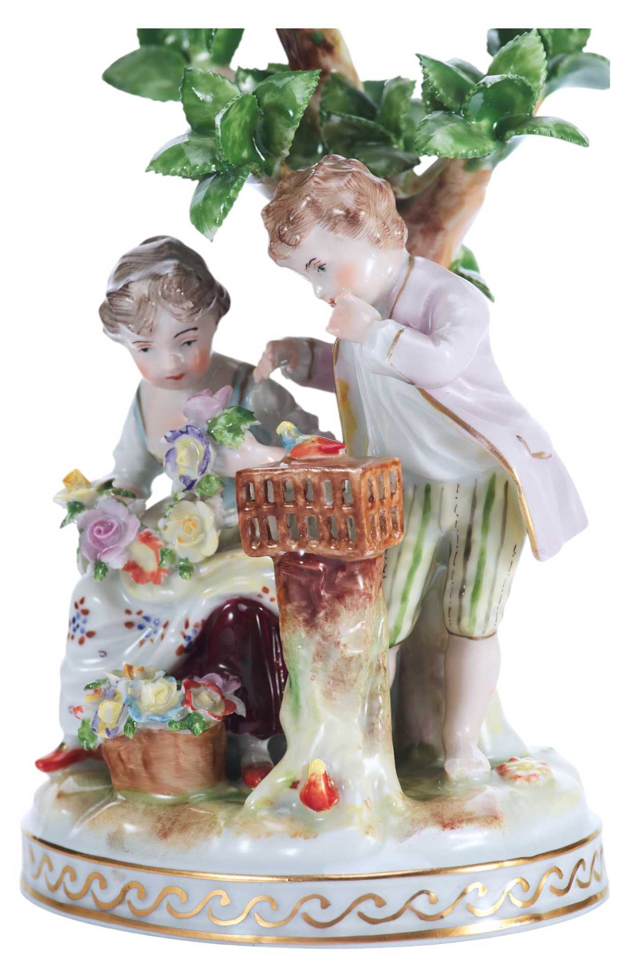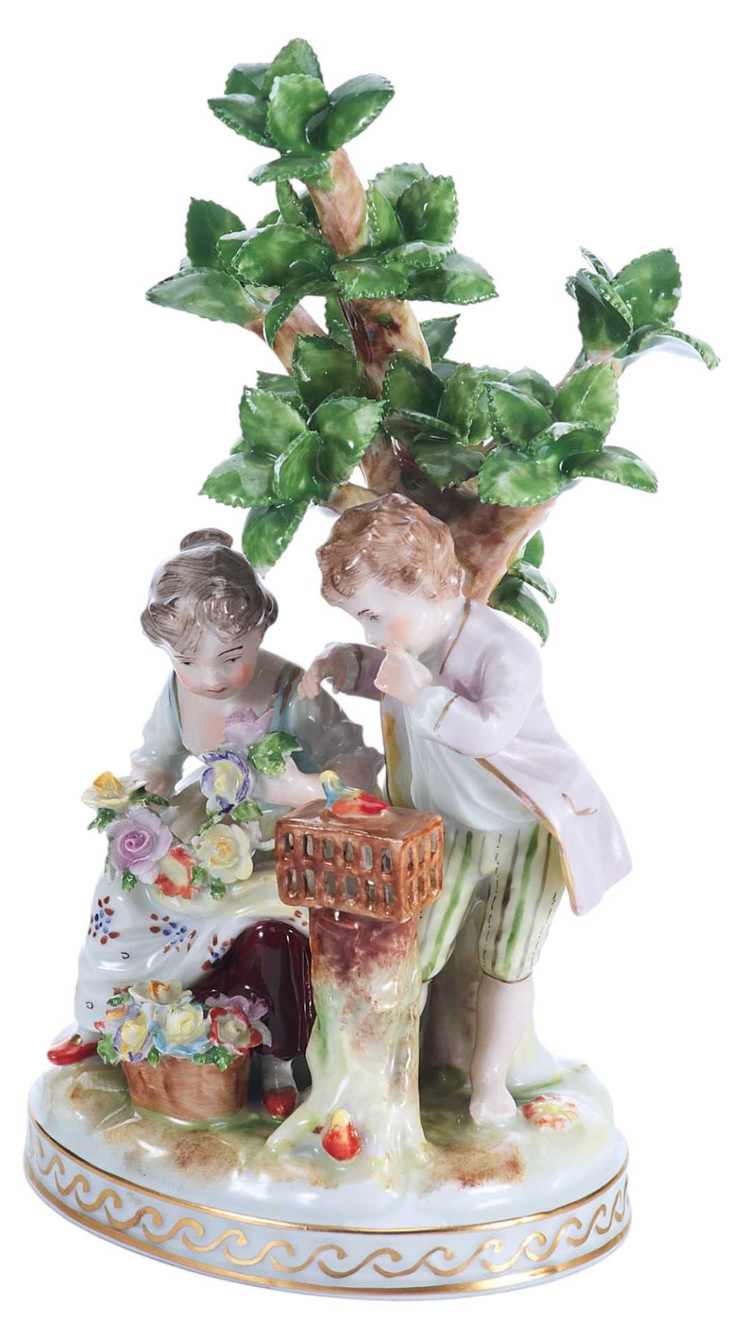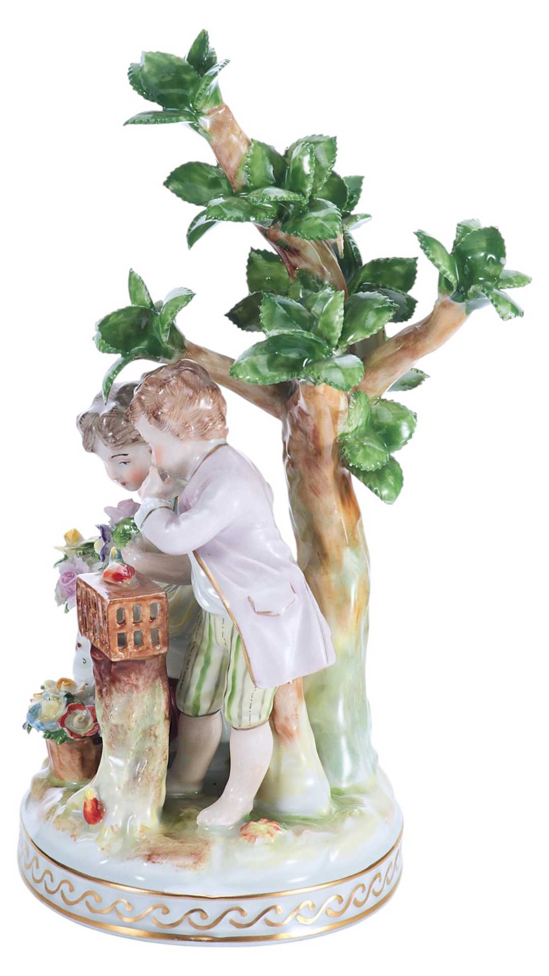 Скульптурная композиция представляет собой изящную пасторальную сцену с участием двух детей — мальчика и девочки — у деревца, символизирующего природу и идиллию. Девочка держит цветочную гирлянду, в то время как мальчик наклоняется к клетке, наблюдая за птицей. Образы исполнены с особой трогательностью, передающей наивность, лиризм и камерность момента. Эта сцена воплощает идеалы мирной деревенской жизни, воспеваемые в жанре пасторали, популярном в декоративно-прикладном искусстве Европы рубежа XIX–XX веков.