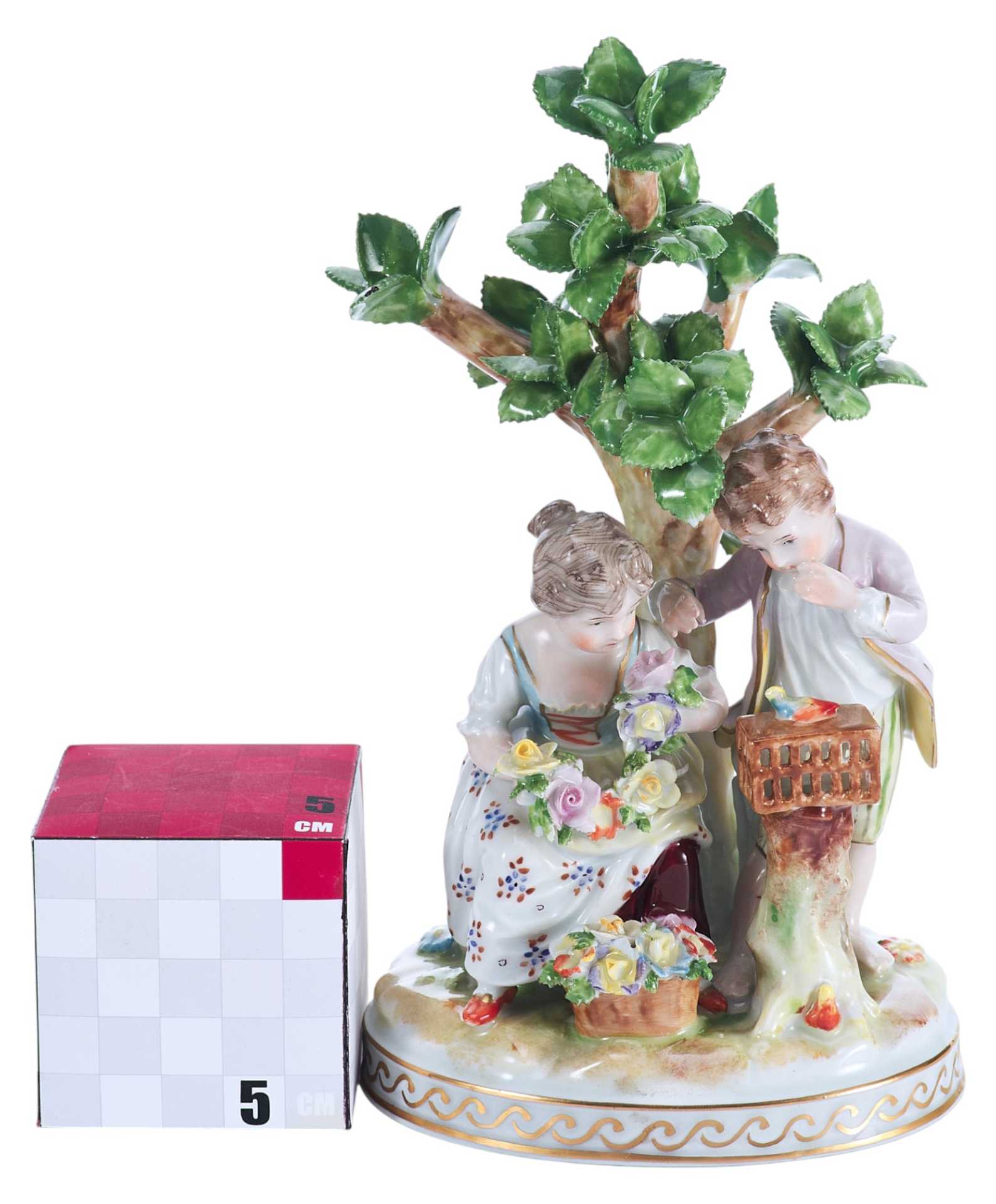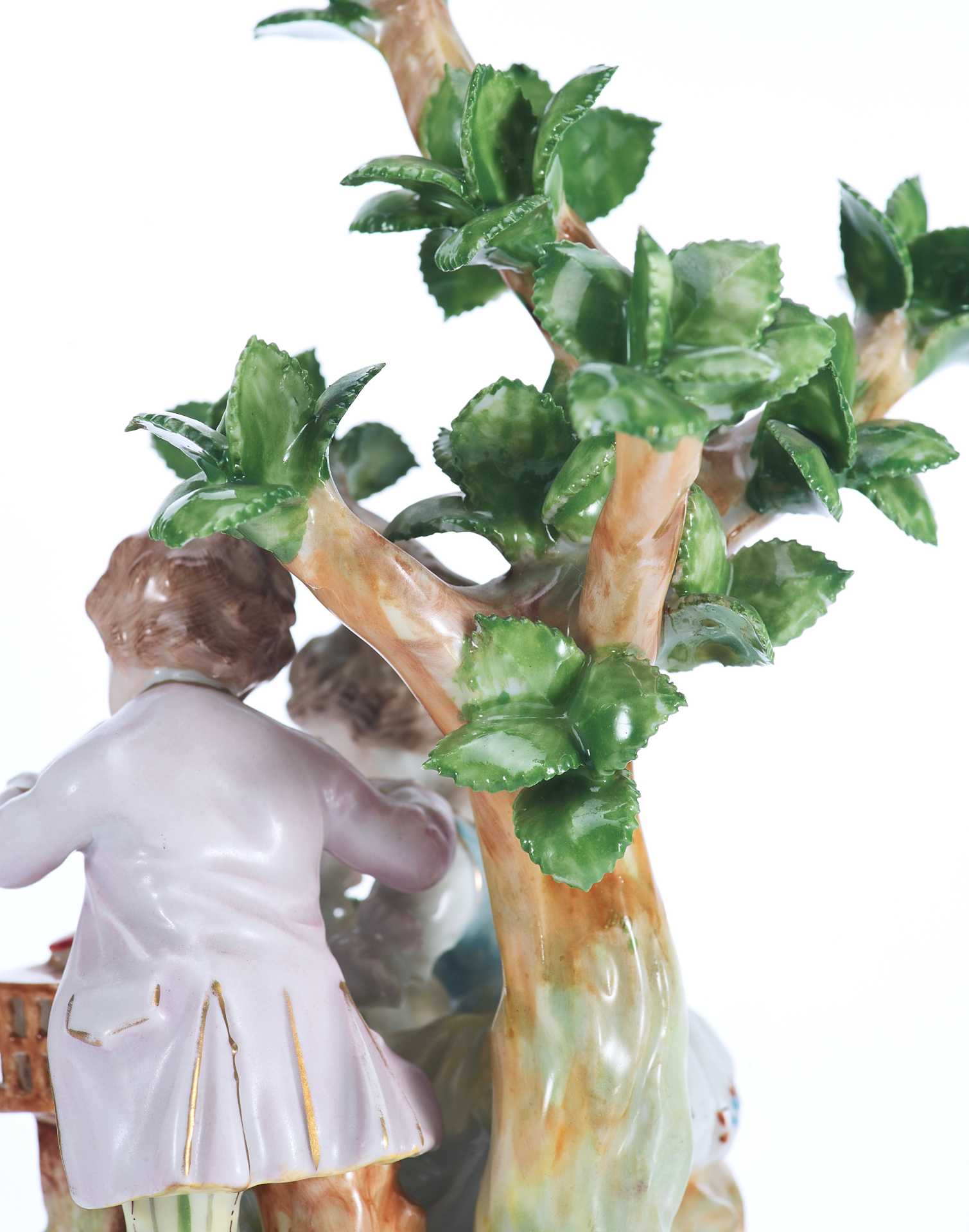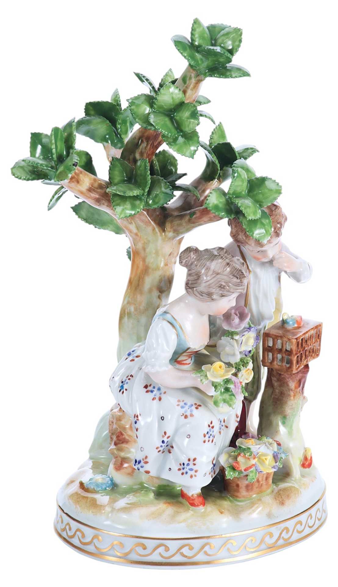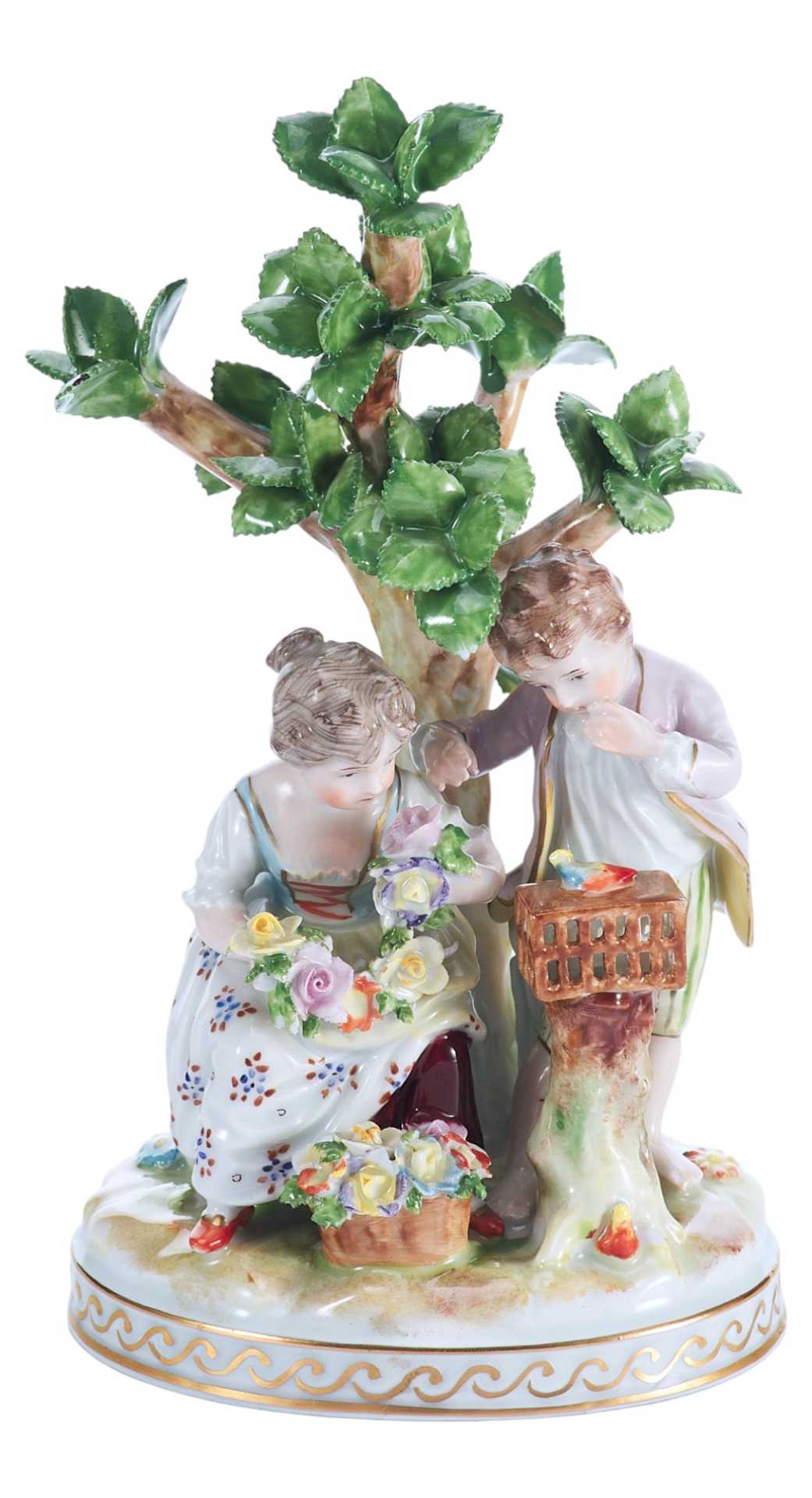 Скульптурная композиция представляет собой изящную пасторальную сцену с участием двух детей — мальчика и девочки — у деревца, символизирующего природу и идиллию. Девочка держит цветочную гирлянду, в то время как мальчик наклоняется к клетке, наблюдая за птицей. Образы исполнены с особой трогательностью, передающей наивность, лиризм и камерность момента. Эта сцена воплощает идеалы мирной деревенской жизни, воспеваемые в жанре пасторали, популярном в декоративно-прикладном искусстве Европы рубежа XIX–XX веков.