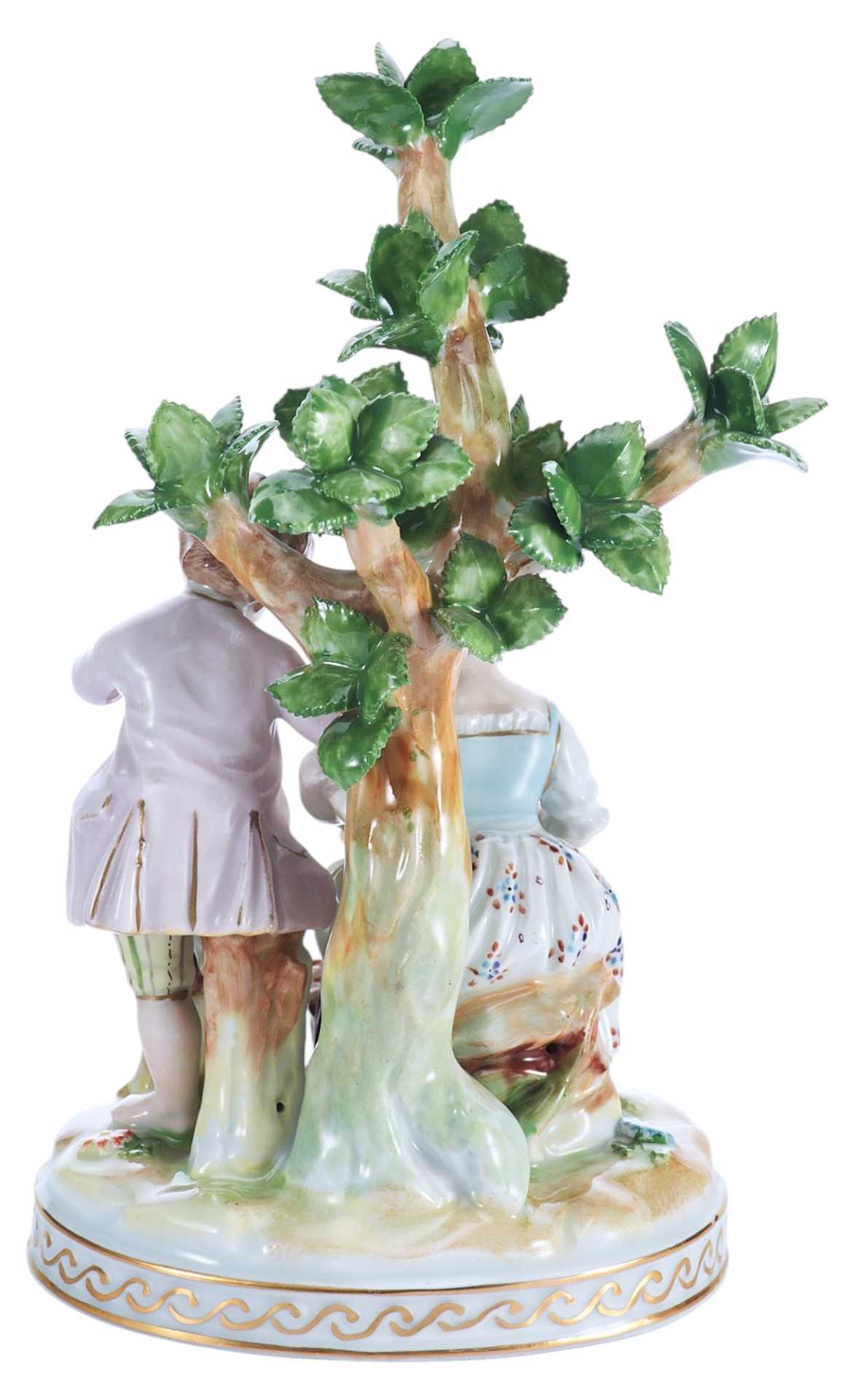 Композиция выполнена из фарфора, традиционного материала для подобных скульптур, особенно в немецкой школе. Применены такие техники, как литьё, лепка, надглазурная полихромная роспись и золочение. Подобное сочетание подчёркивает художественный уровень изделия и даёт возможность детально проработать мимику, складки одежды и мелкие элементы, включая цветы, листья и аксессуары. Высота фигуры — 18 см, что характерно для интерьерной декоративной пластики.
